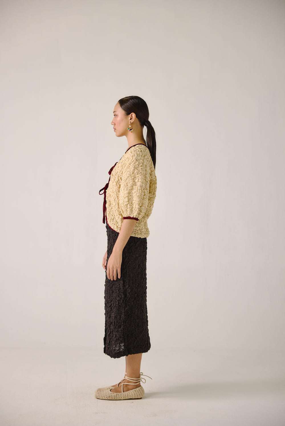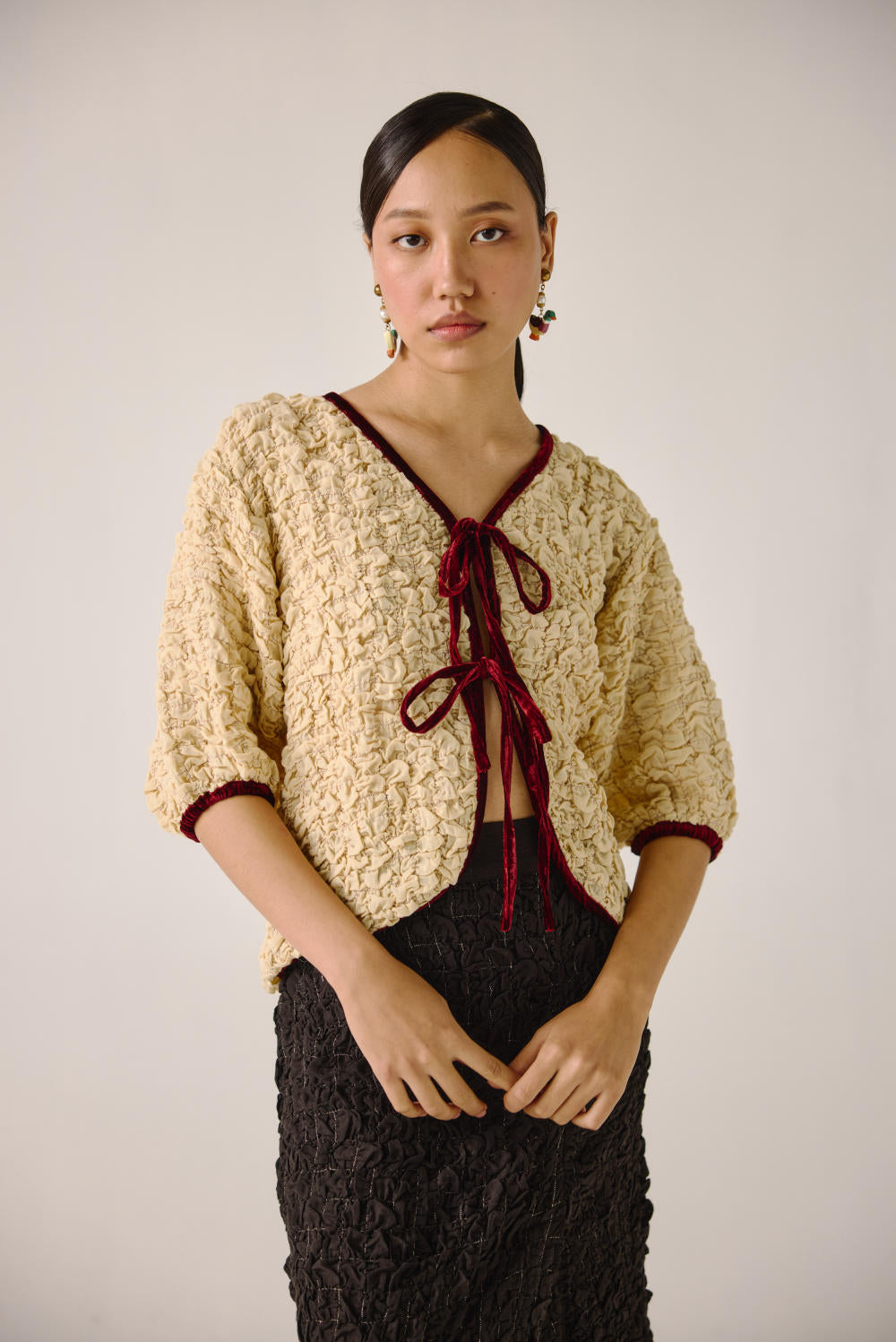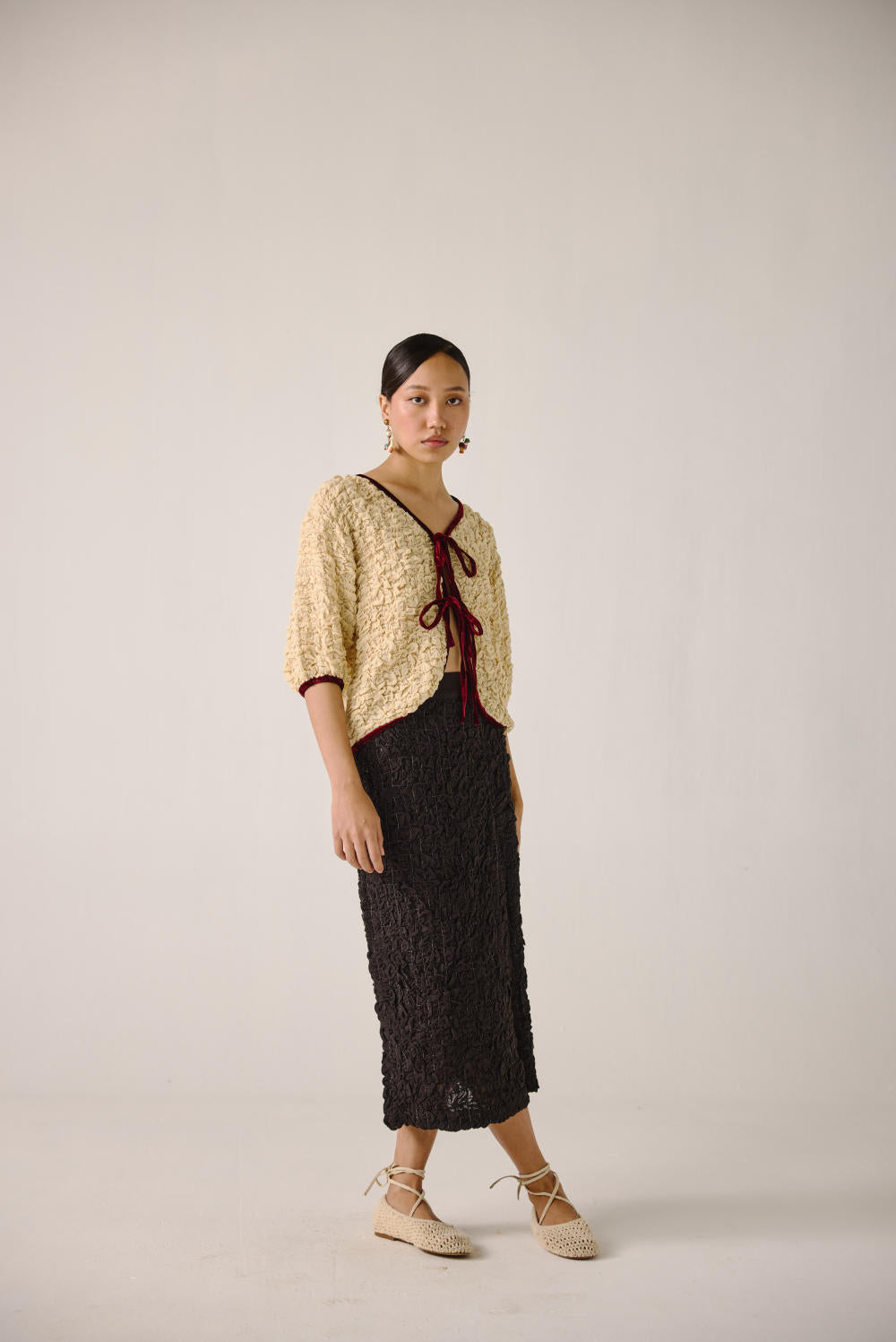 The Ruffled Set, crafted from elasticated smocking, features a ruffled top with front tie strings, contrast piping, and elbow-length sleeves. Paired with the Bert skirt, designed with waist darts and a front slit, this chic calf-length skirt blends comfort with effortless elegance.