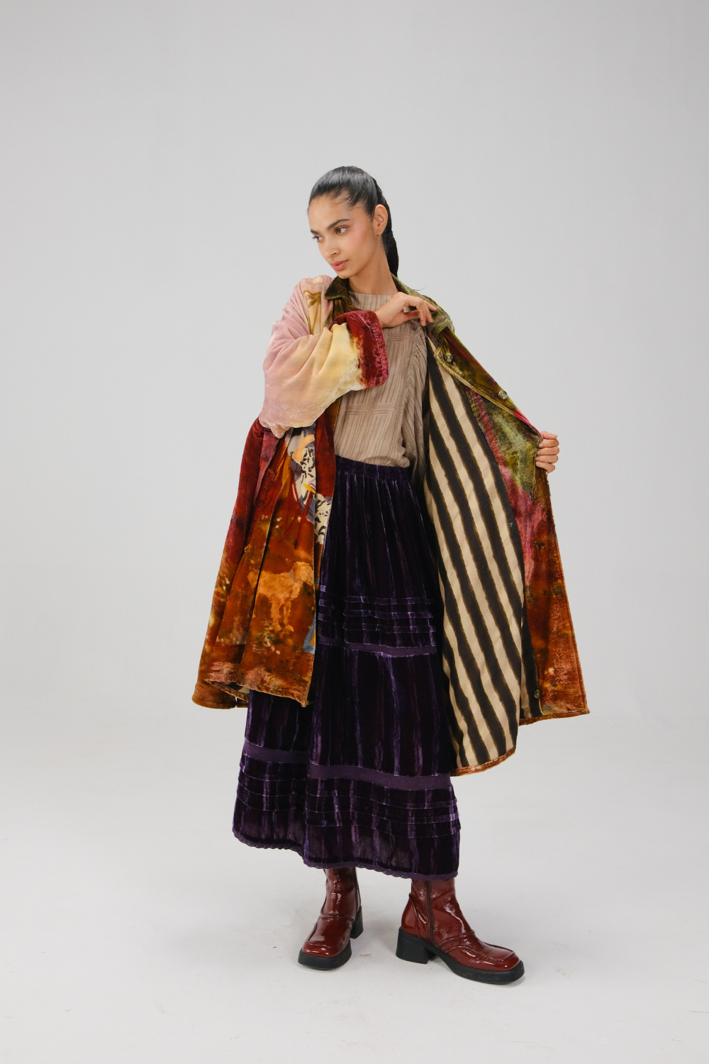 CORD blurs the line between art and attire in a way few labels dare to. Here, fabrics become canvases; illustrations—drawn by hand, steeped in imagination—flow across silhouettes that feel sculptural yet deeply wearable. Each piece has a texture of memory to it, as if it carries echoes of a past life, now reframed for a contemporary world.