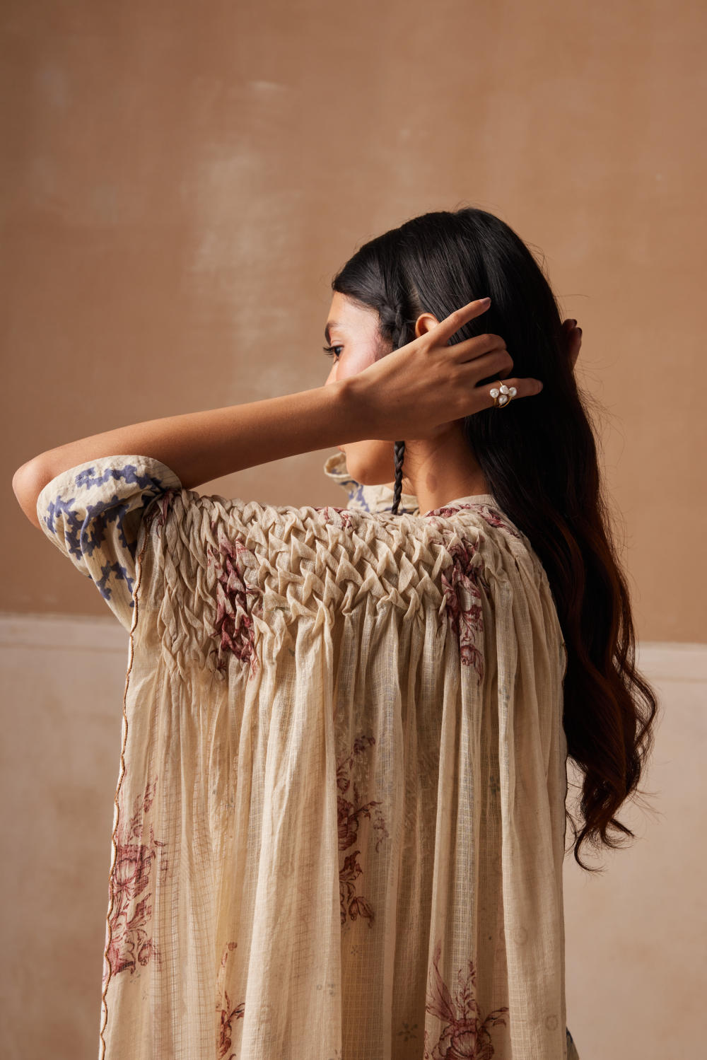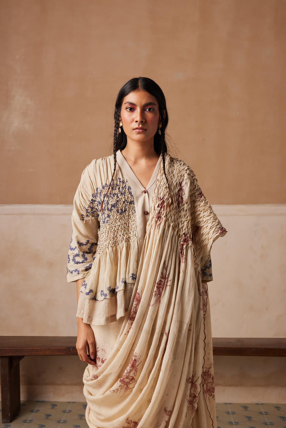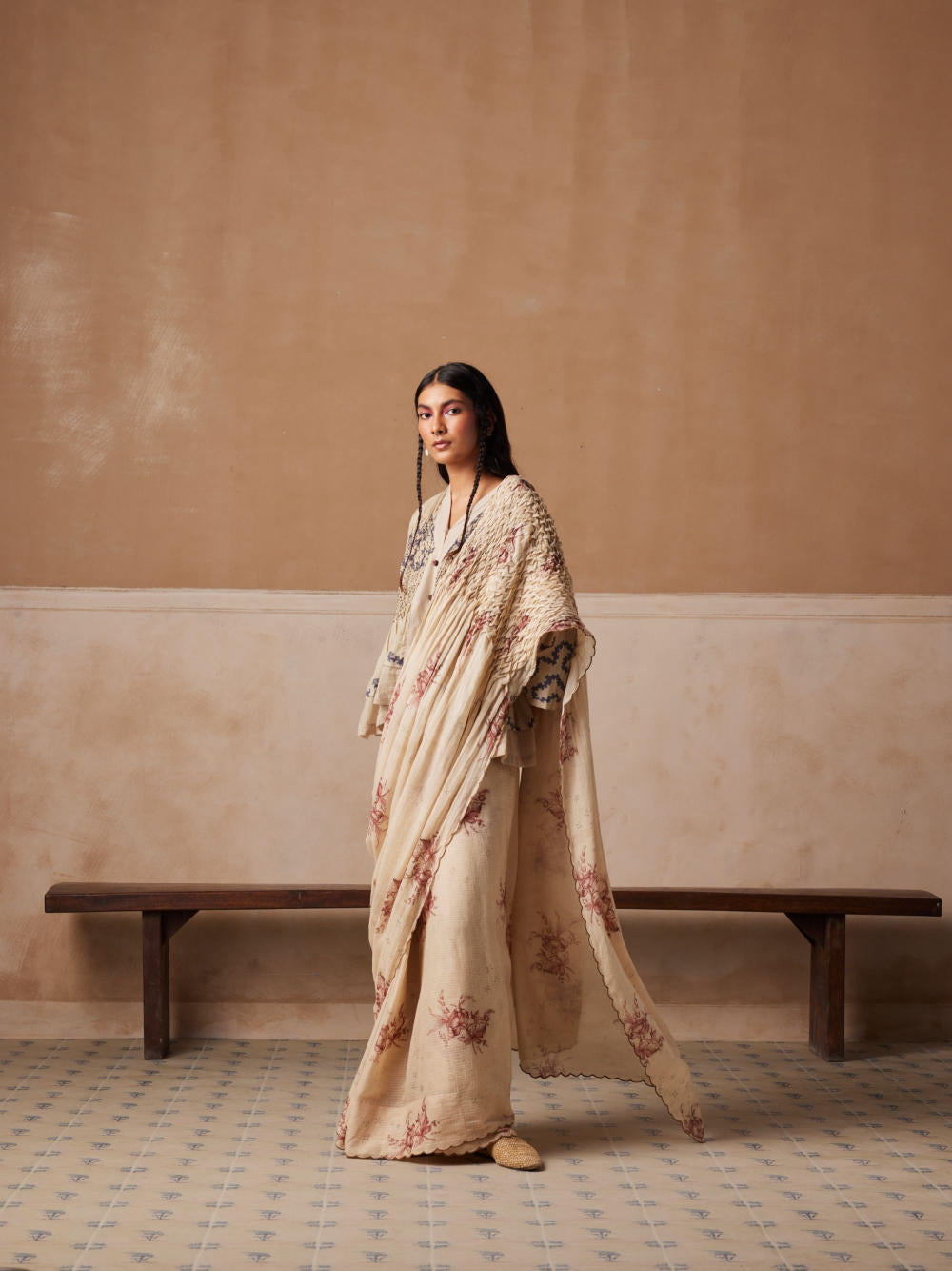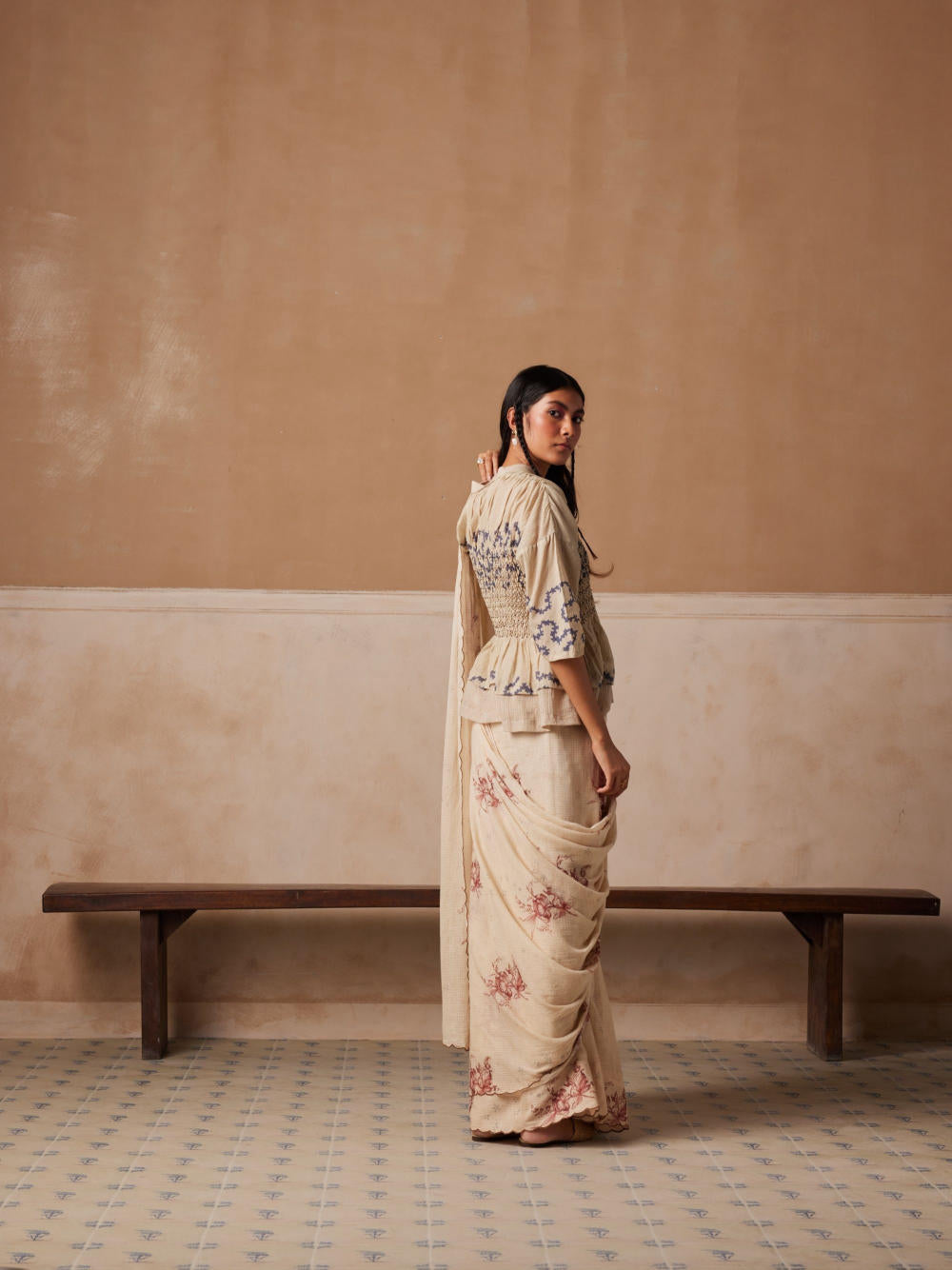 The saree is made from 100% pure cotton featuring hand-smocked details on the shoulder panel and scallop edges.