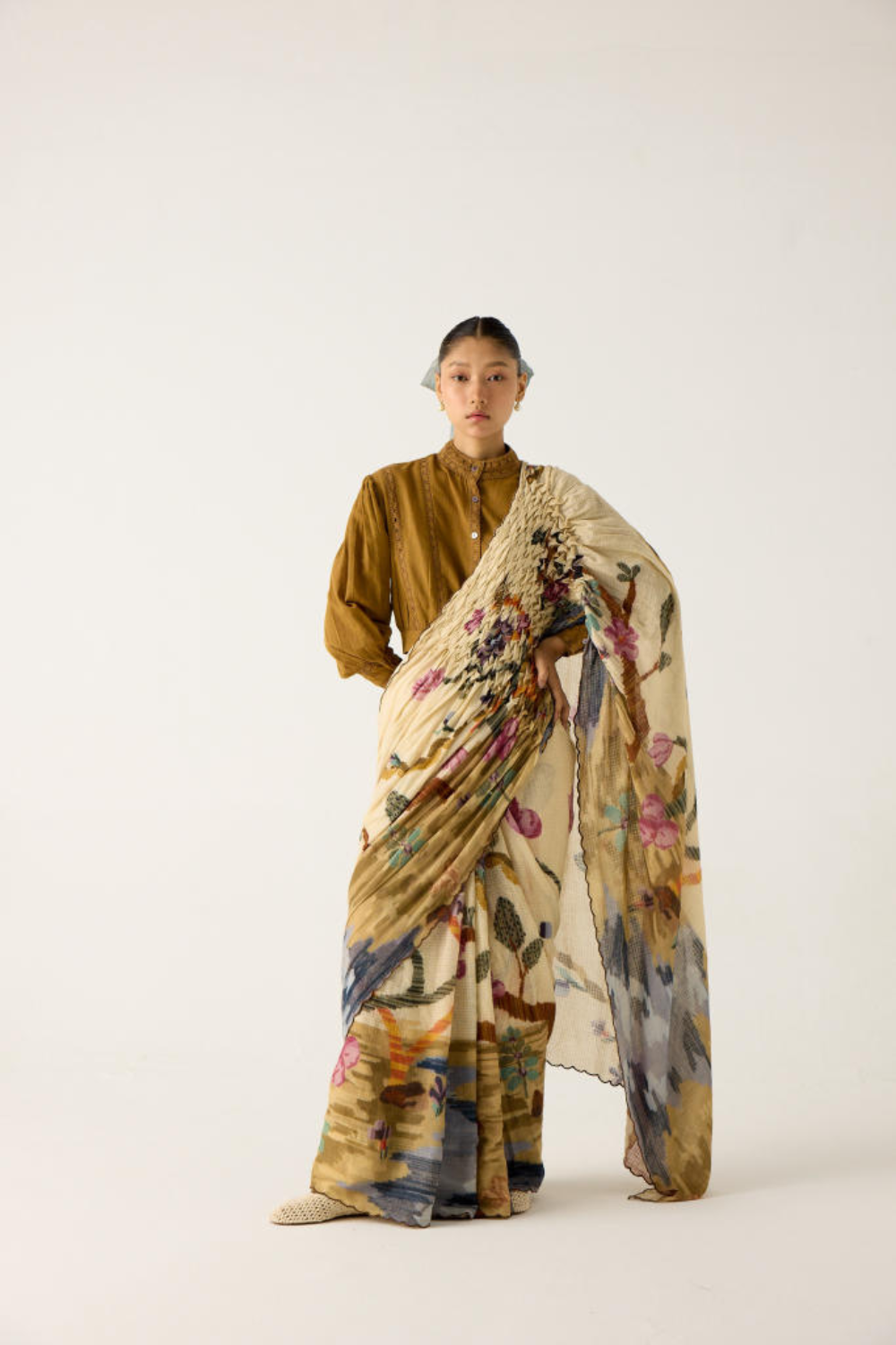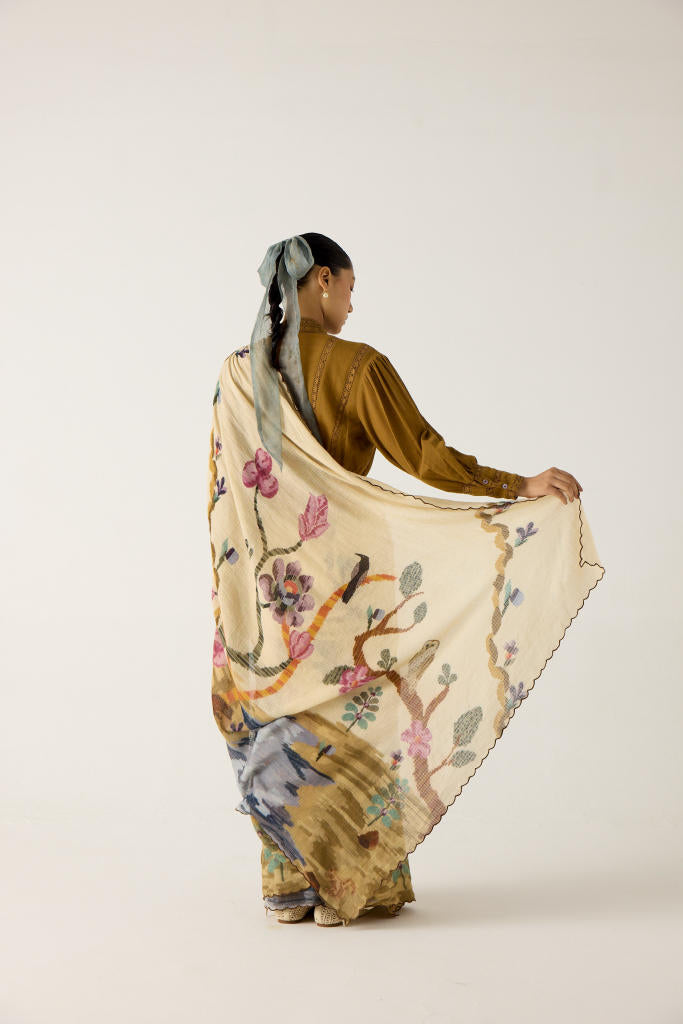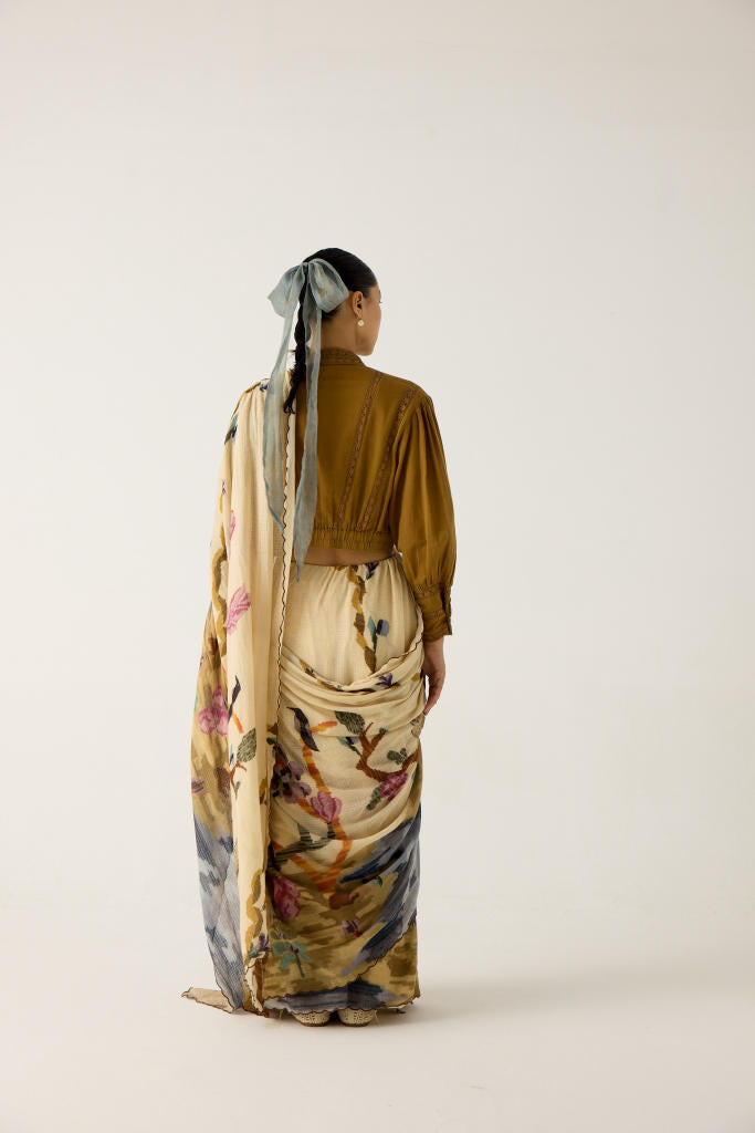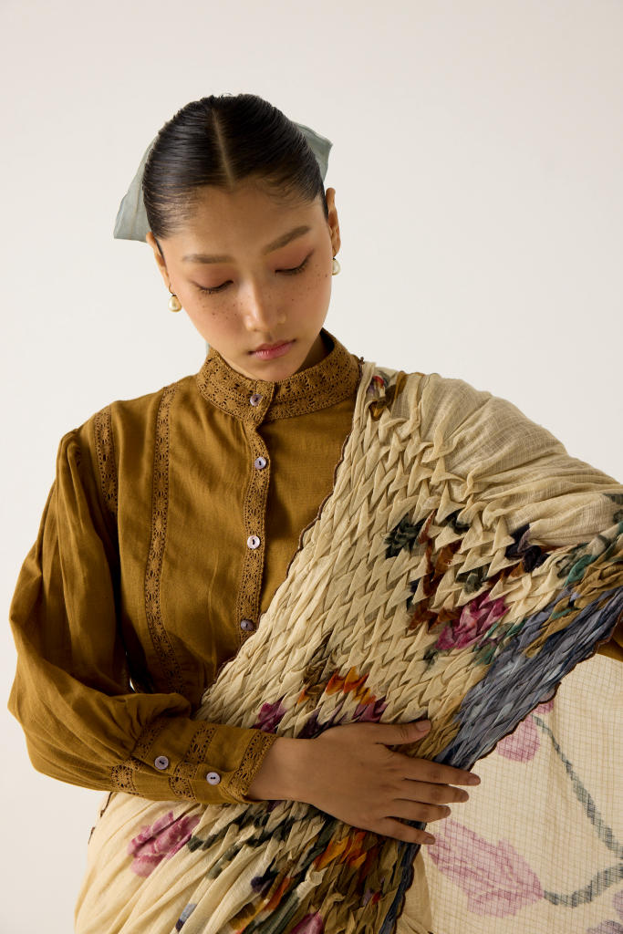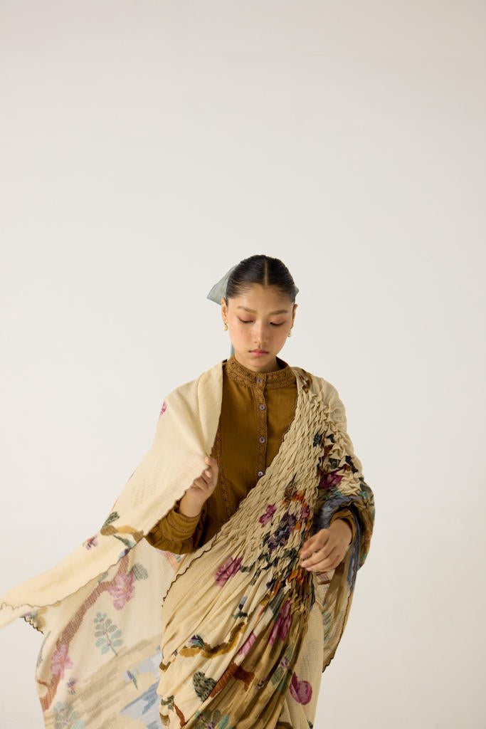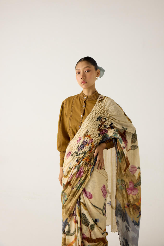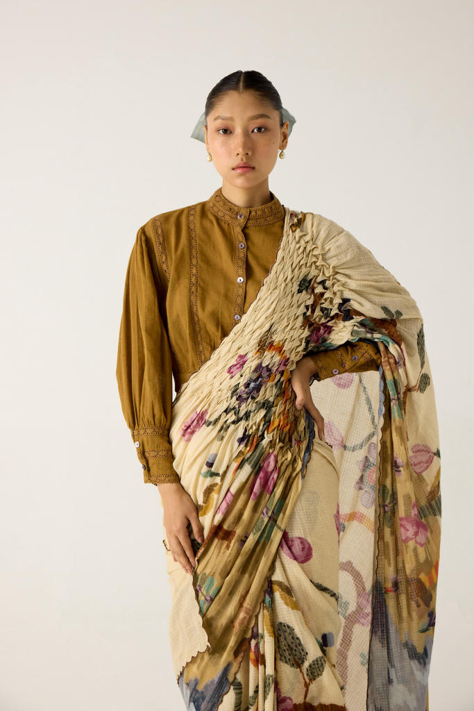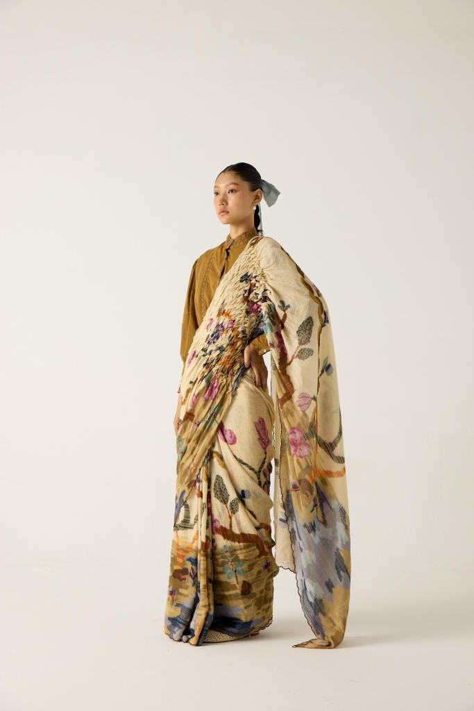 The saree is made from cotton featuring hand-smocked details on the shoulder panel and scalloped edges in our Safari print