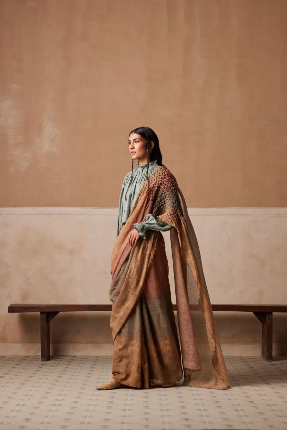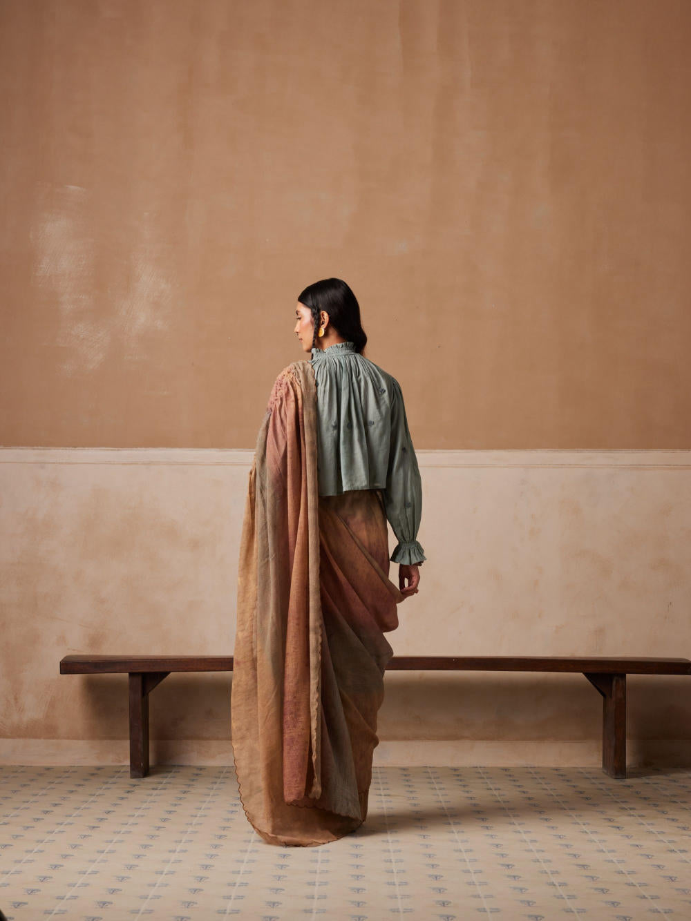 The saree is made from 100% pure cotton featuring hand-smocked details on the shoulder panel and scallop edges paired with the fully hand-embroidered Elsa top. It features smocking on the neck and the cuffs, the cuffs are elasticated and the length is cropped for the relaxed fit. It also features hand-embroidered buttons.