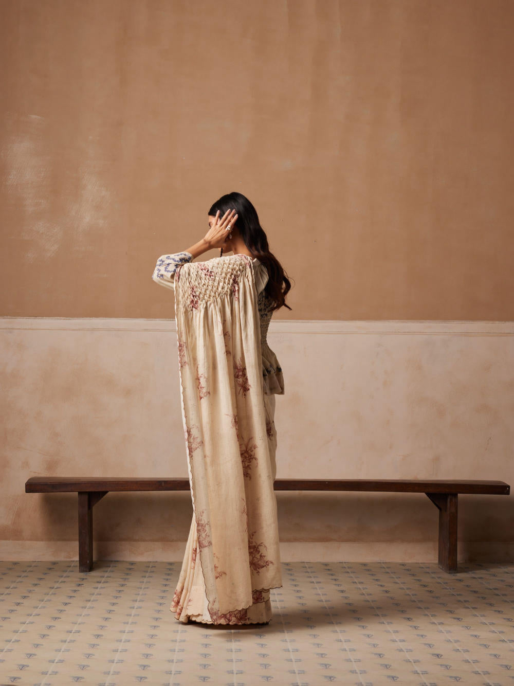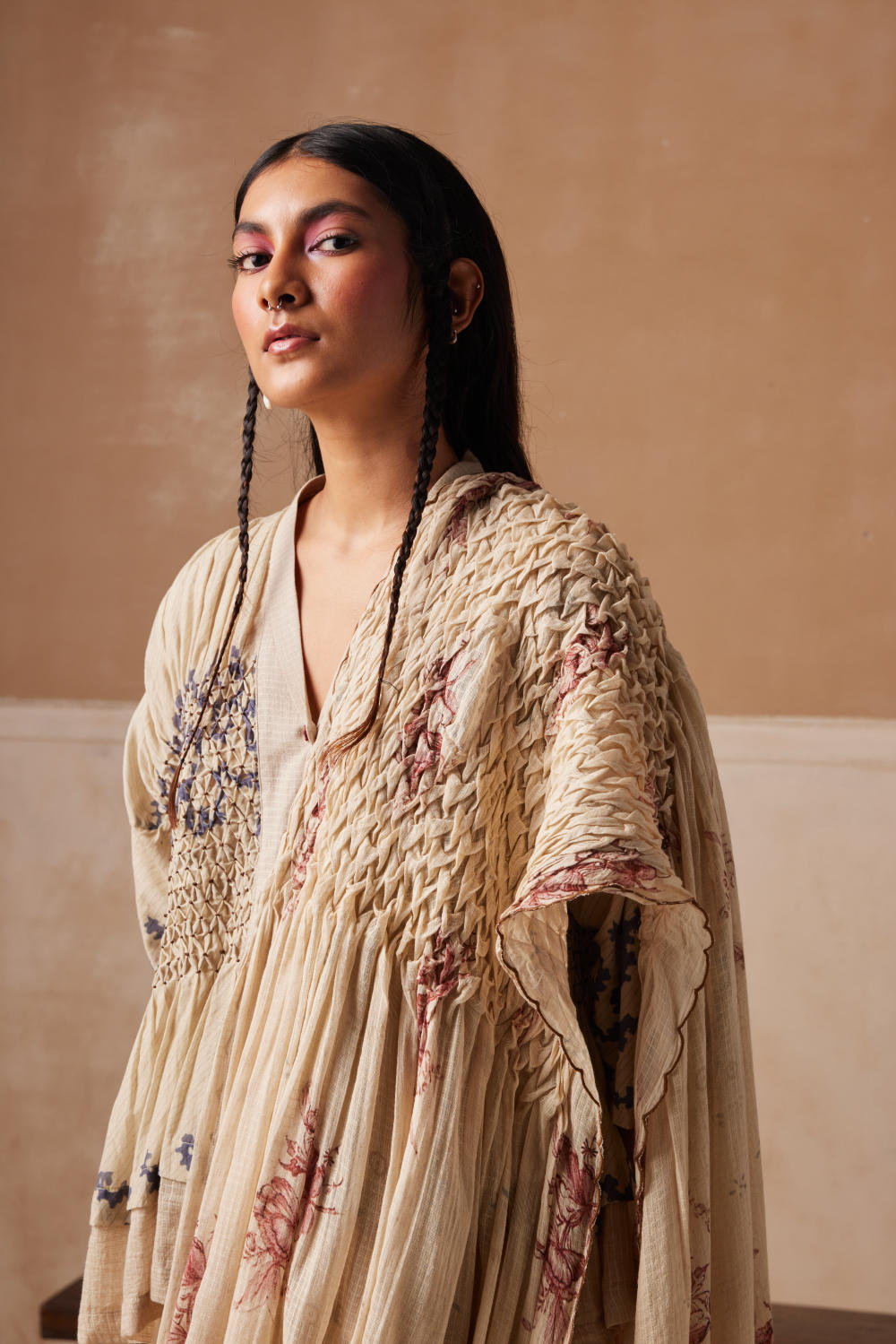 The saree is made from 100% pure cotton featuring hand-smocked details on the shoulder panel and contrast piping paired with the jade top. The jade top is a buttoned-up mid-length top with drop shoulders made in 100% pure cotton . It also features hand smocking on the bust area showcasing the amount of work gone under to make this piece.