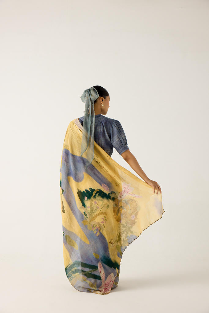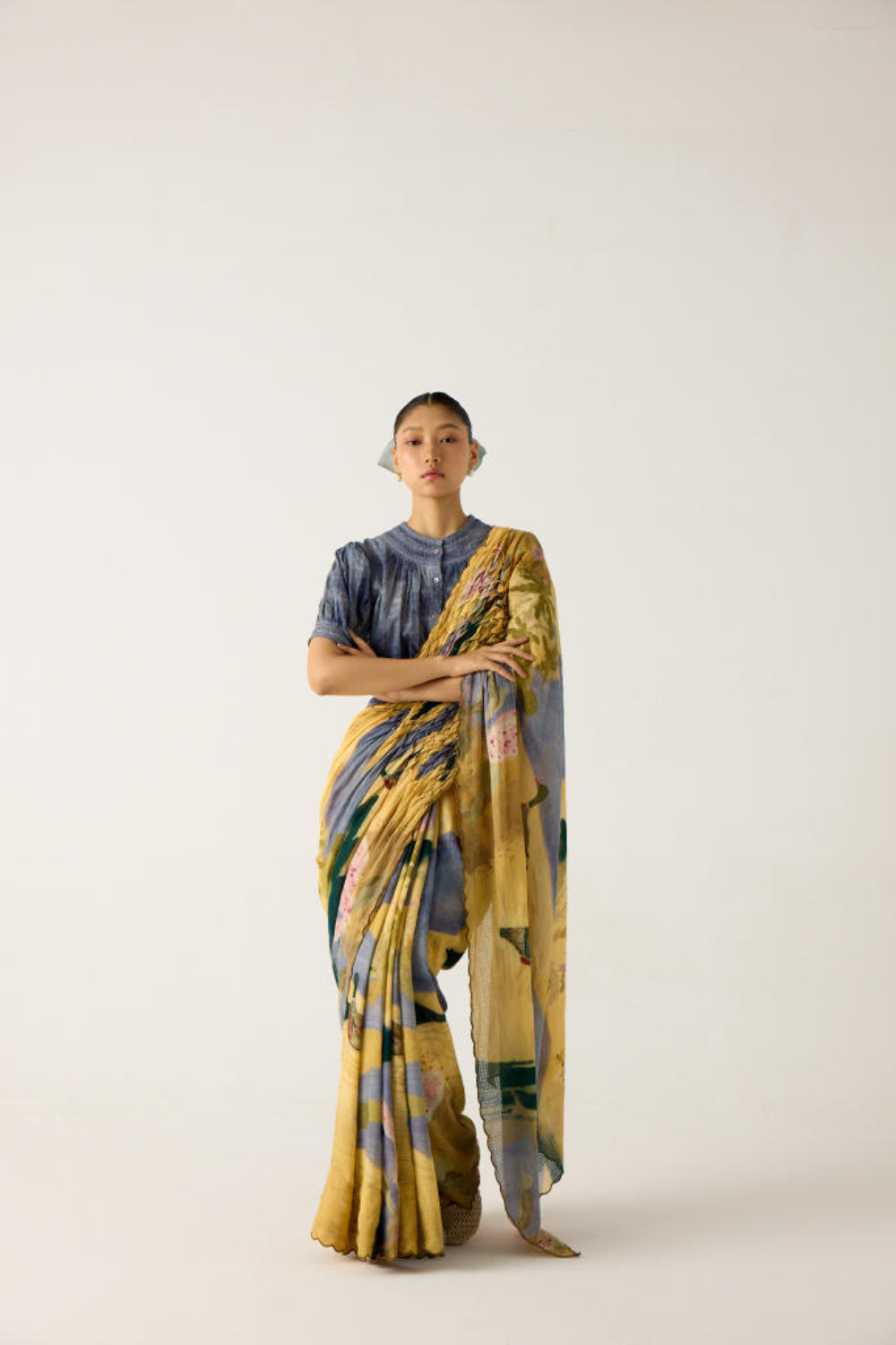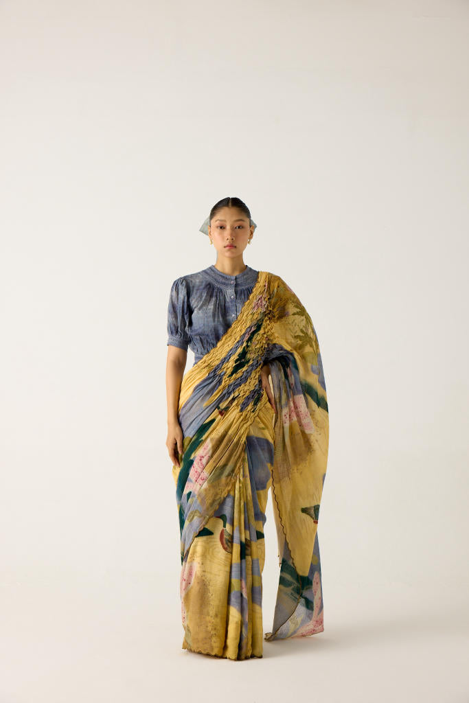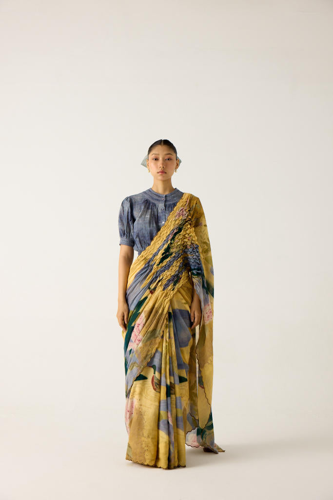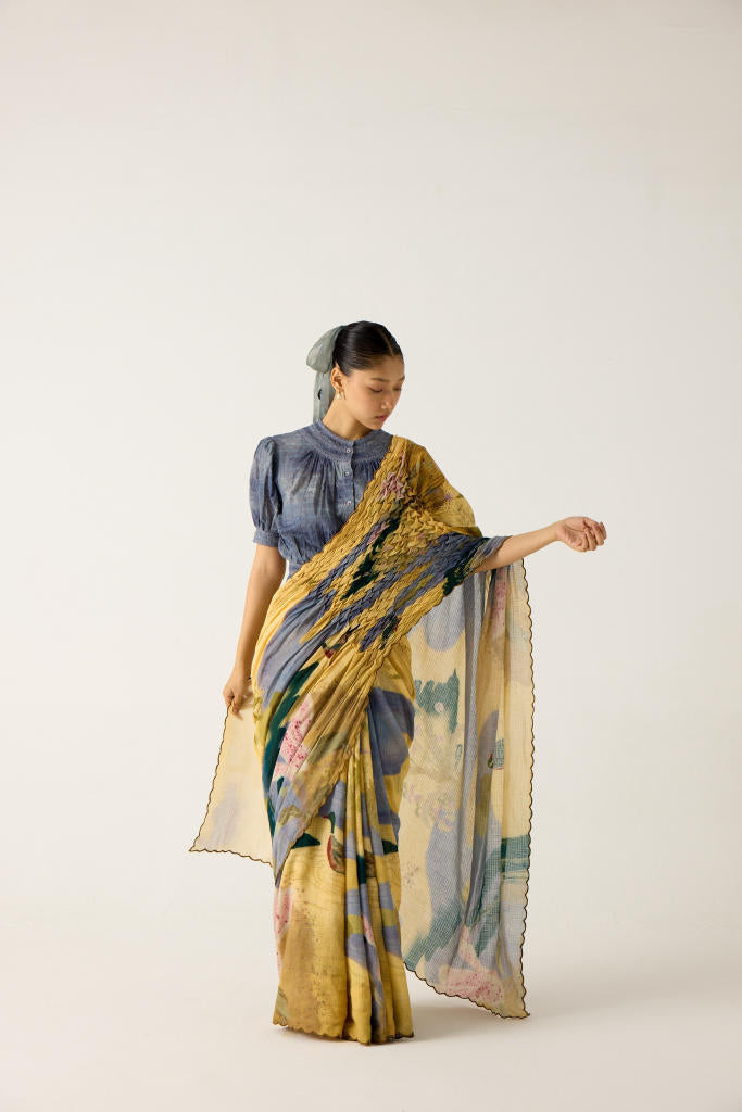 The saree is made from cotton featuring hand-smocked details on the shoulder panel and scalloped edges in our Wallflower print