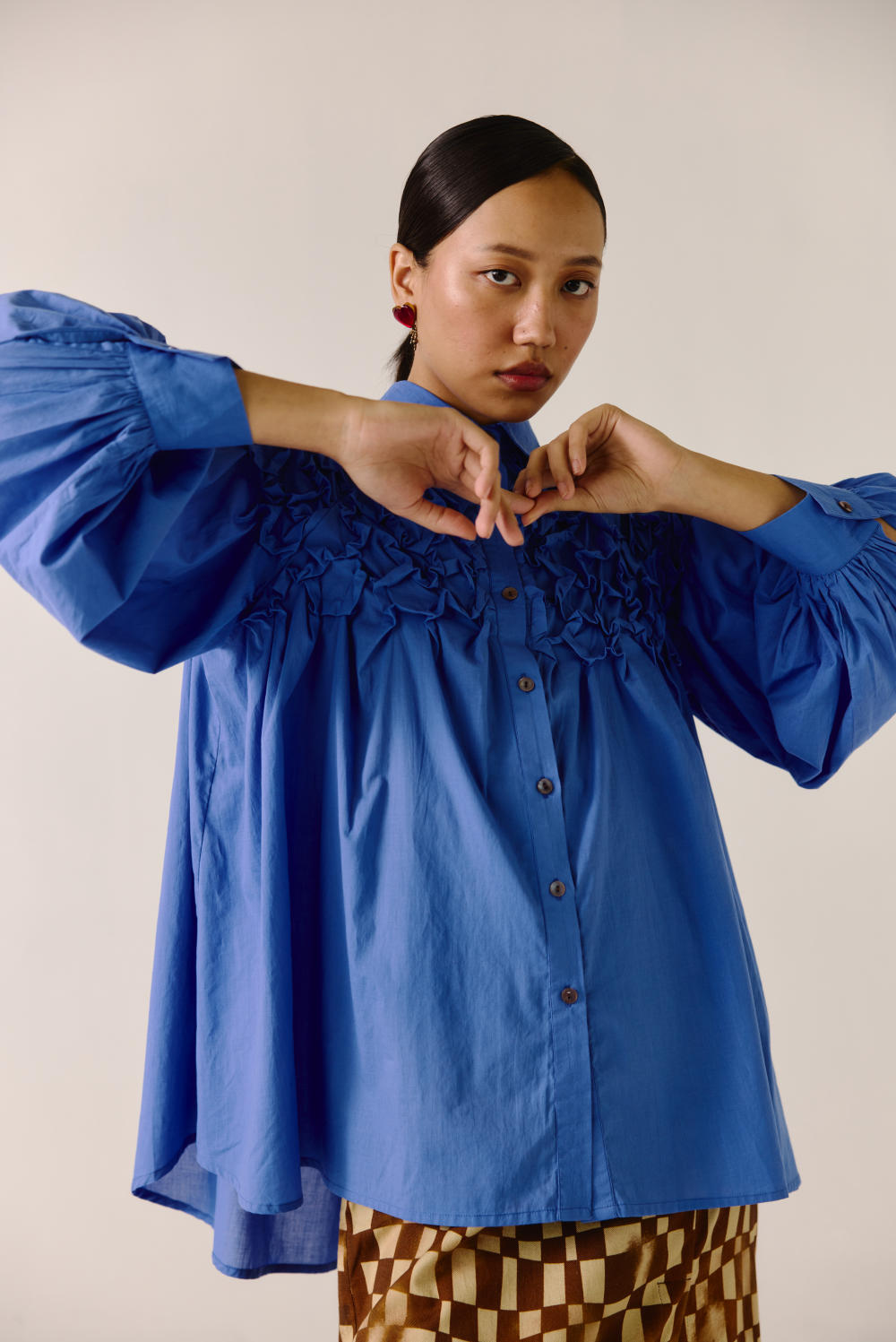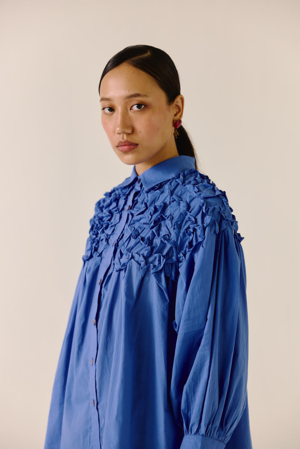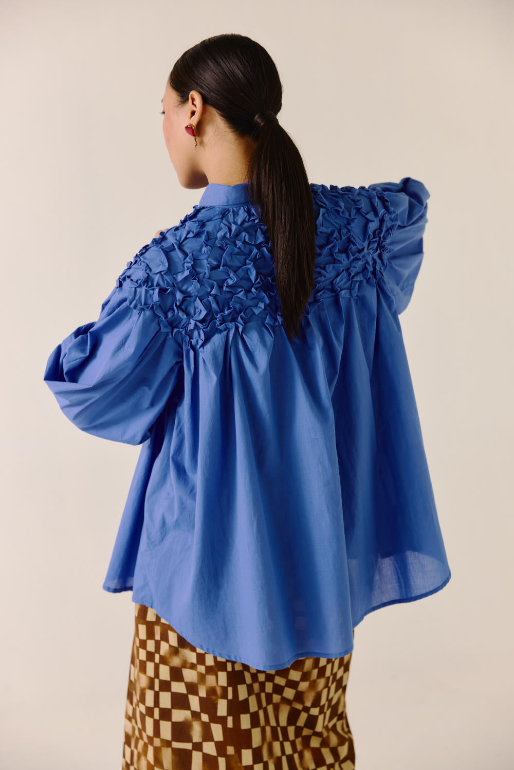 The Smocked Shirt, crafted from soft cotton, features intricate hand-smocking on the neck yoke and shoulders, adding a delicate, artisanal touch. Designed for effortless wear, its relaxed fit and full sleeves ensure all-day comfort while maintaining an elegant silhouette. Perfect for both casual and elevated styling, this shirt blends craftsmanship with timeless ease.