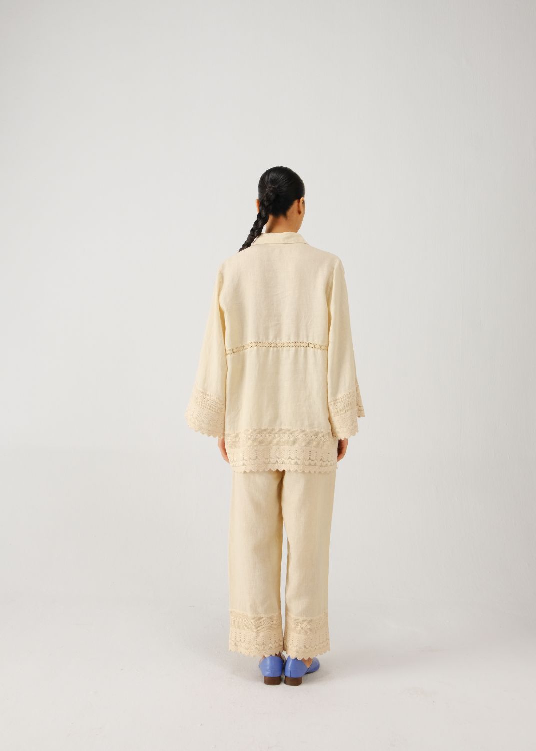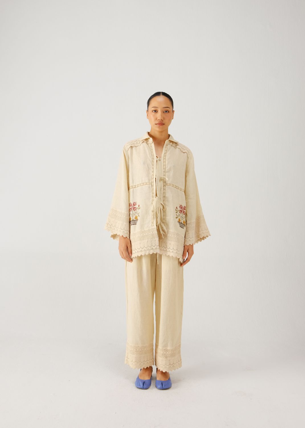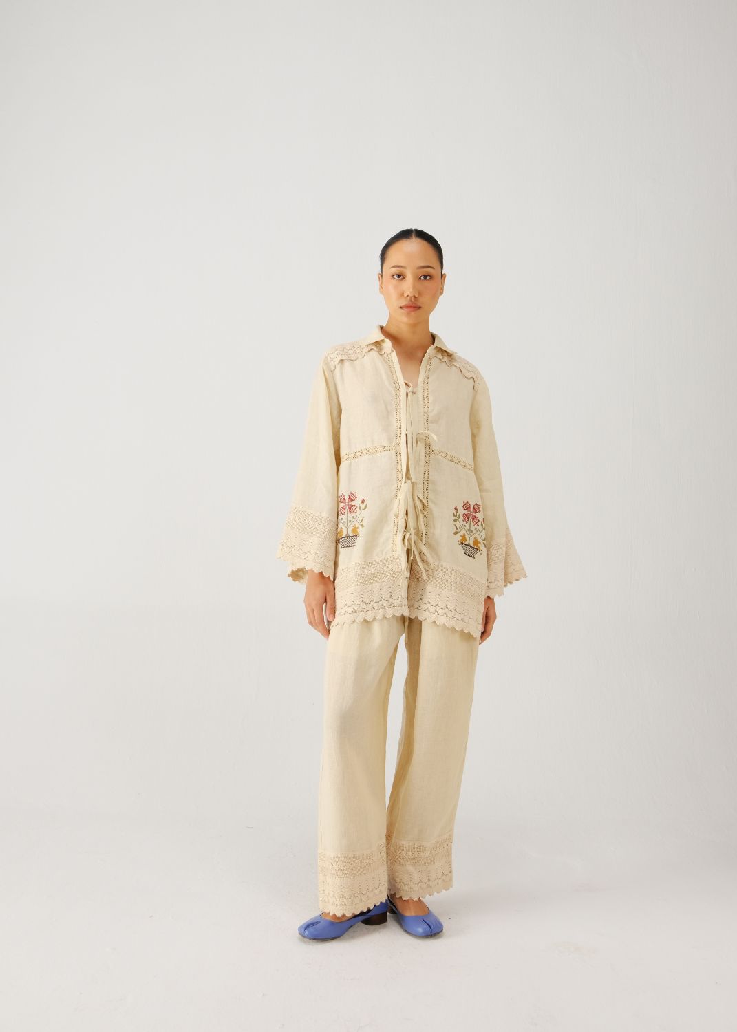 The tie-up set includes a shirt and a pair of drawstring pants. Tie up shirt, made in linen, features a straight, relaxed fit and bell sleeves with lace detailing along the cuffs. The front has a tie-up detail and showcases hand embroidery on the front panel. Lace along the shoulders and a lace hem complete the look.