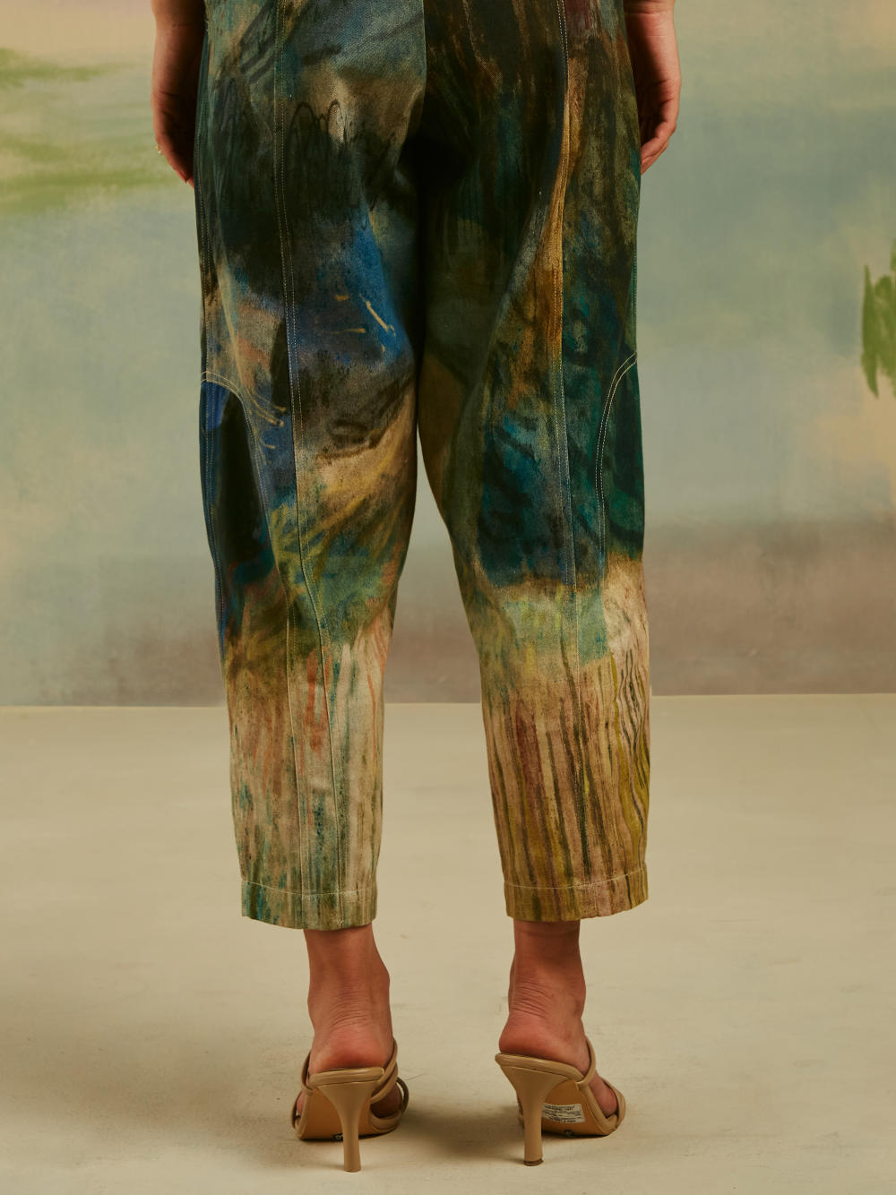 A relaxed fit pair of pants with tapering around the hem. The top stitch pants have pockets on the sides and front darts for ease of movement. They are light on the body and fabricated in a breathable material. The entire set is hand-finished in cotton ethically sourced from India. The pants feature top-stitch detailing running across the pattern.