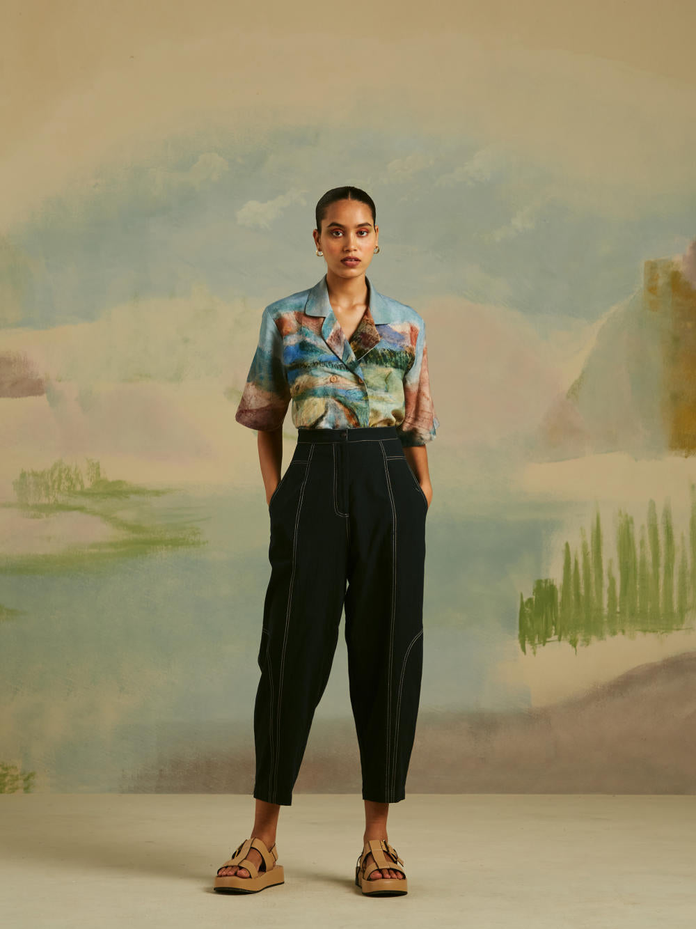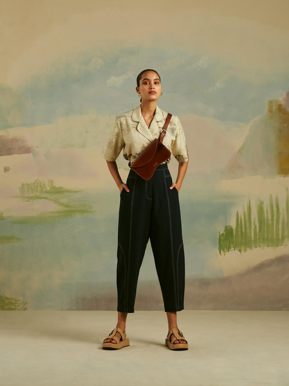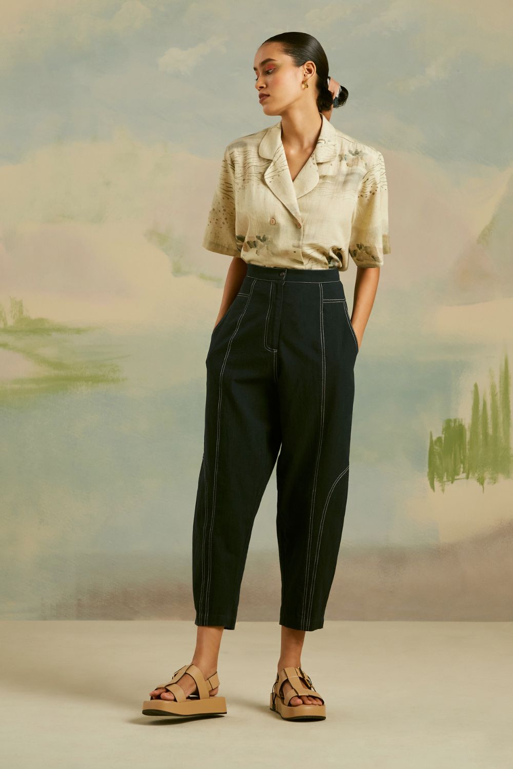A relaxed fit pair of pants with tapering around the hem. The top stitch pants have pockets on the sides and front darts for ease of movement. They are light on the body and fabricated in a breathable material. The entire set is hand-finished in cotton ethically sourced in India. The pants feature top-stitch detailing running across the pattern.