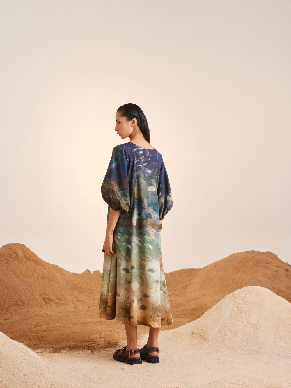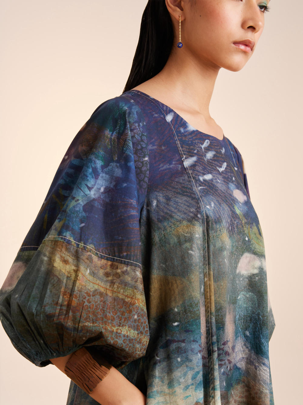 This dress has an oversized relaxed silhouette with 3/4th lantern sleeves. Made in pure cotton fabric this dress features a classic U-neck and top stitch detailing with contrasting thread.