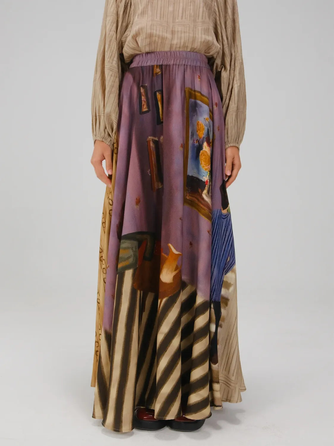 The Umbrella Skirt, crafted in moss fabric in our lakeside print, with an elasticated waistband and an exaggerated, flowing flair—true to its name.
