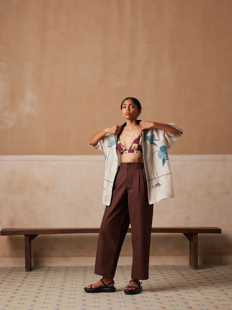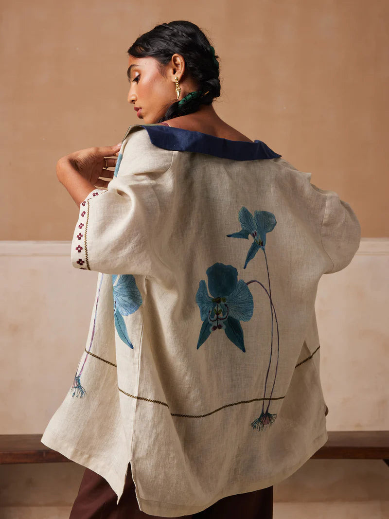 A free-sized unisex shirt, gives an oversized fit till a large size, made in 100% pure handwoven linen fabric makes this piece a staple for all year round. This shirt features our delicate Dayflower print.