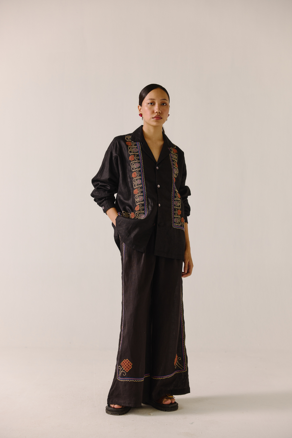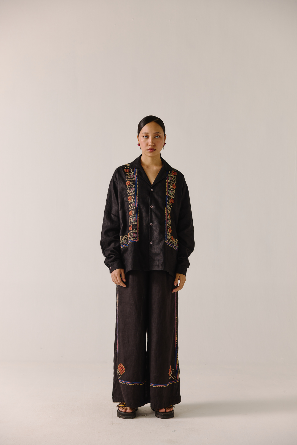 The Unisex Set is a timeless blend of comfort and craftsmanship, designed for effortless, all-season wear. The free-sized unisex shirt offers an oversized fit up to a large size, featuring intricate cross-stitch embroidery that adds artisanal charm. Made from 100% pure linen, it drapes beautifully while ensuring breathability. Paired with relaxed lounge pants adorned with subtle embroidery accents, this set is a perfect balance of ease and understated elegance.