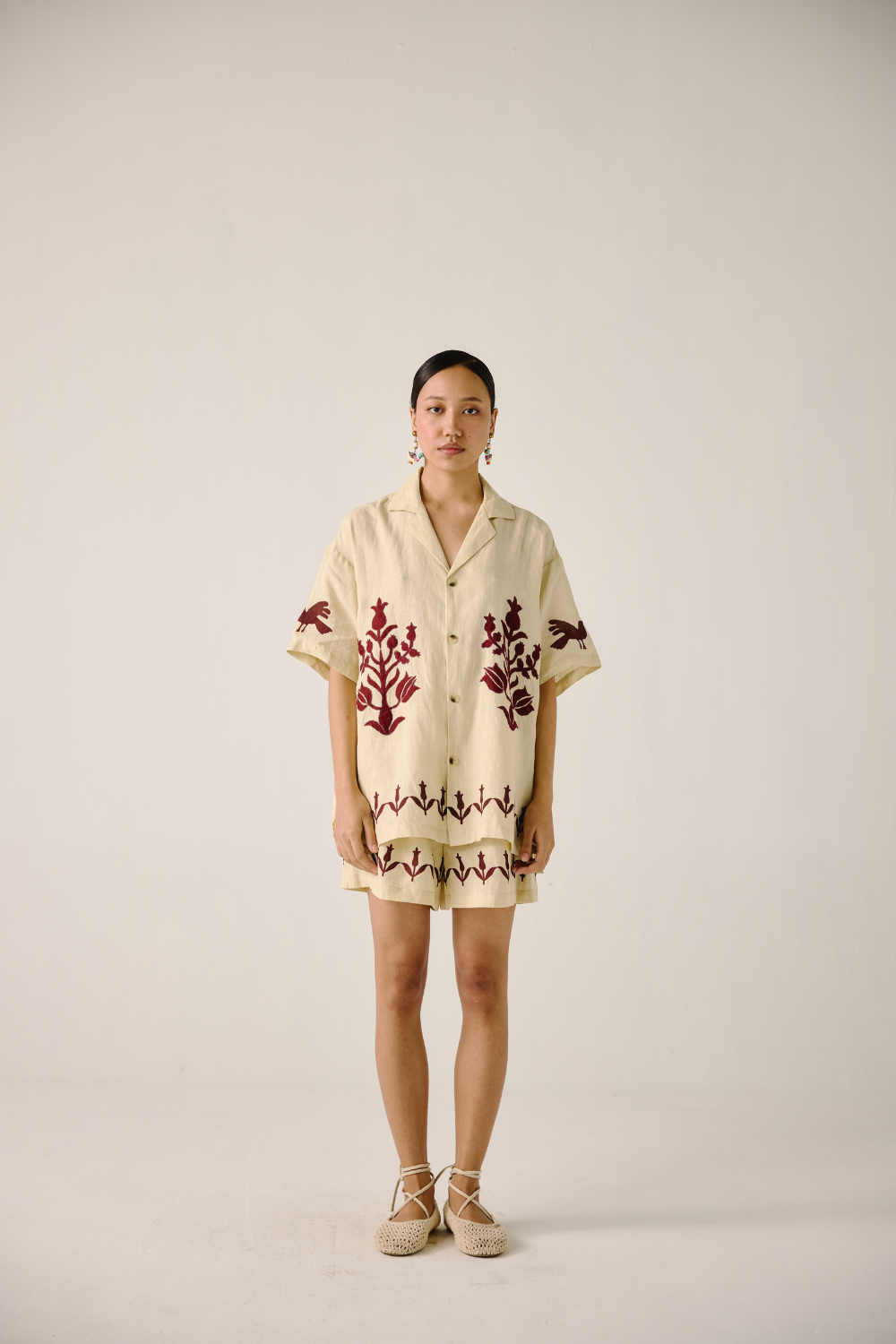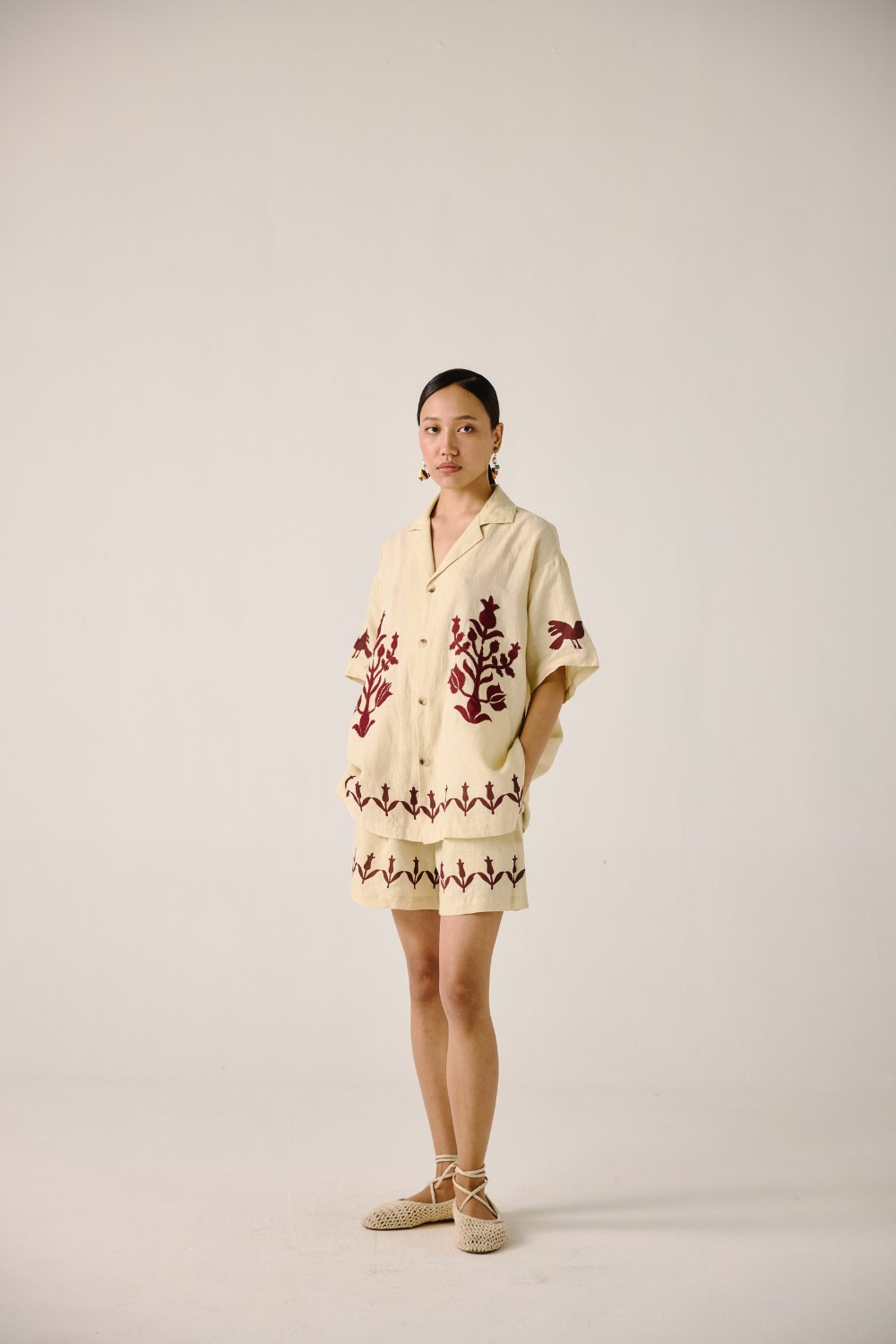 Crafted from 100% linen, this boxy-fit shirt blends comfort with artisanal charm. Designed with a notch collar and subtle sleeve details, it offers a relaxed, oversized fit that flatters a range of sizes. Block-printed flowers adorn the sleeves and hem, adding a delicate touch, while intricate appliqué detailing on the yoke enhances its handcrafted appeal. Lightweight and breathable, this versatile piece is perfect for effortless, everyday styling.