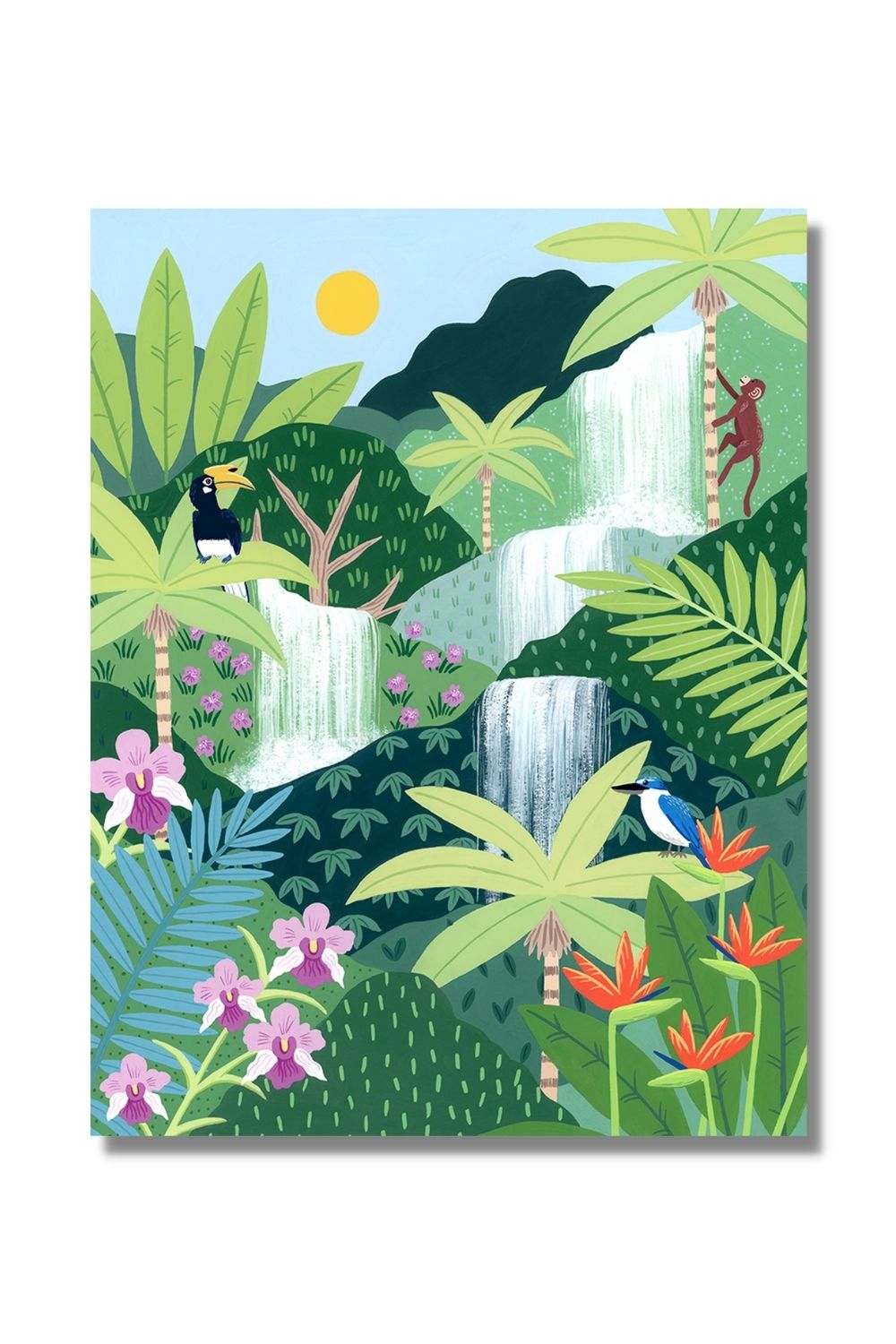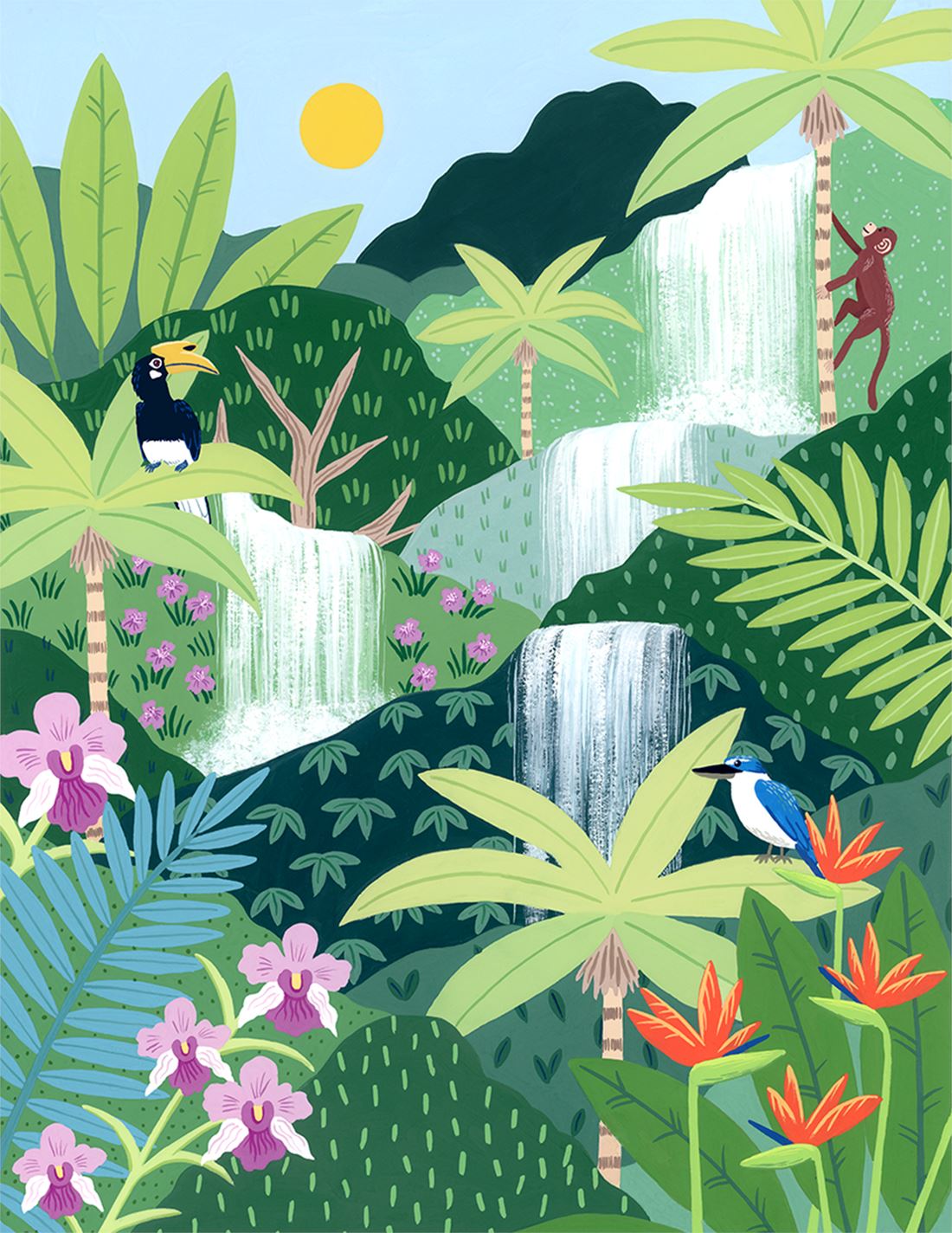 This painting had a few inspirations from here in Singapore. Firstly, the forest at Bukit Timah where you can often see some local monkeys swinging in the large surrounding trees. And secondly, the main aviary at Jurong Bird Park. This aviary is one of my favourite places in Singapore, with its large waterfall and all the birds you get to see up close and personal! This painting showcases two of my favourite birds here in Singapore, the Oriental Pied Hornbill and Collared Kingfisher. This art print is created from an original Em+Co Art gouache painting.