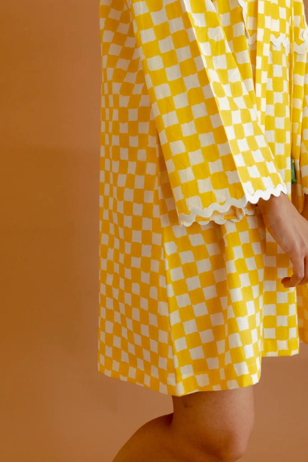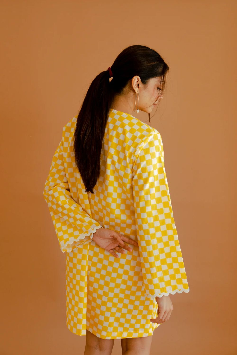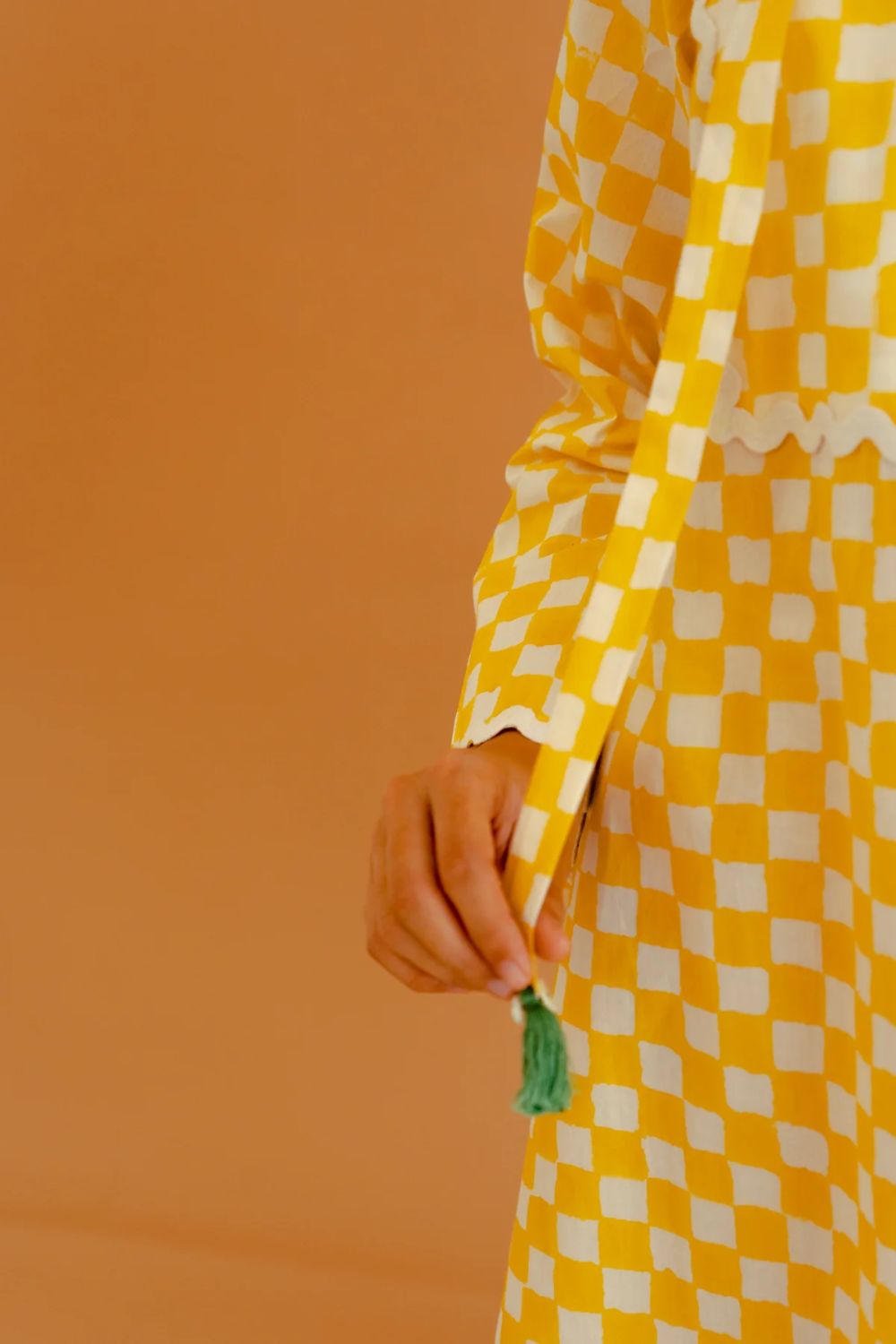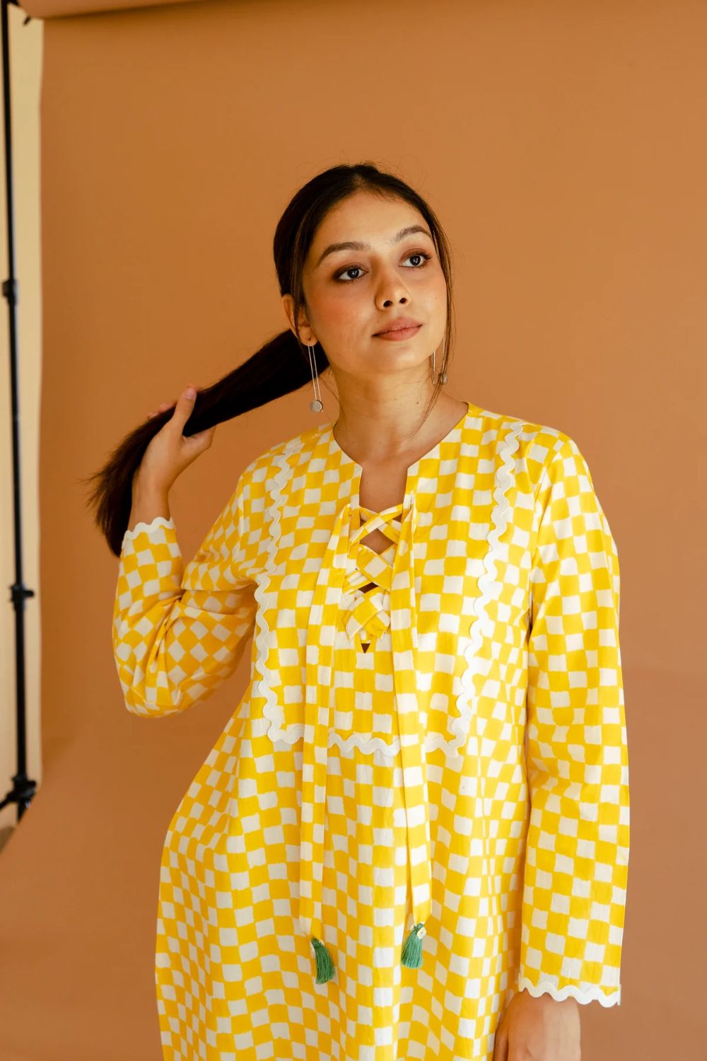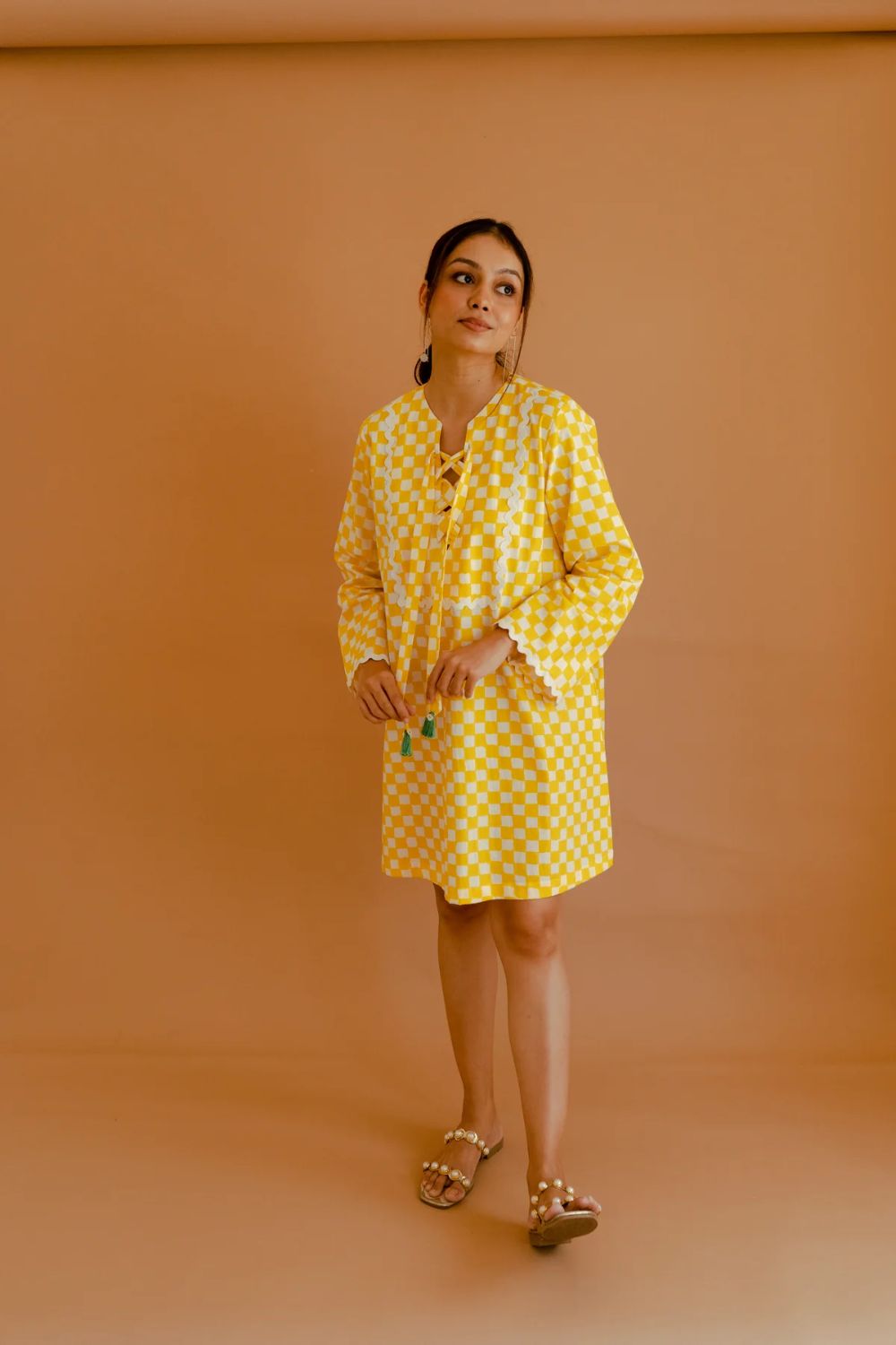 This ivory and yellow checked cotton dress combines classic charm with contemporary flair. Featuring a close-fitting round neck adorned with criss-cross string detailing, it offers a structured yet feminine silhouette. The full bell-shaped sleeves add a touch of drama and movement, enhancing the dress's elegant appeal. A delicate lace trim at the hemline and front introduces a subtle texture, complementing the overall design. Crafted from breathable cotton, this dress ensures comfort, making it an ideal choice for warm-weather occasions. Its blend of traditional patterns and modern details makes it a versatile addition to any wardrobe.