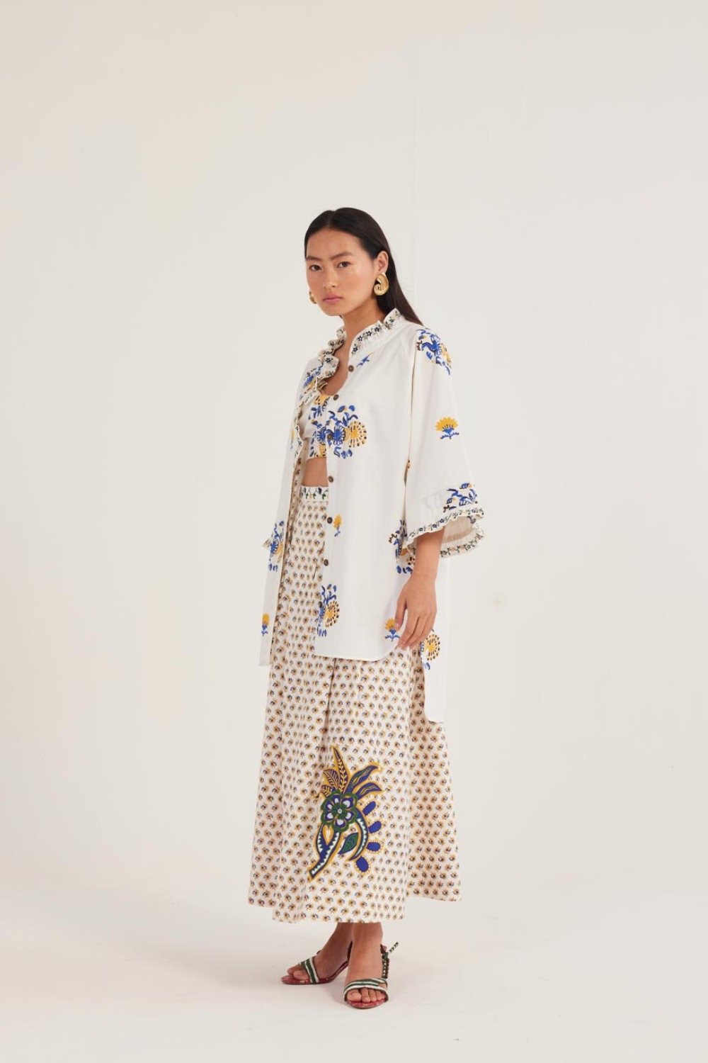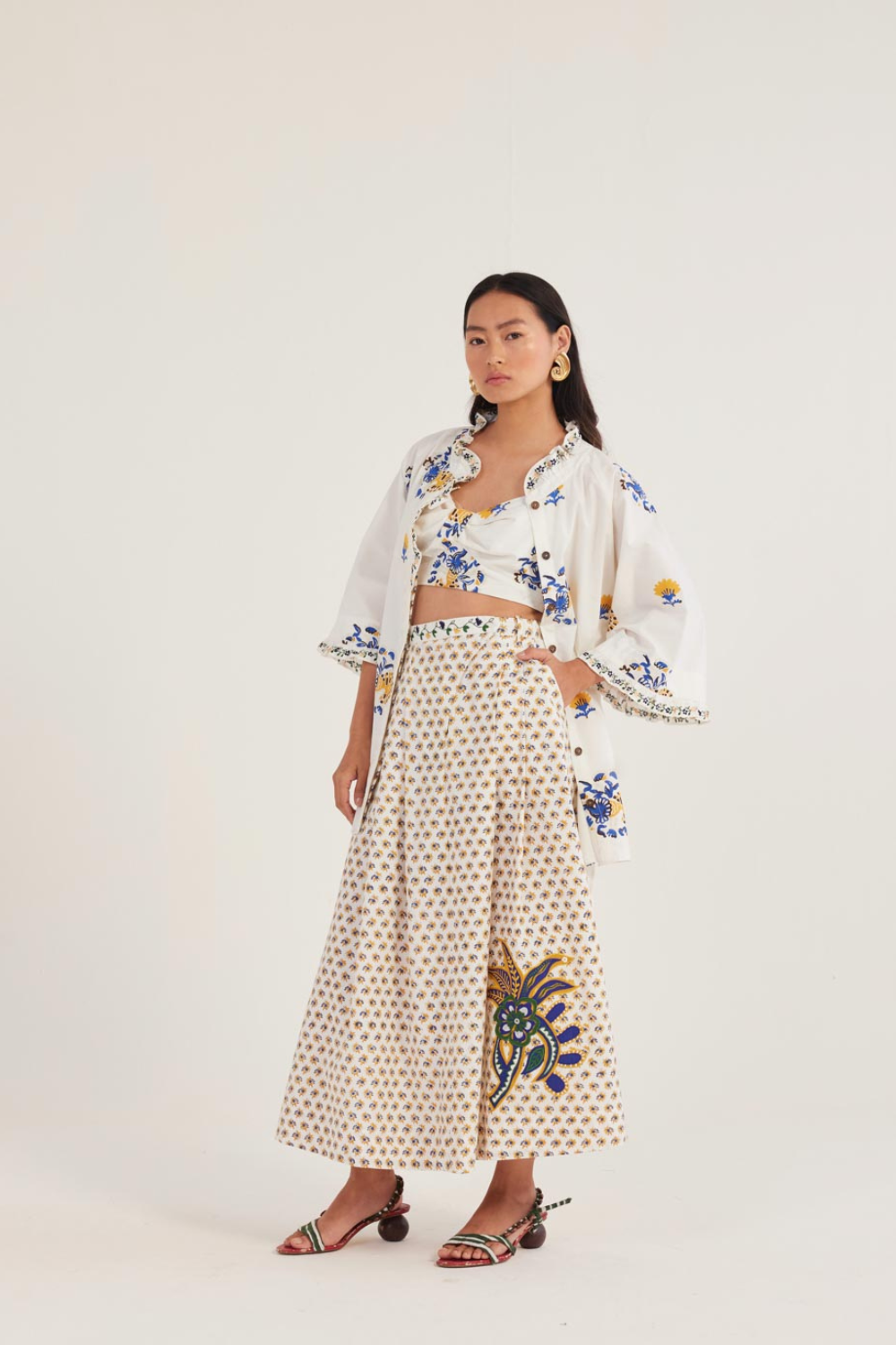 We love us a pleated skirt! This one is hand block printed in cotton with applique work and an embroidered waistline.