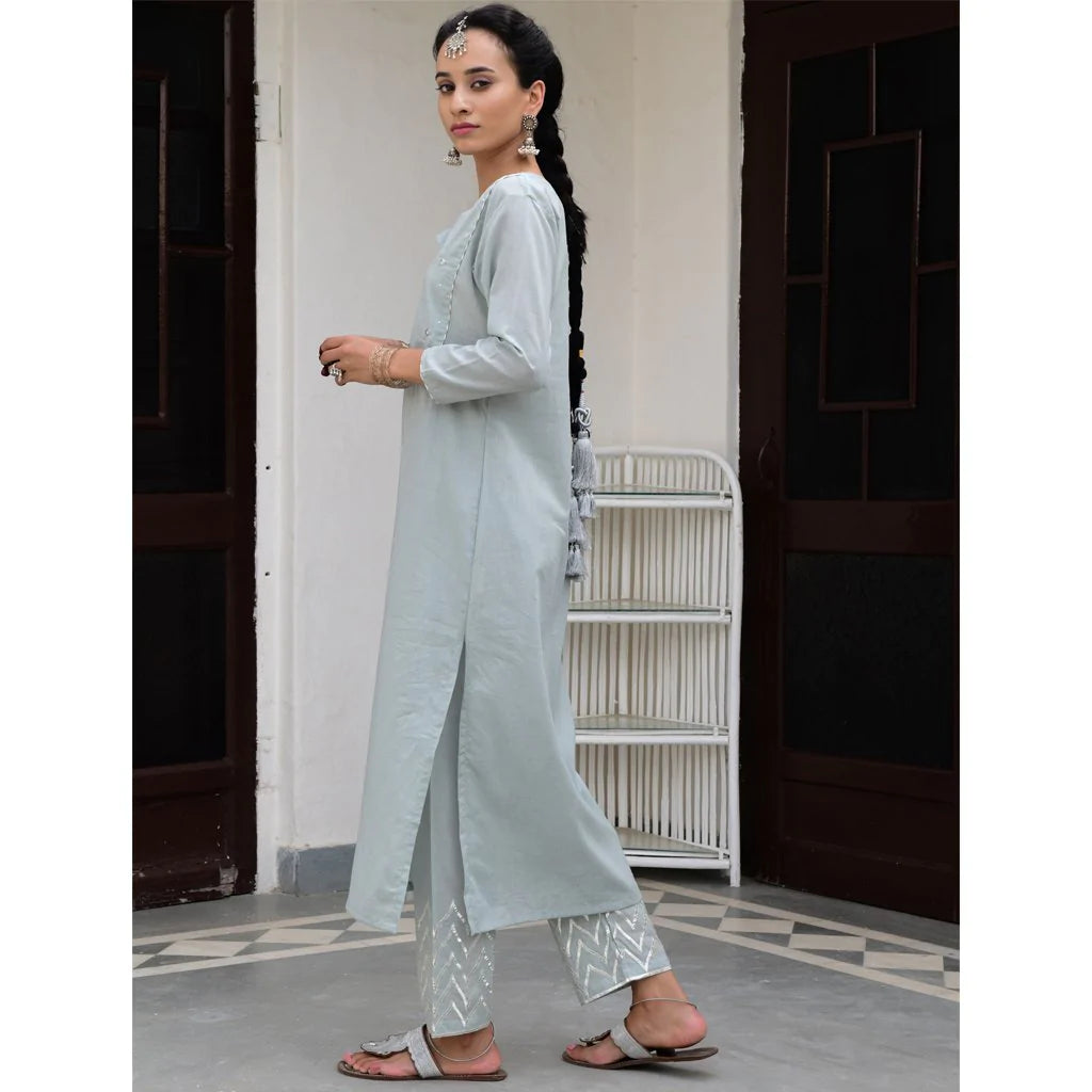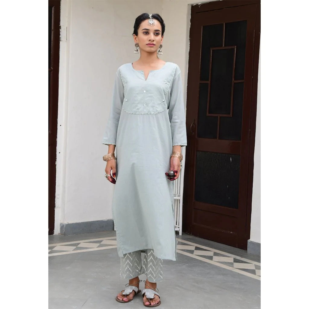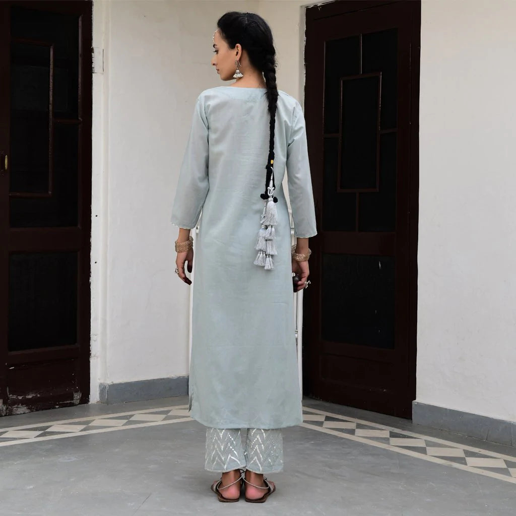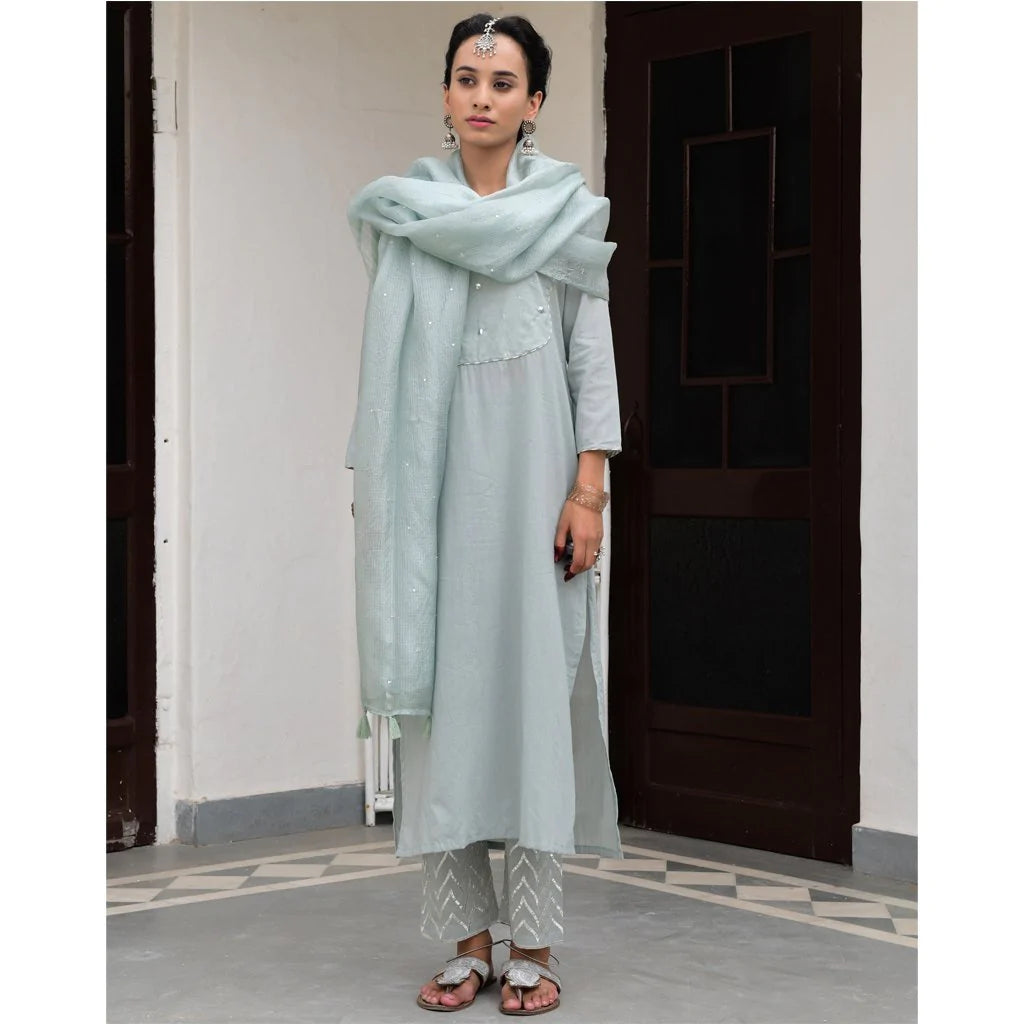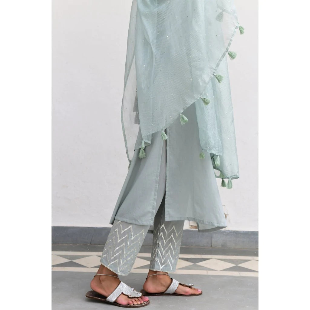 Cotton mulmul straight kurta with a mukaish work yolk and hand block printed pipings. Straight pants with elastic and drawstring tie are embroidered by hand with silver gota in a tradtional Mughal pattern, and kota silk dupatta embroidered with sequins and thread tassels, with delicate silver ties.