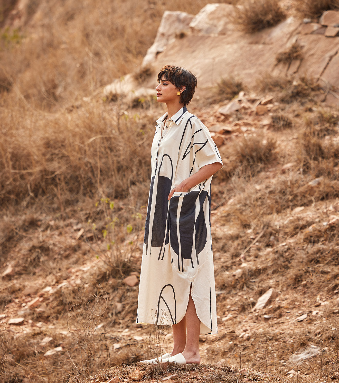 An off white pleated panel kaftan , crafted from breathable cotton mul fabric. adorned with a statement cactus print . featuring a collar and button opening at the front. - Handcrafted in India. - Side seam pockets