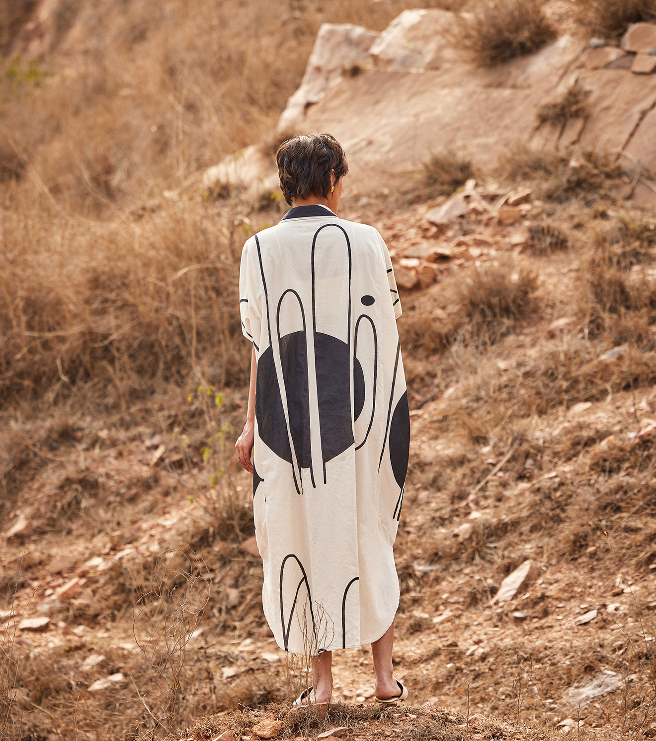 Rooted in handloom cotton and natural dyes, Khara Kapas works with the simplest geometry — circles, squares, triangles — and turns them into silhouettes that feel effortless, global, and emotionally familiar. There is a stillness to their clothes, a sense of returning to slower rhythms and honest materials, without ever losing relevance.