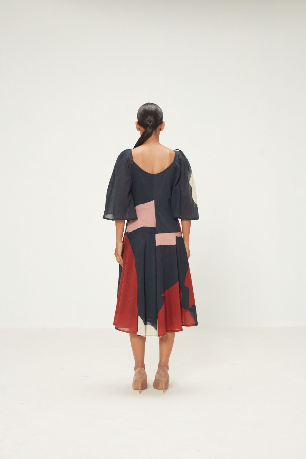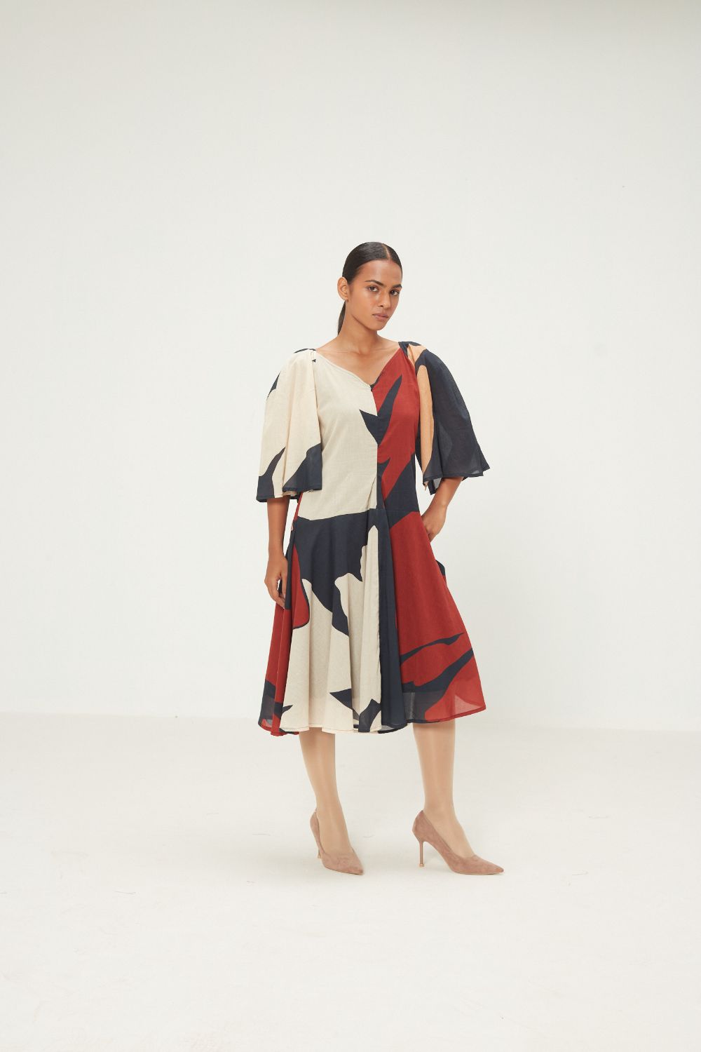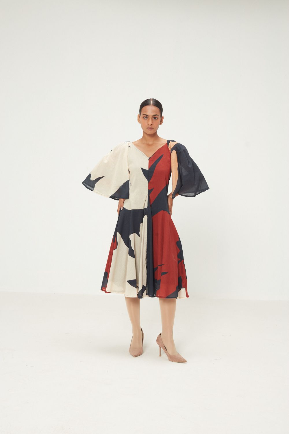A fluid midi dress in an abstract play of earthy reds, deep navy, and soft ivory. Designed with soft curtain sleeves and a relaxed silhouette, it drapes effortlessly, bringing together movement, comfort, and a quiet statement.