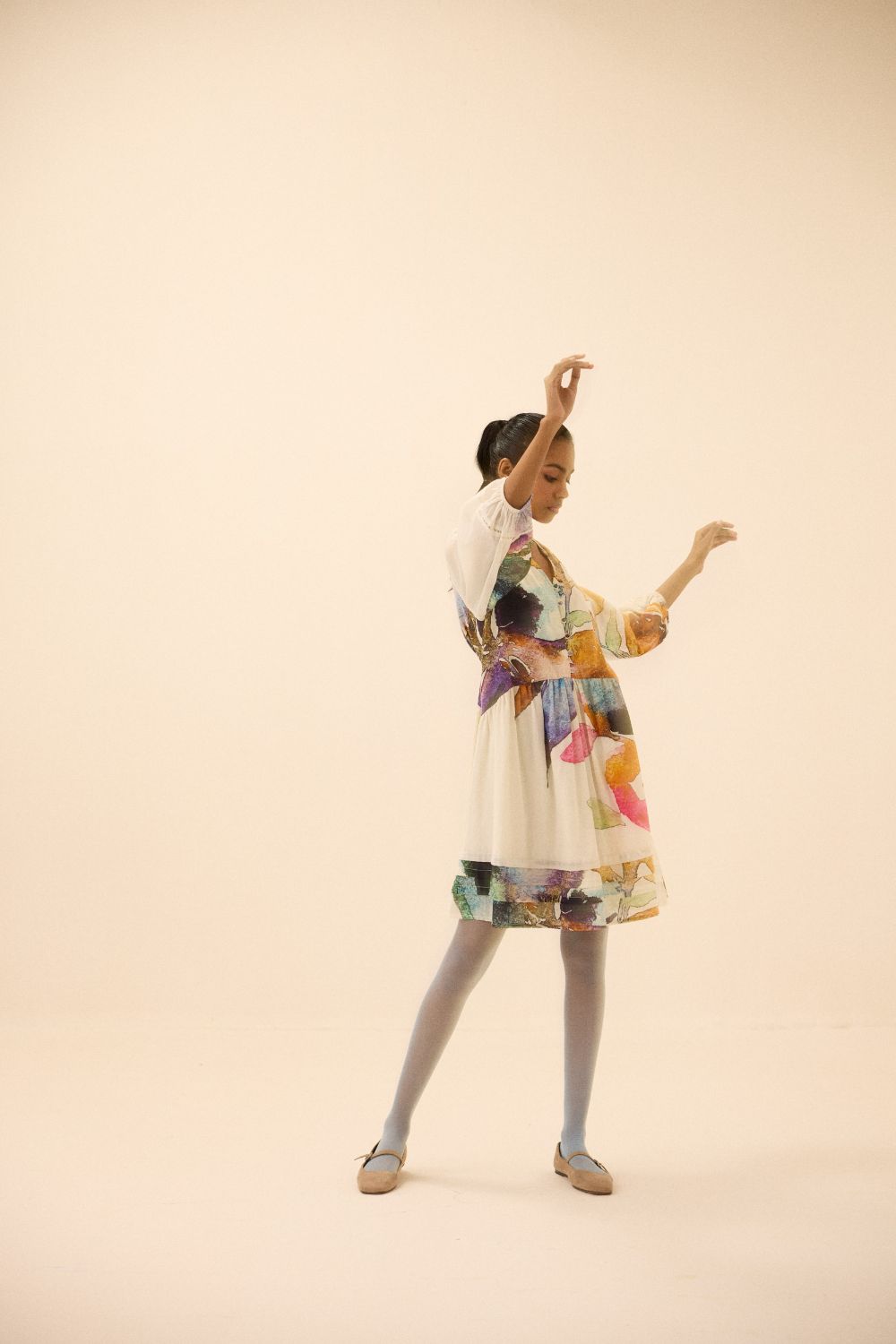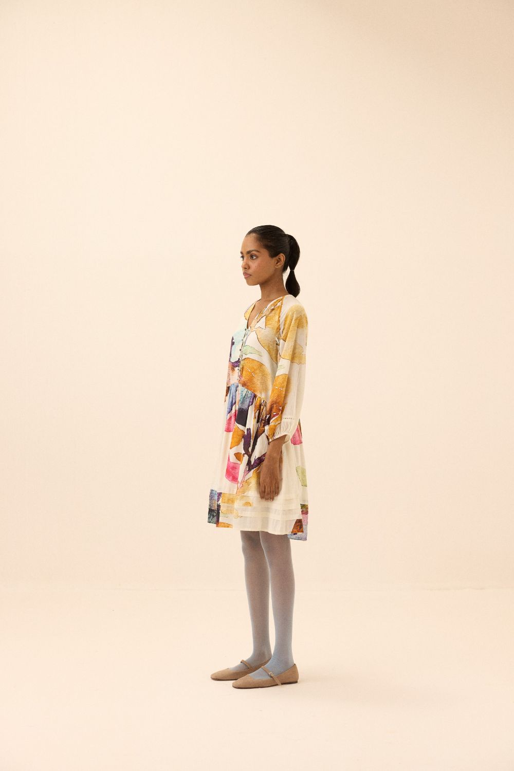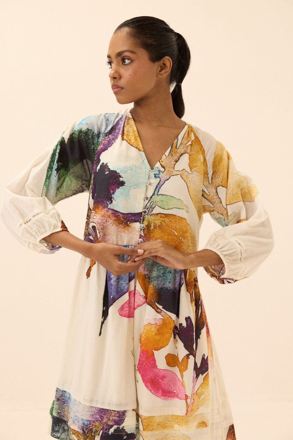 This digital print white mul dress features vibrant patterns in soft pastel hues, with a relaxed, flowing silhouette. Its simple V-neck and billowing sleeves add to the comfortable, artistic look.