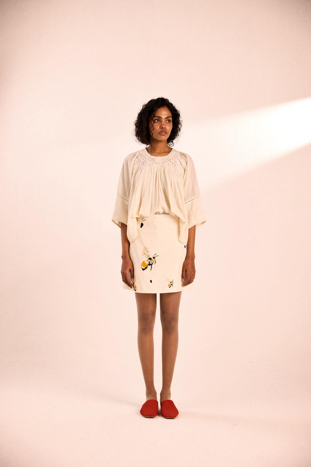Cotton twill skirt shorts featuring playful bee motifs for a fun and relaxed vibe.