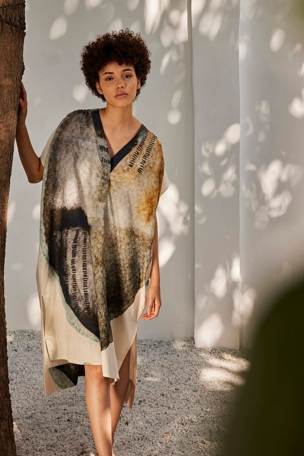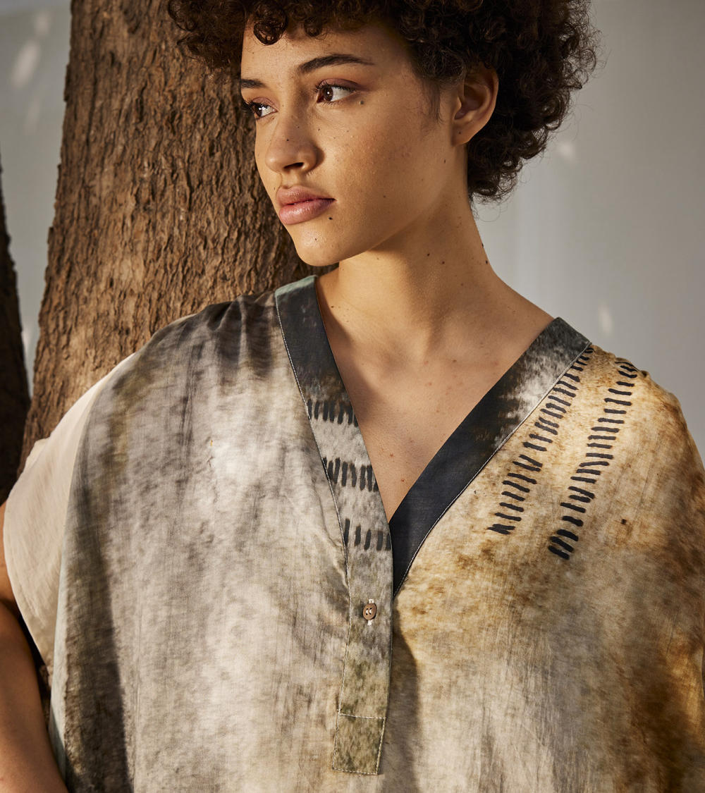 The lagoon series are layered with intuitive brushstrokes depicting sea scapes and reflecting on duality of life where control and spontaneity exists at the same time. The visual elements of a lagoon depict the calmness of your mind while still being connected to the sea of emotions one experiences. An off-white mulmul cotton kaftan dress with a front button opening, side slit and gathers at the shoulder.