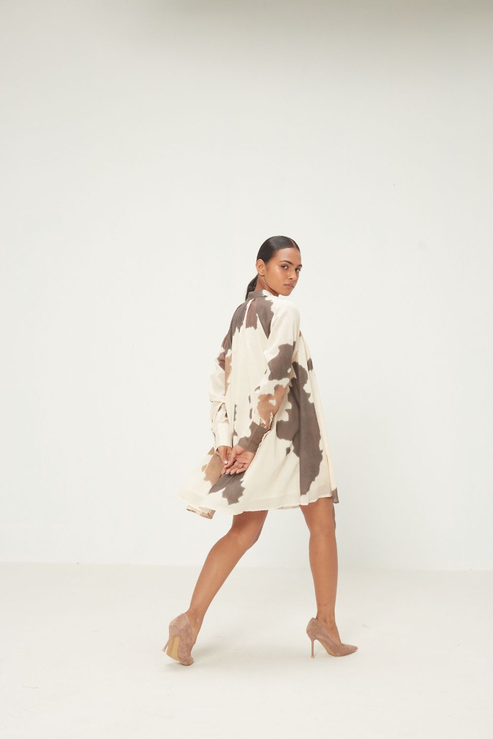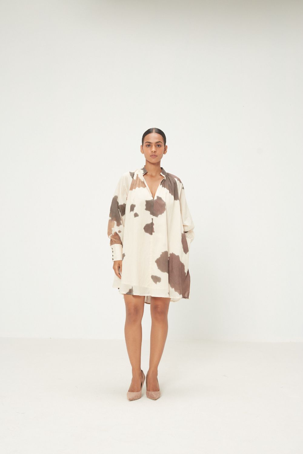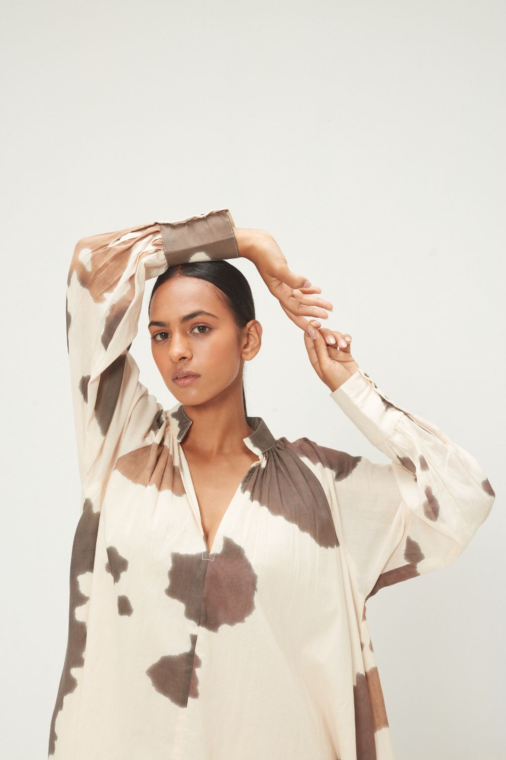 An flowy midi dress with a V-neckline and mandarin collar, along with long sleeves and cuff, elevated by a scattered earthy brown abstract patches on ecru base for a modern, effortless look.