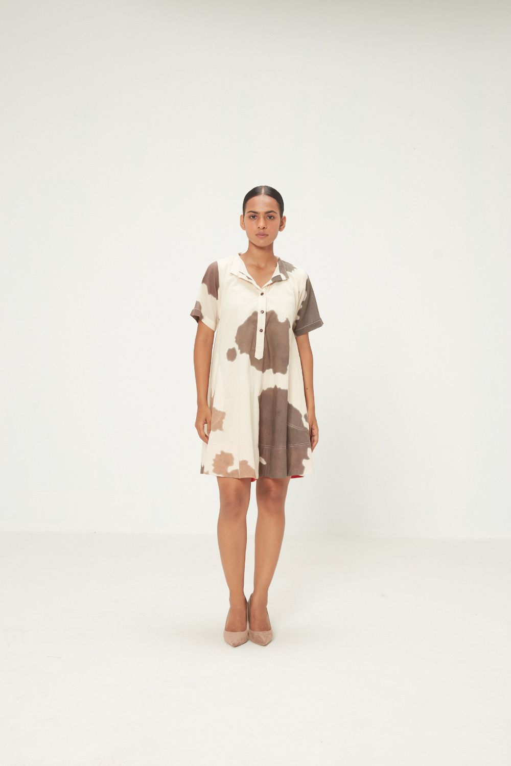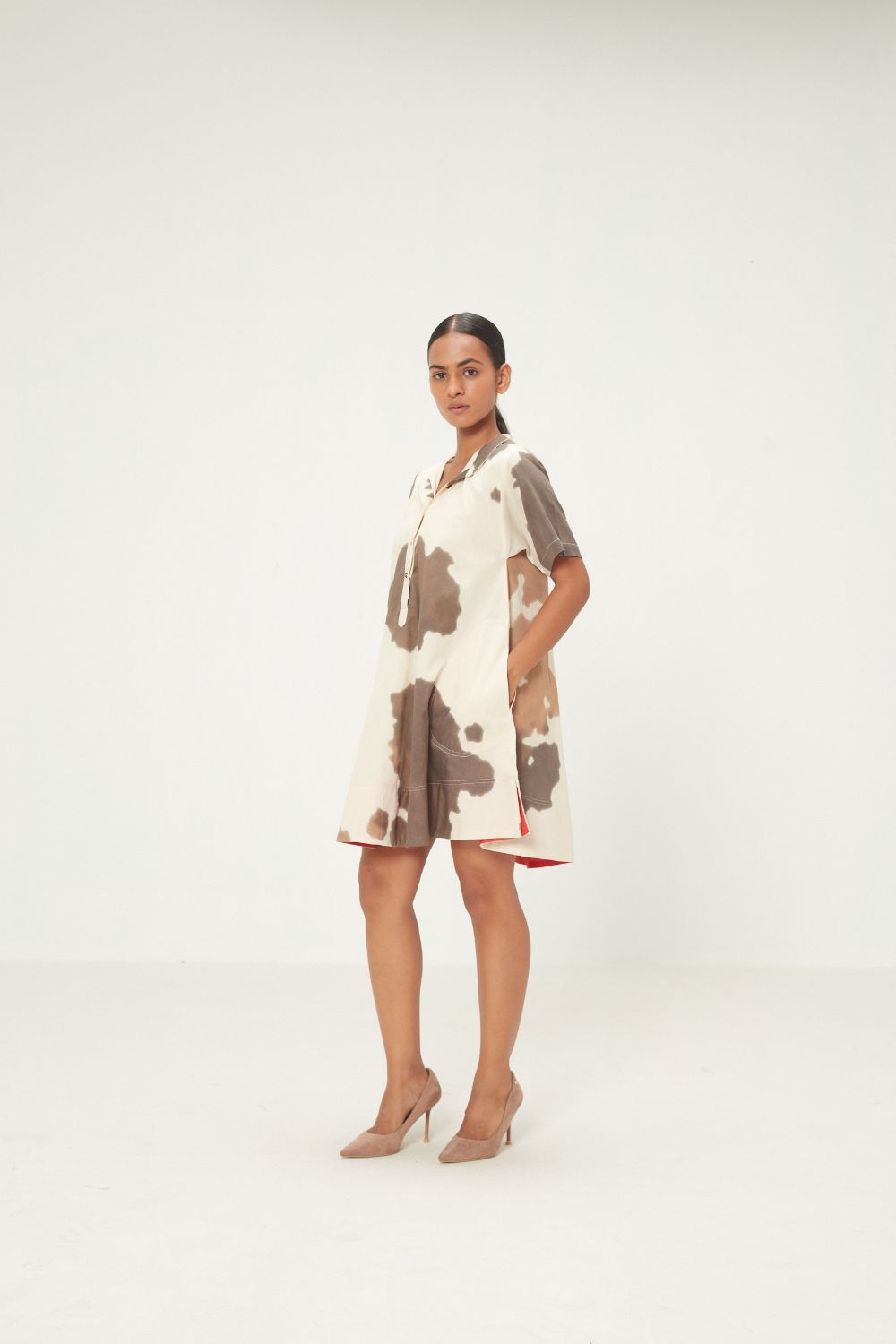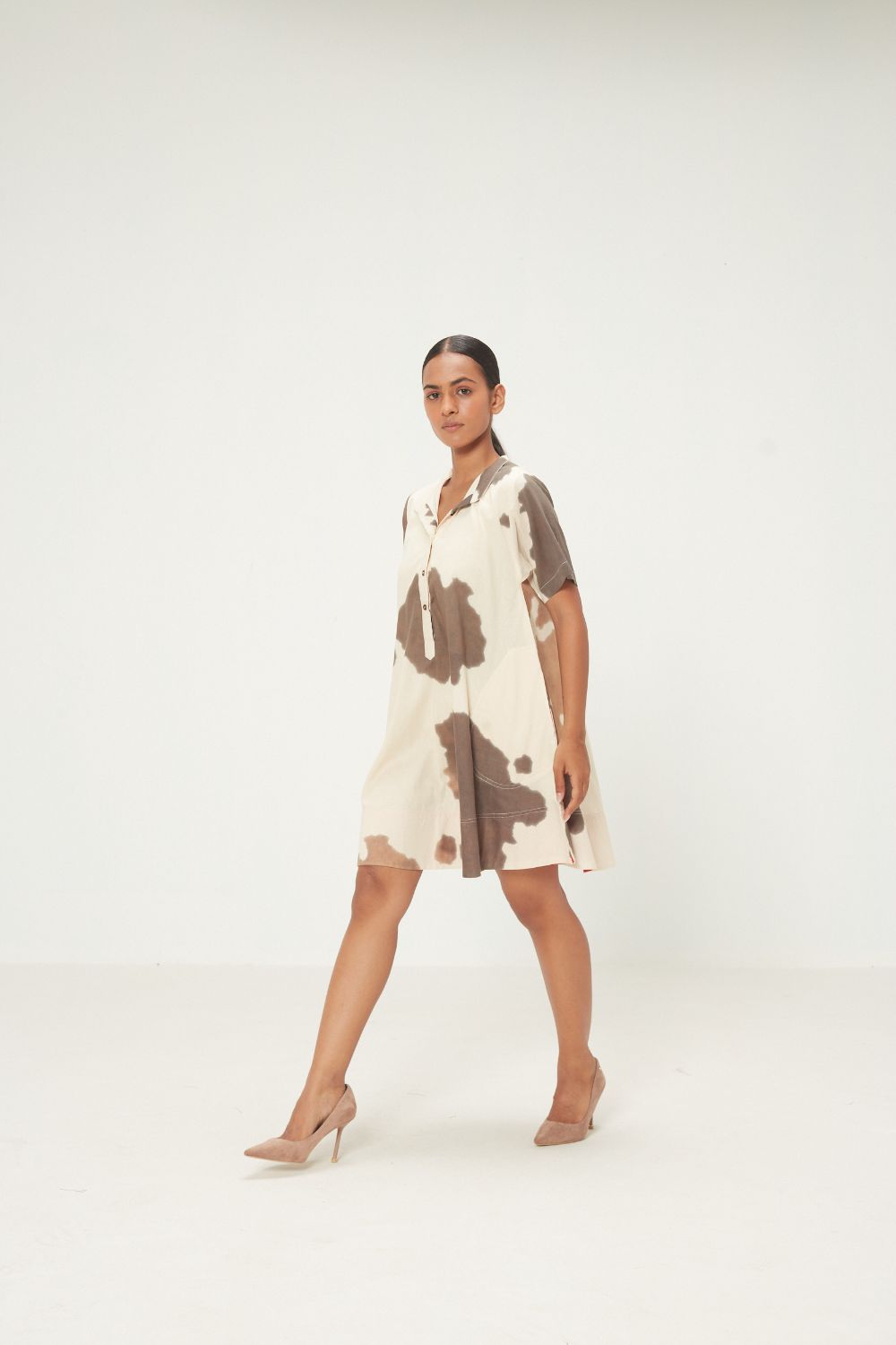 A relaxed shirt dress in soft ivory, scattered with earthy brown abstract patches. Designed with a gentle collar, short sleeves, and a buttoned placket, it falls into an easy A-line silhouette. Subtle stitch details and pockets add function to this quietly expressive, everyday piece.