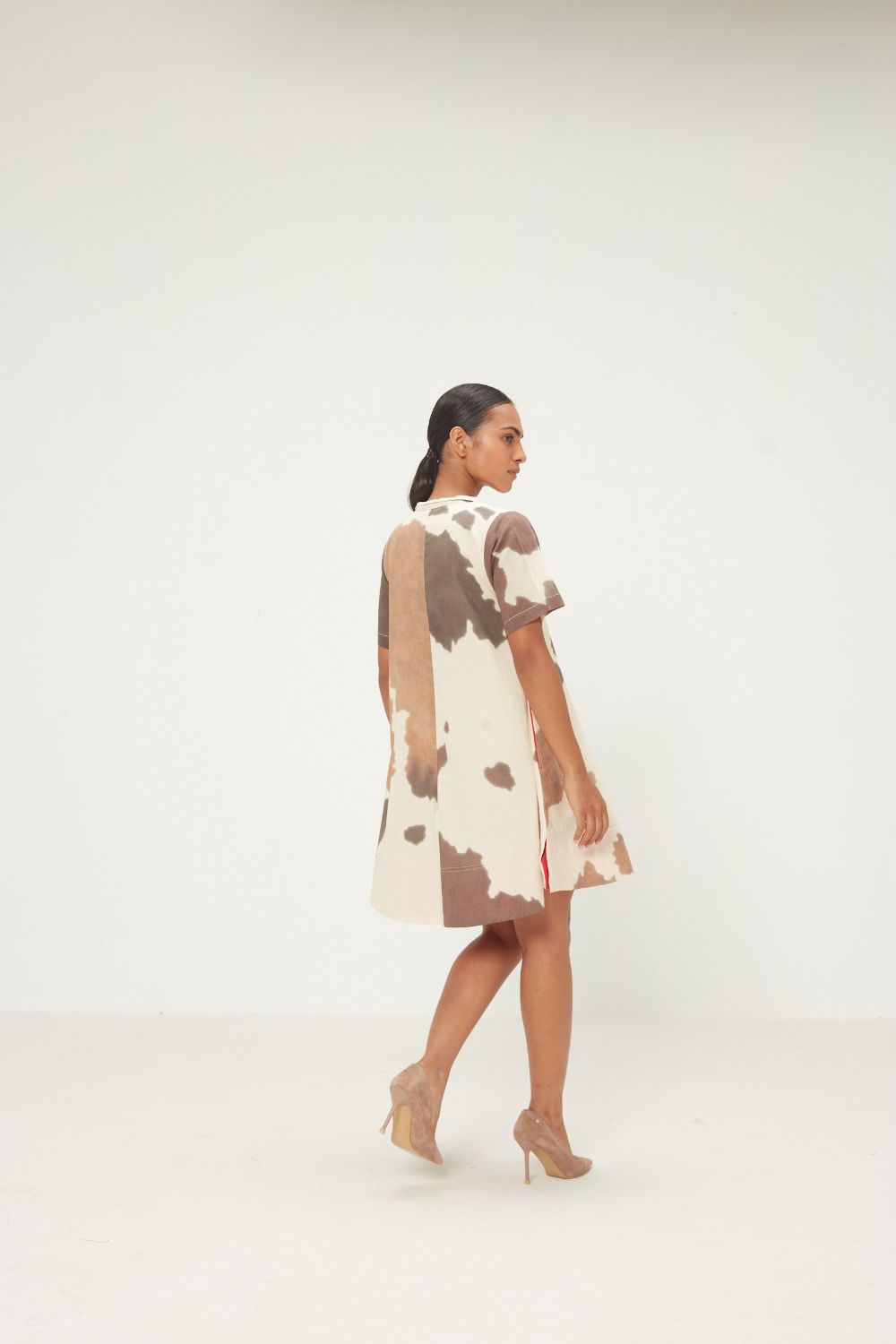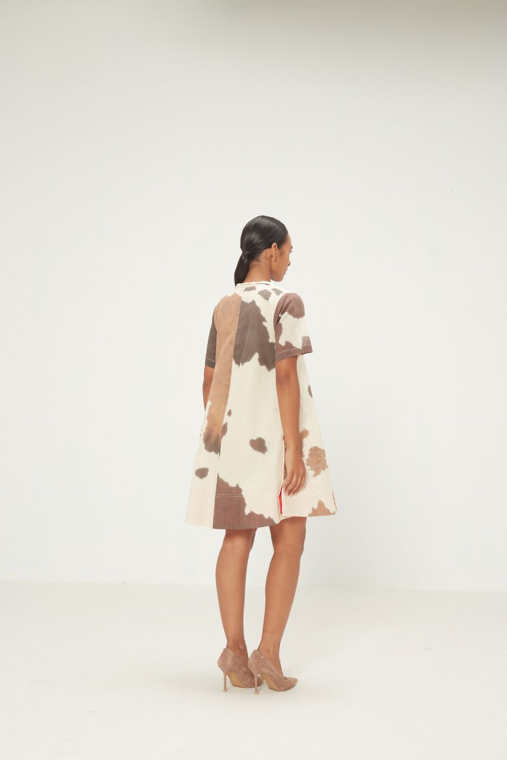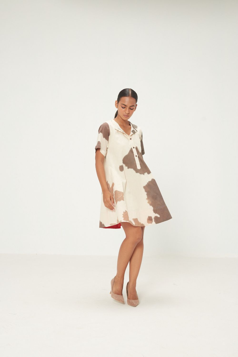 A relaxed shirt dress in soft ivory, scattered with earthy brown abstract patches. Designed with a gentle collar, short sleeves, and a buttoned placket, it falls into an easy A-line silhouette. Subtle stitch details and pockets add function to this quietly expressive, everyday piece.