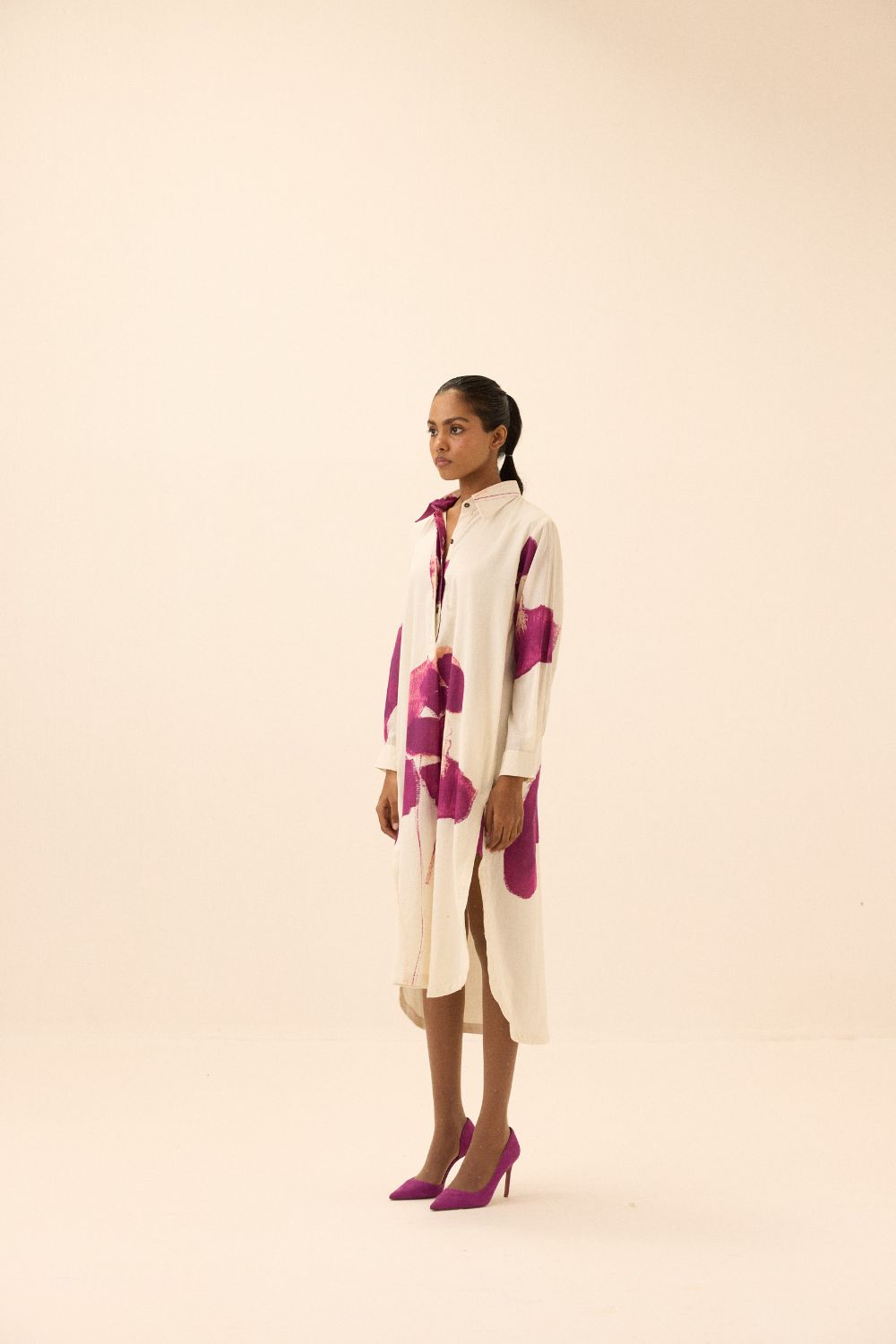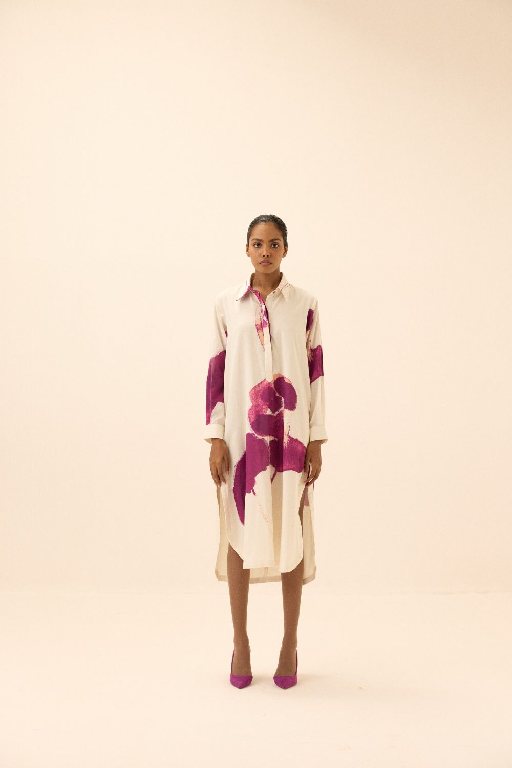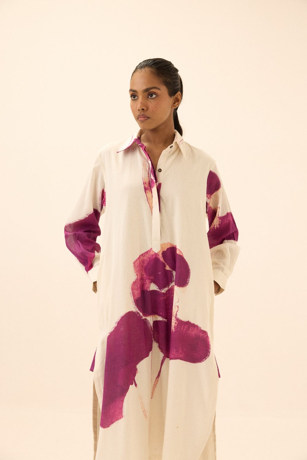 This elegant dress features a delicate blend of mul fabric, with large, vibrant purple floral prints that add a touch of artistic flair. Its relaxed fit and minimalist design create a timeless, sophisticated look.