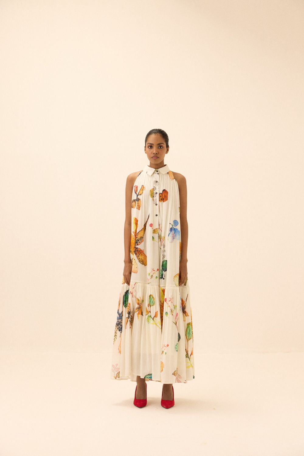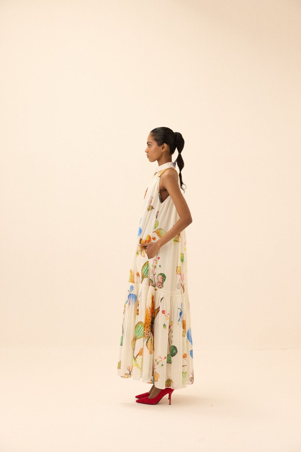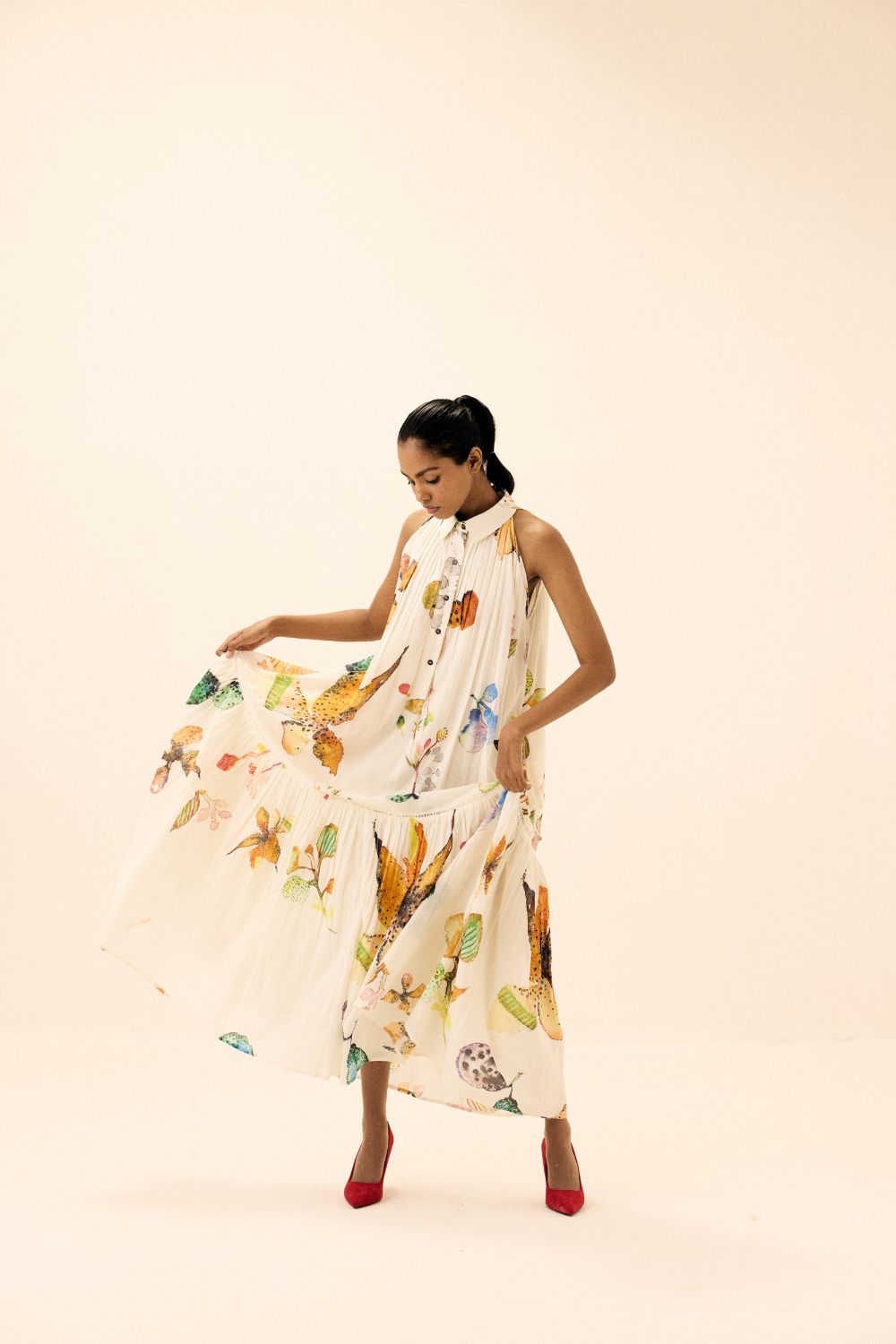 This vibrant, flowy dress is crafted from mul fabric, featuring a beautiful array of floral and botanical prints. Its airy design and pleated details make it a perfect blend of comfort and elegance.