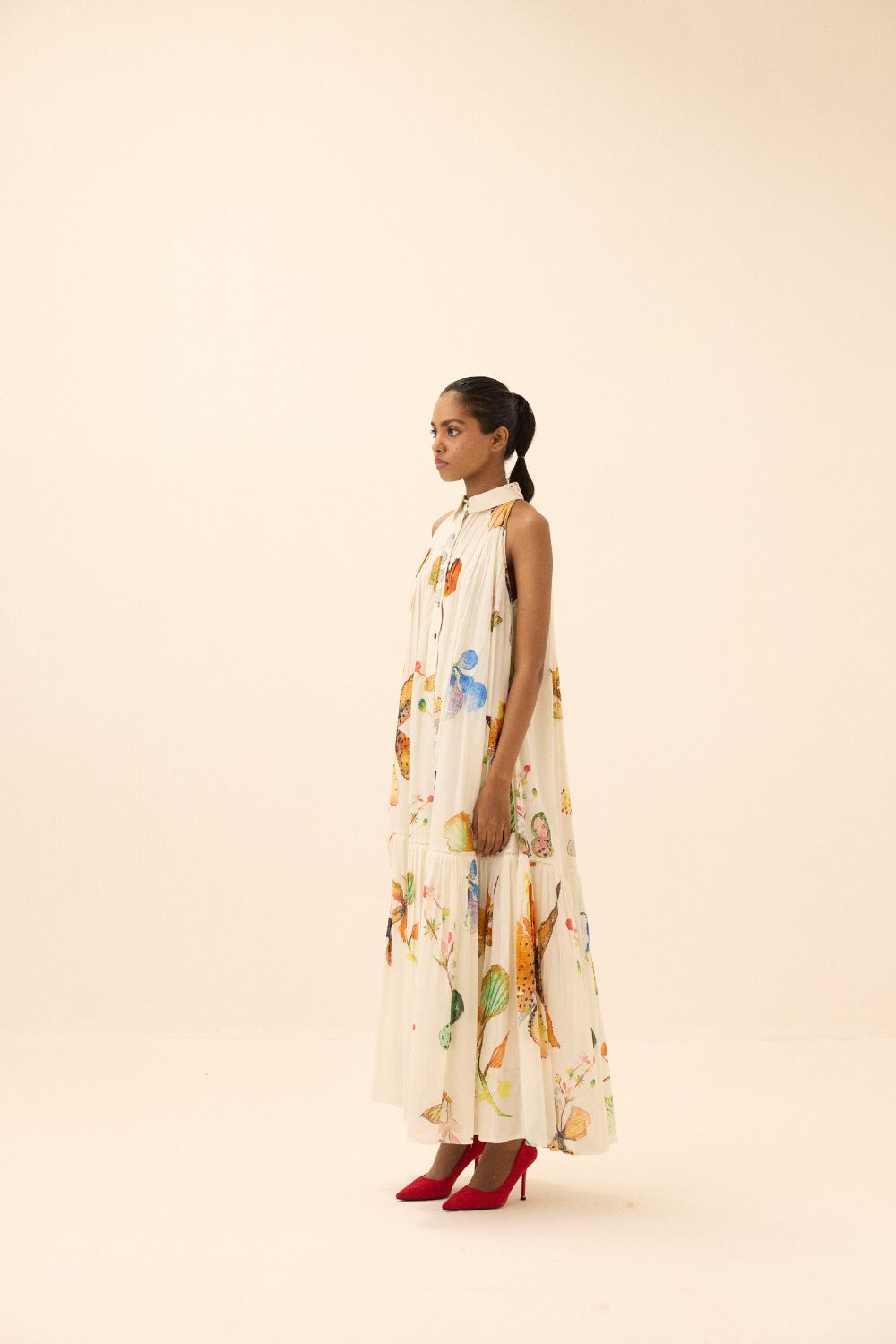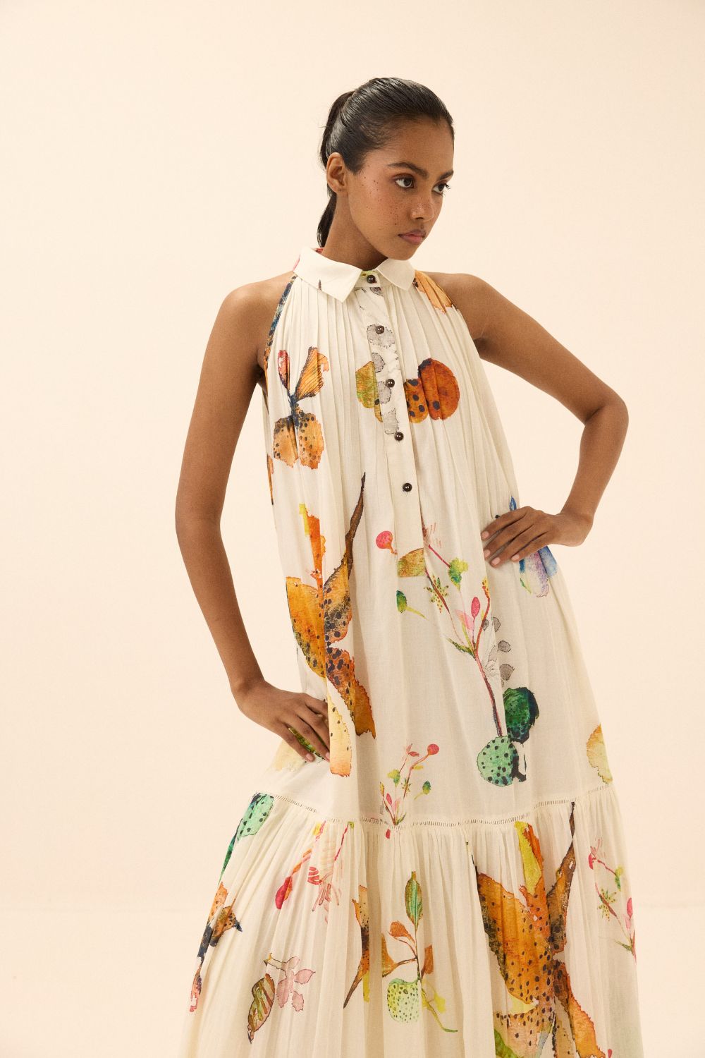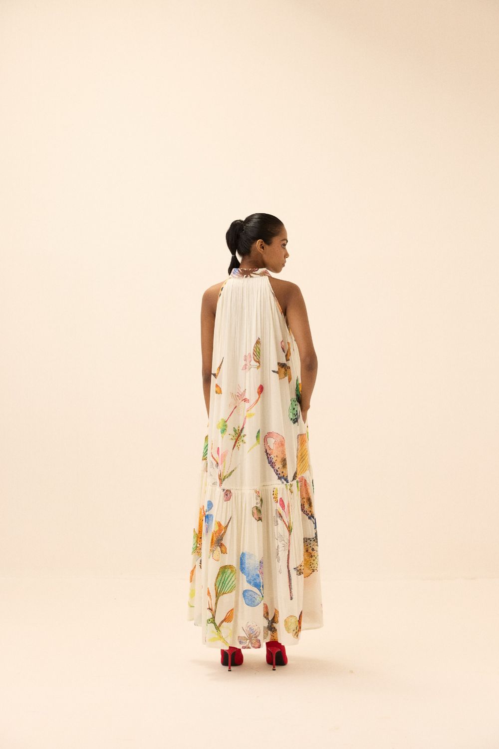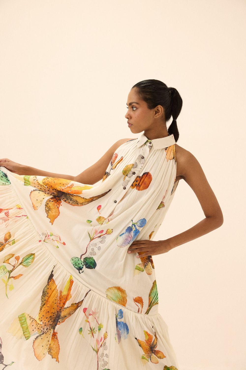 This vibrant, flowy dress is crafted from mul fabric, featuring a beautiful array of floral and botanical prints. Its airy design and pleated details make it a perfect blend of comfort and elegance.