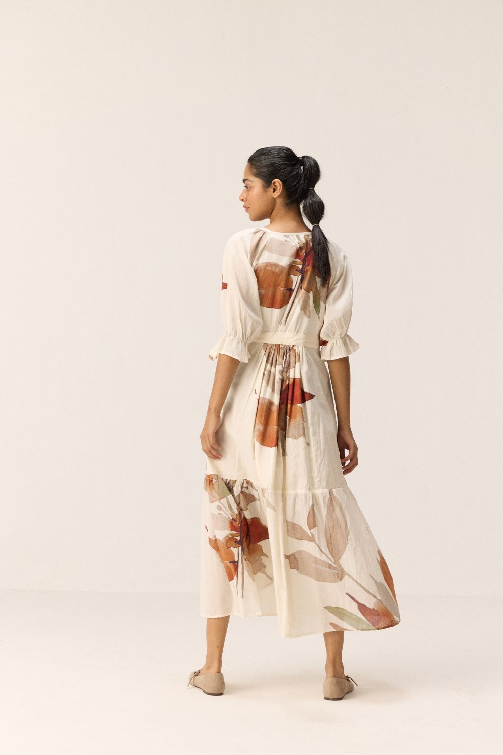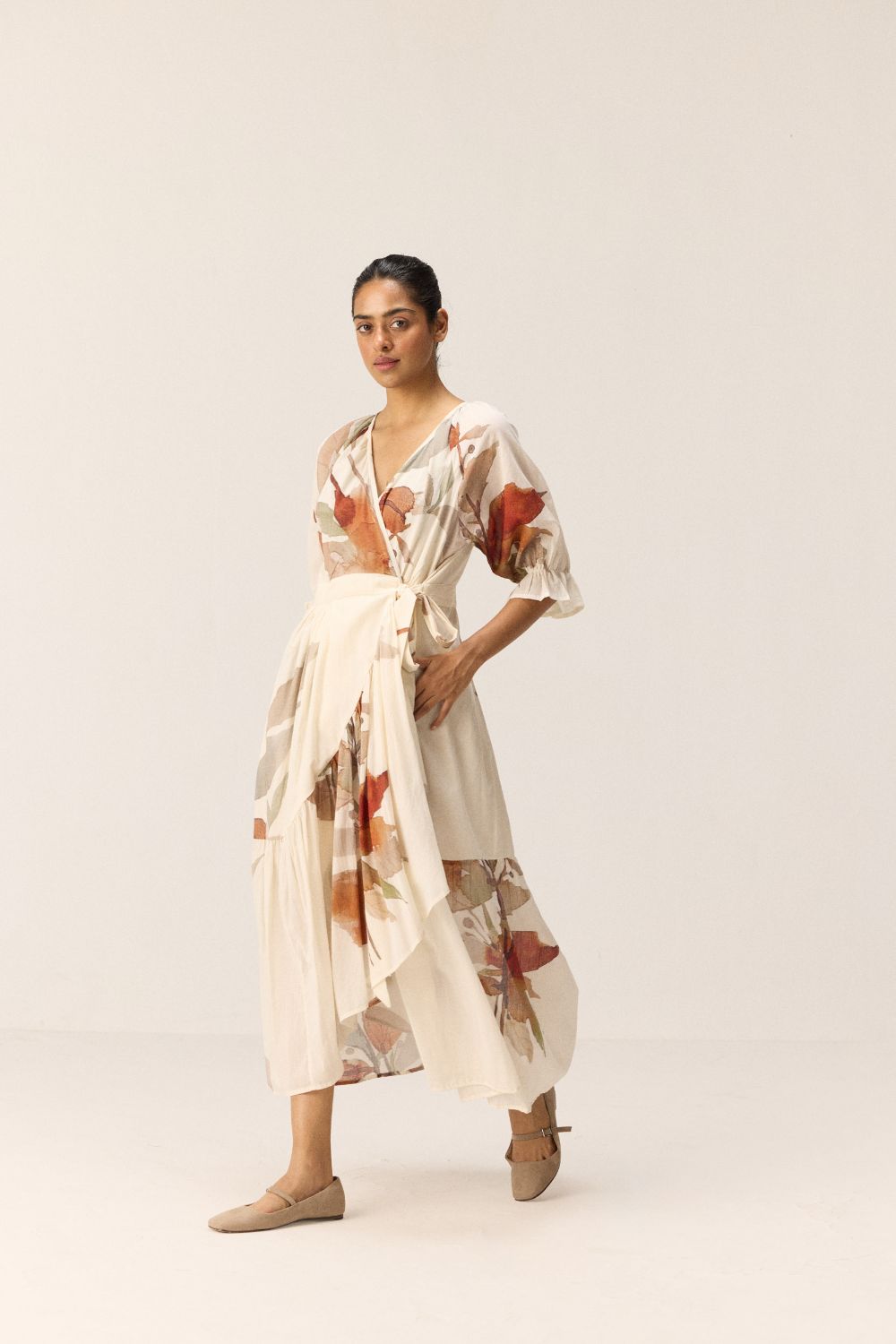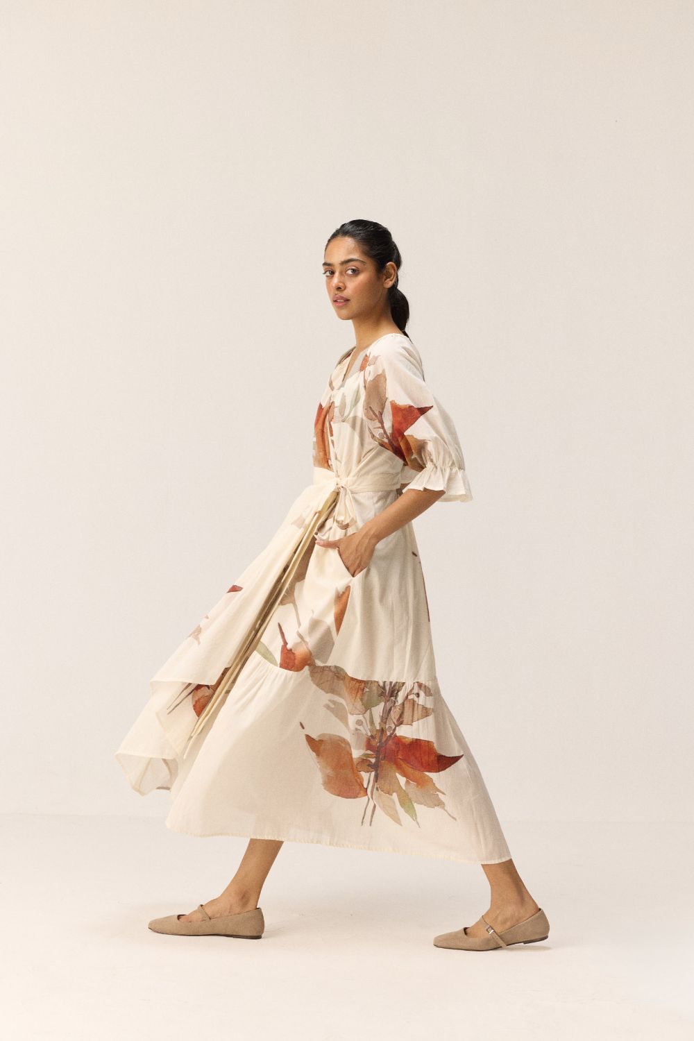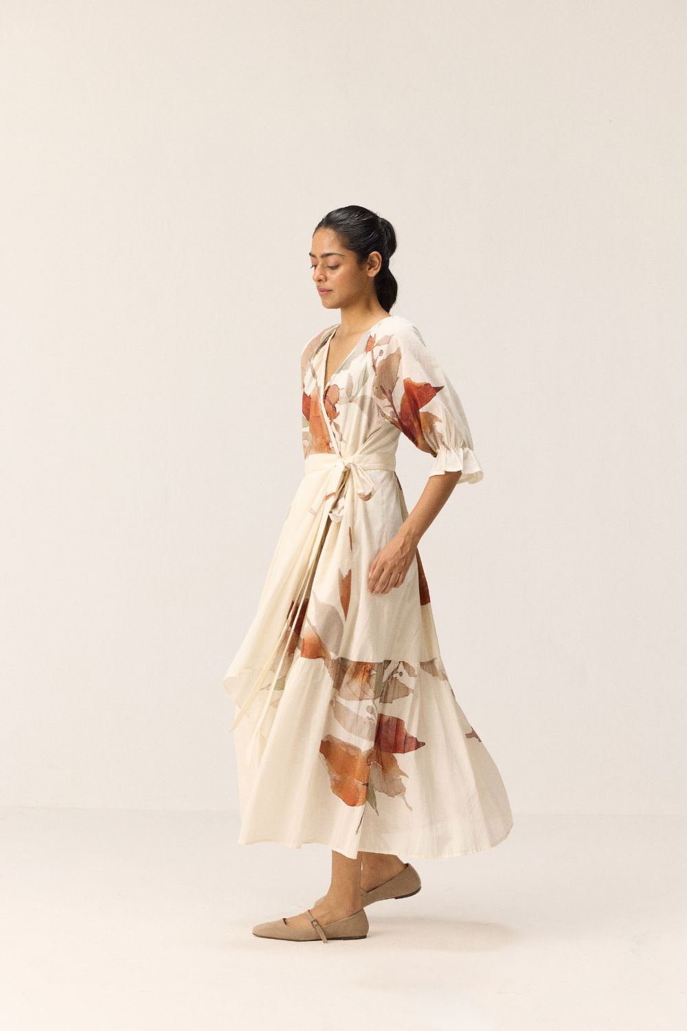 A soft white wrap dress in pure cotton mul, featuring earthy-toned and orange leaf motifs. Designed with distinctive puff sleeves and side seam pockets, it offers an elegant yet easygoing silhouette perfect for warm days.