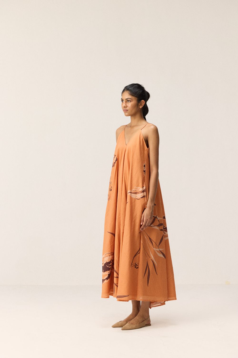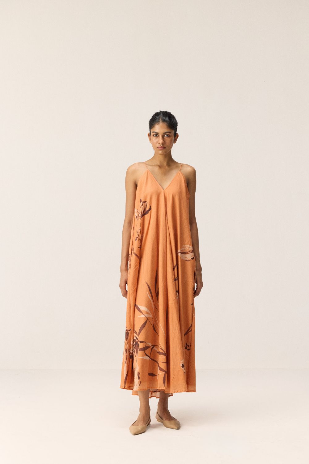 A breezy strappy gown in a vibrant orange hue mul, brought to life with soft, nature-inspired abstract prints. Cut in an easy silhouette with side pockets for comfort and function, it’s made for sun-drenched days and slow summer evenings.
