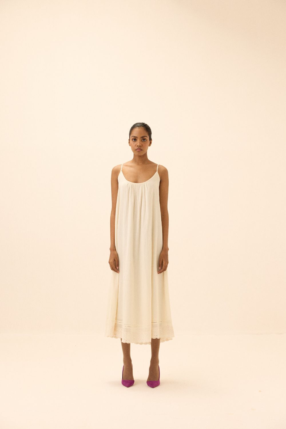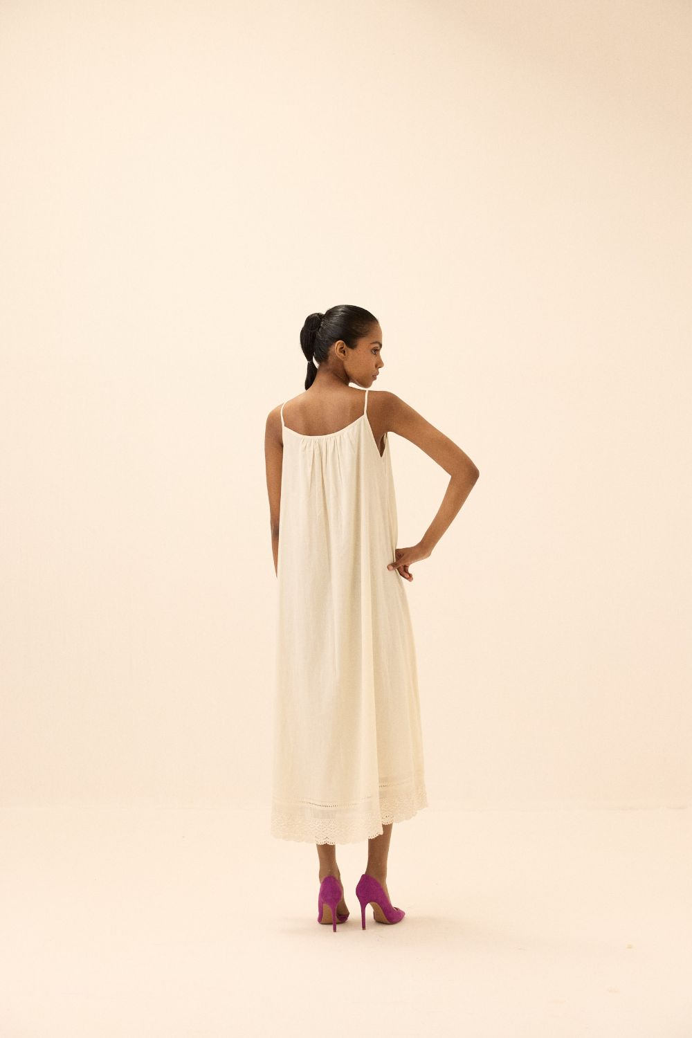 A single-step white dress with a graceful round-neckline, flowing effortlessly for an airy, gorgeous silhouette.