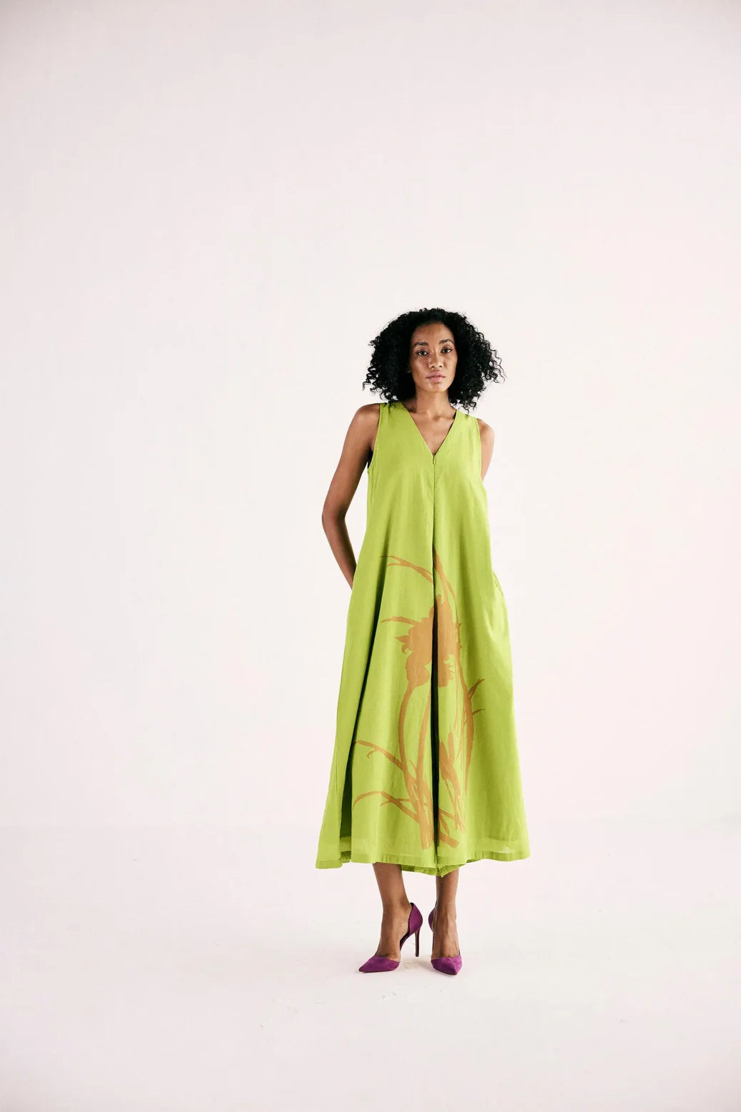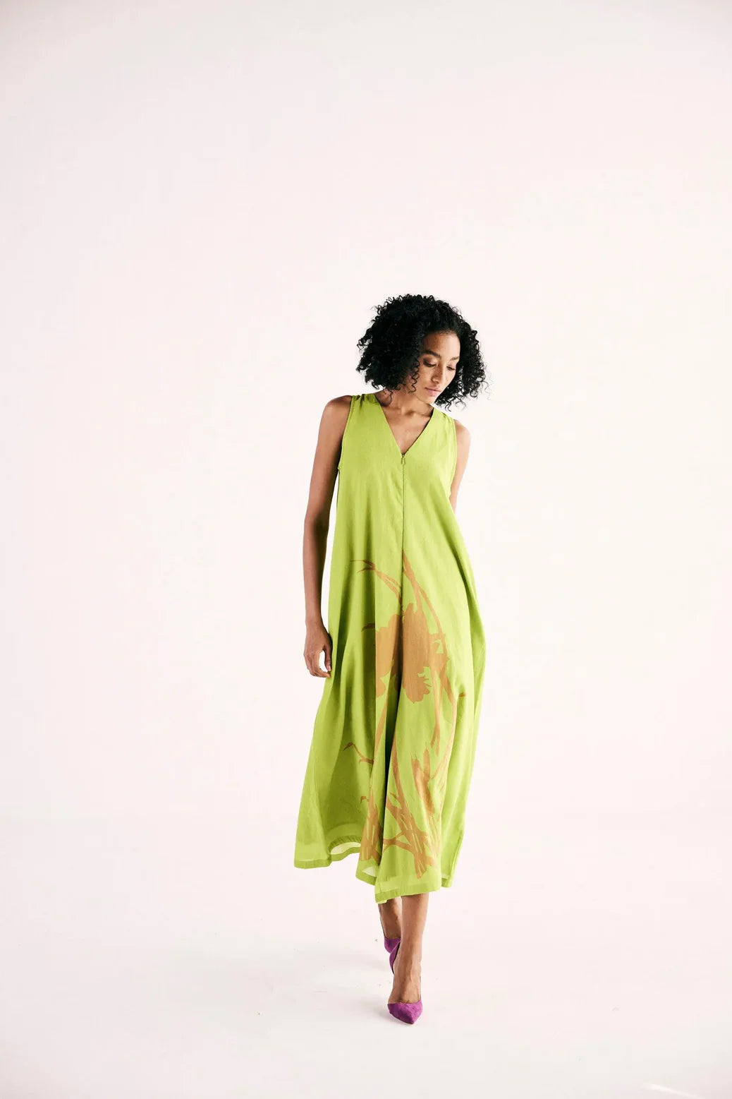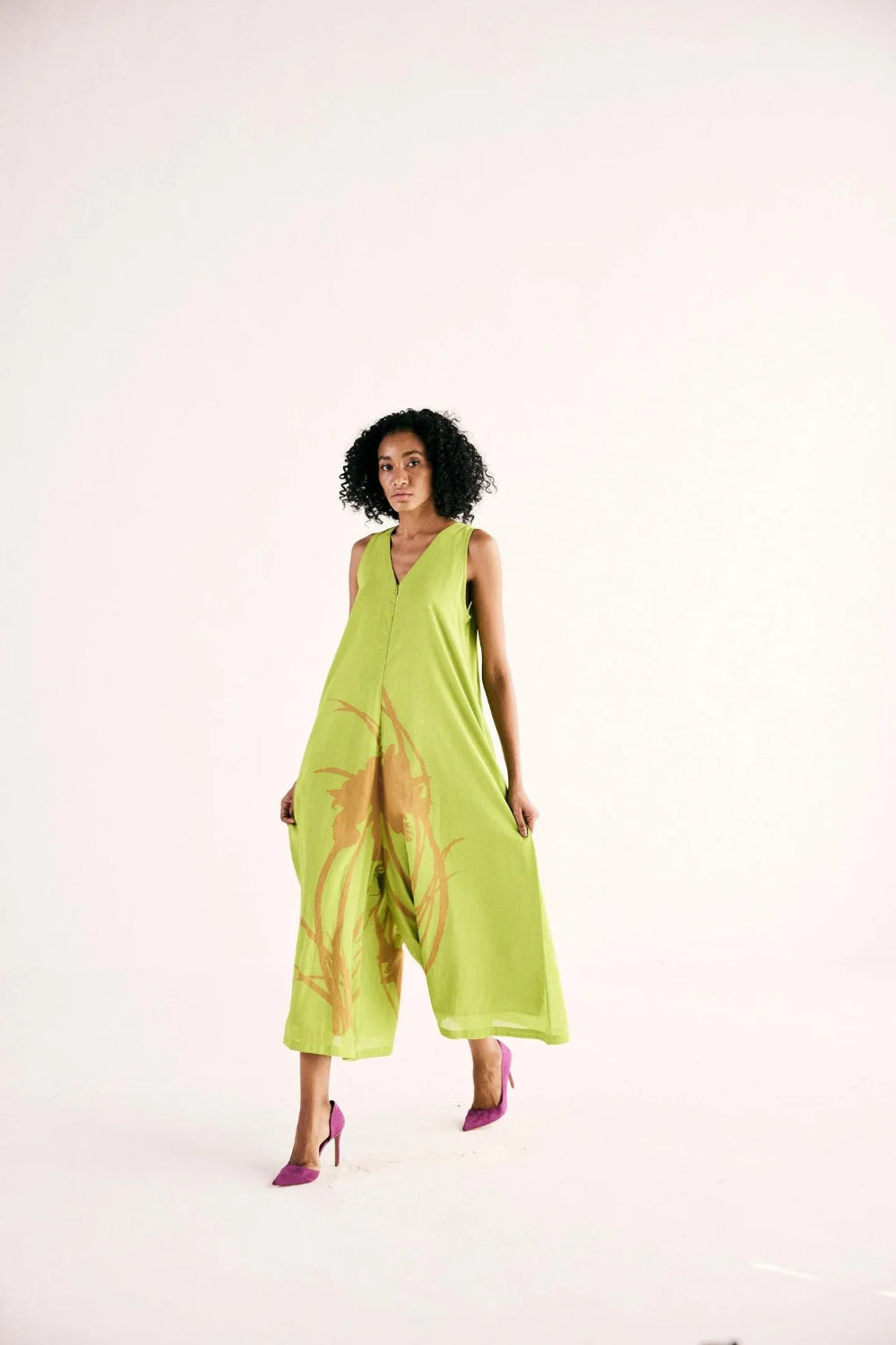 A lime green jumpsuit with a front zipper opening and v neckline in classic A line silhouette. crafted in soft breathable cotton mul.