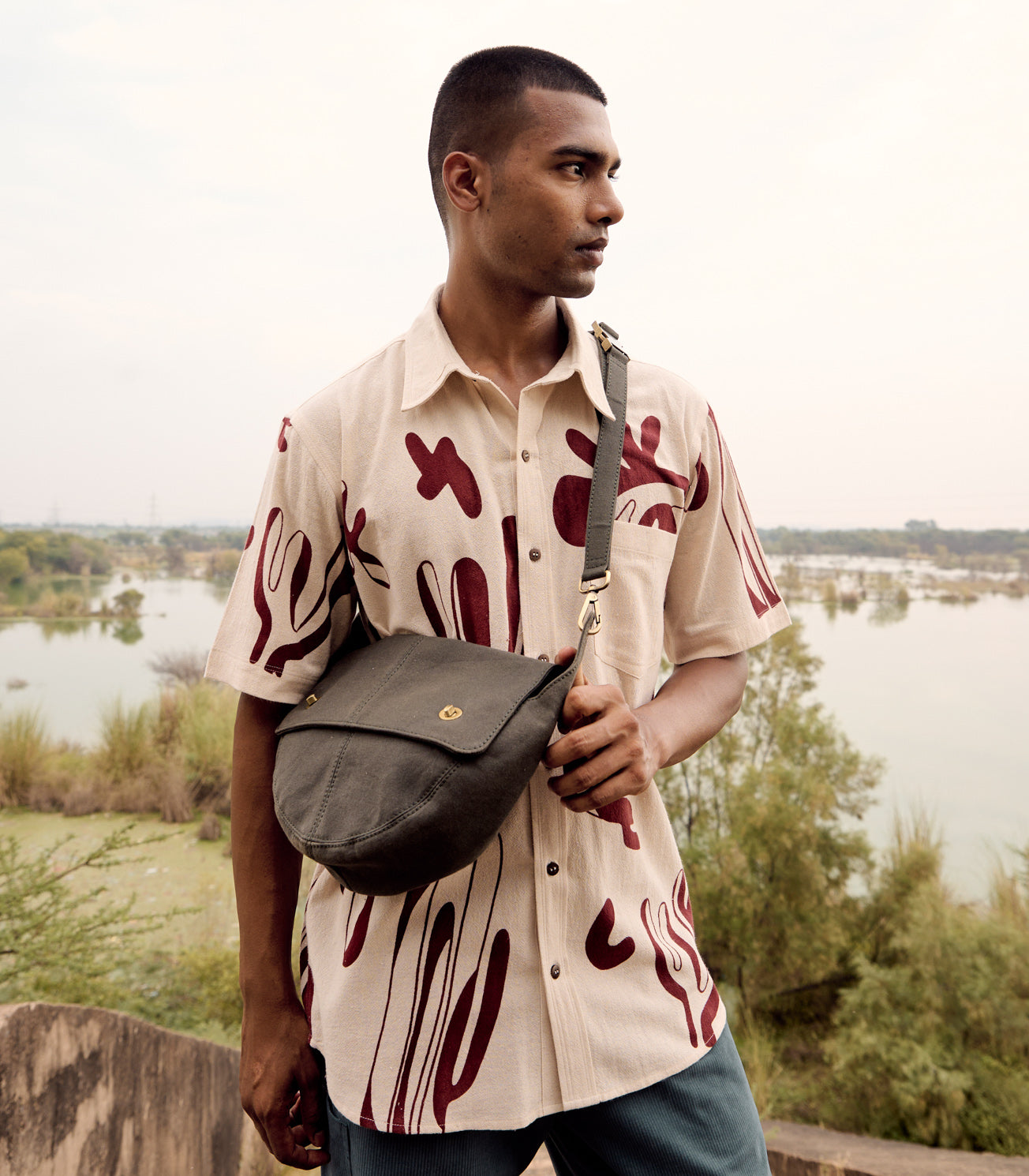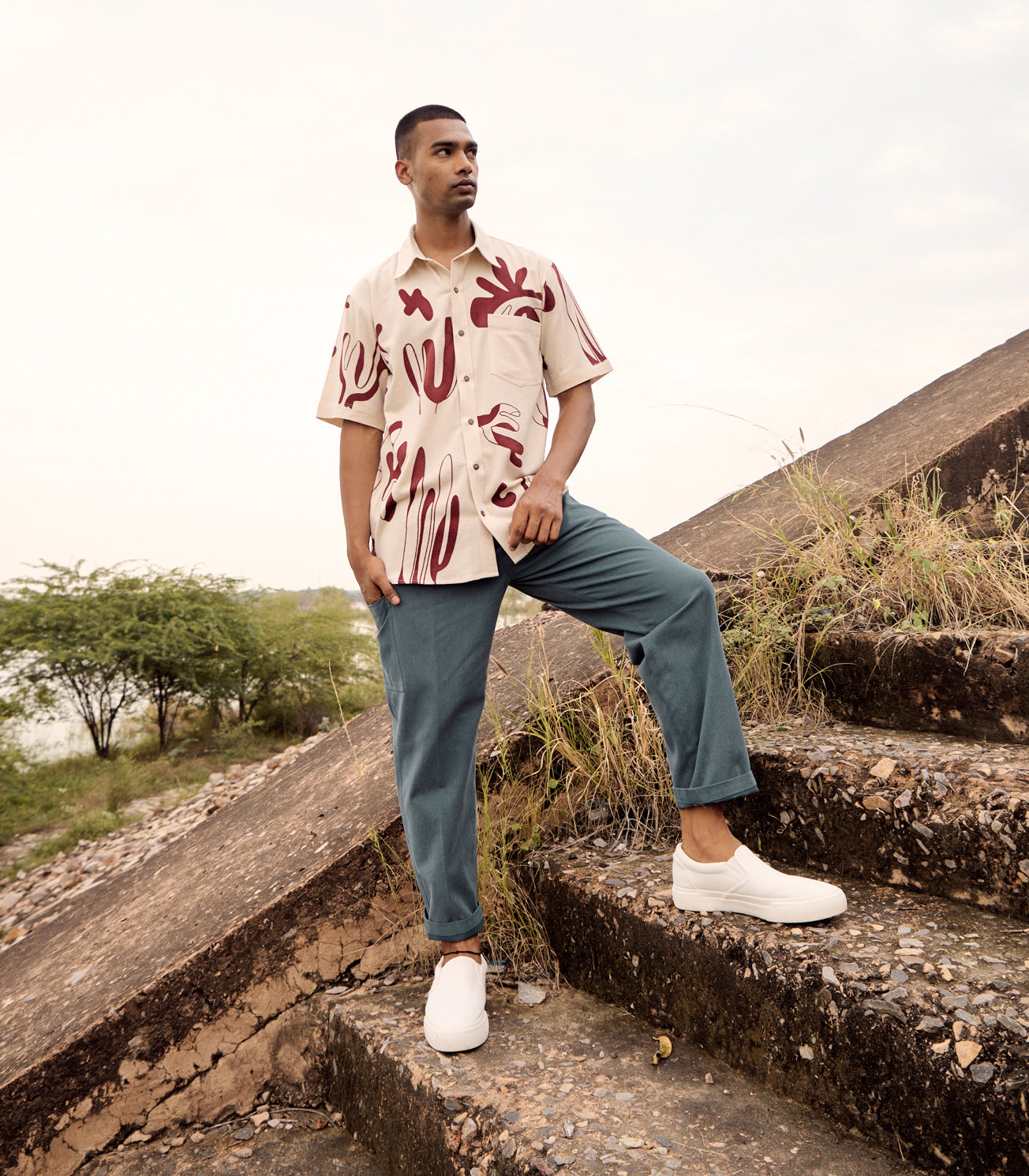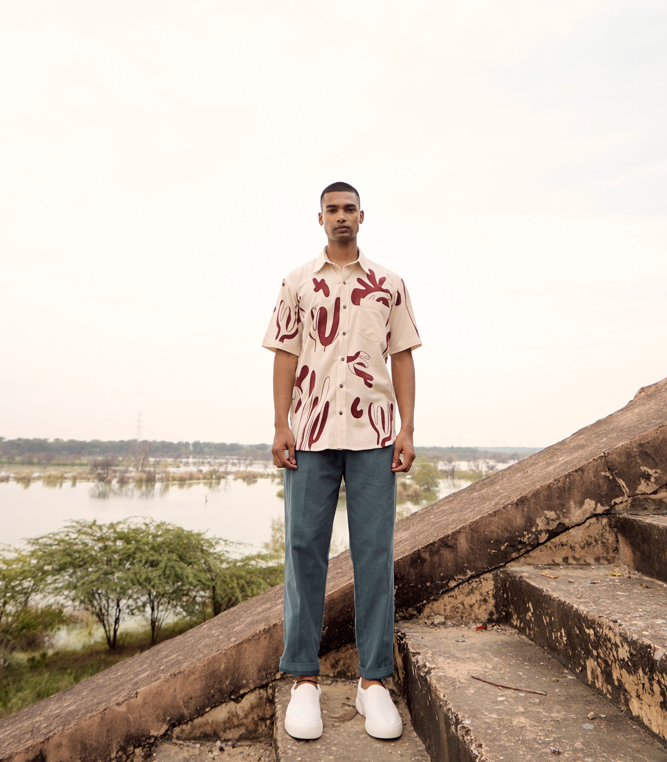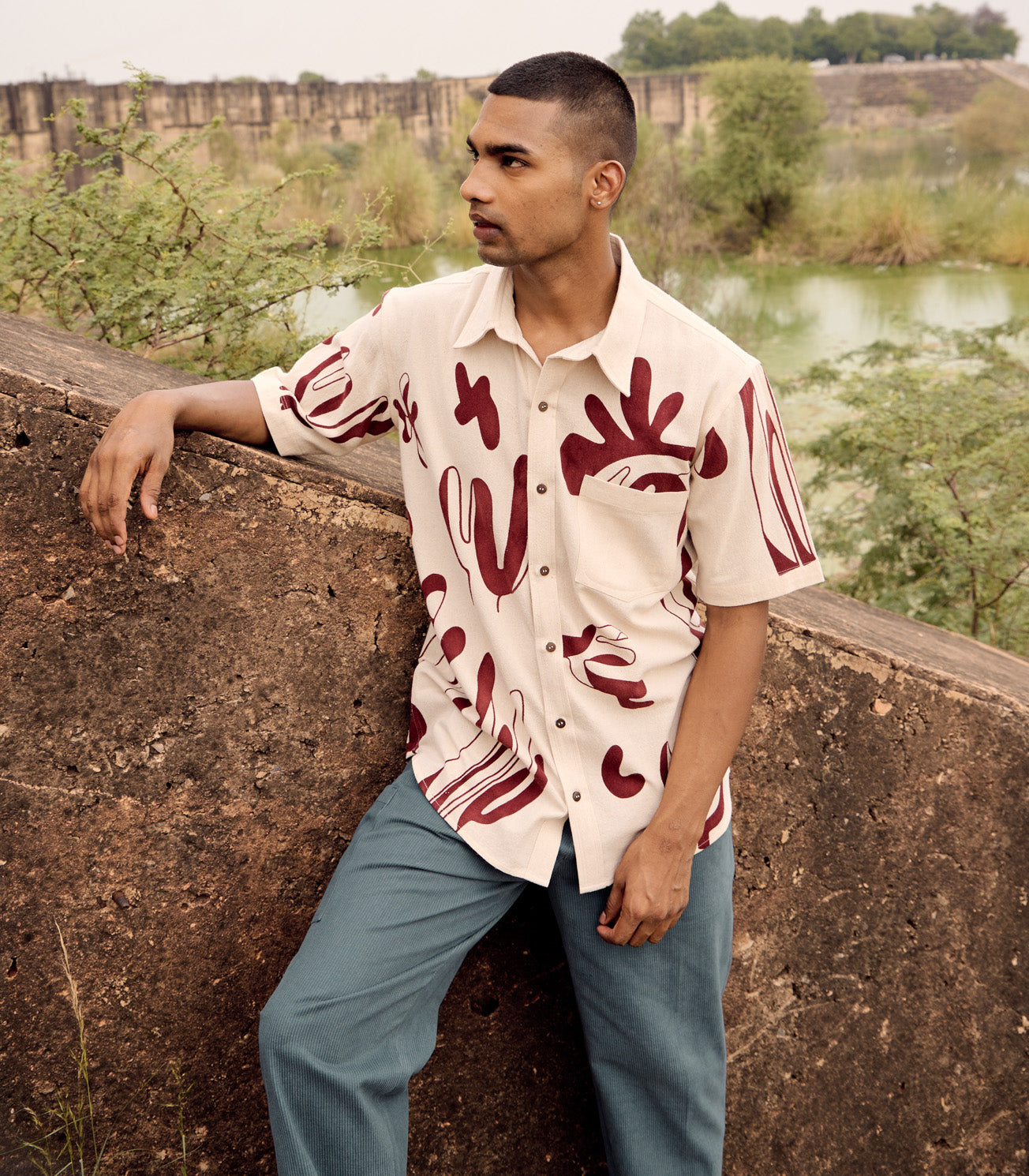 An cream white lino print dobby cotton shirt with half sleeves, spread collar and a patch pocket up front.