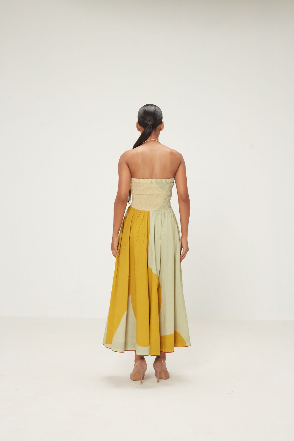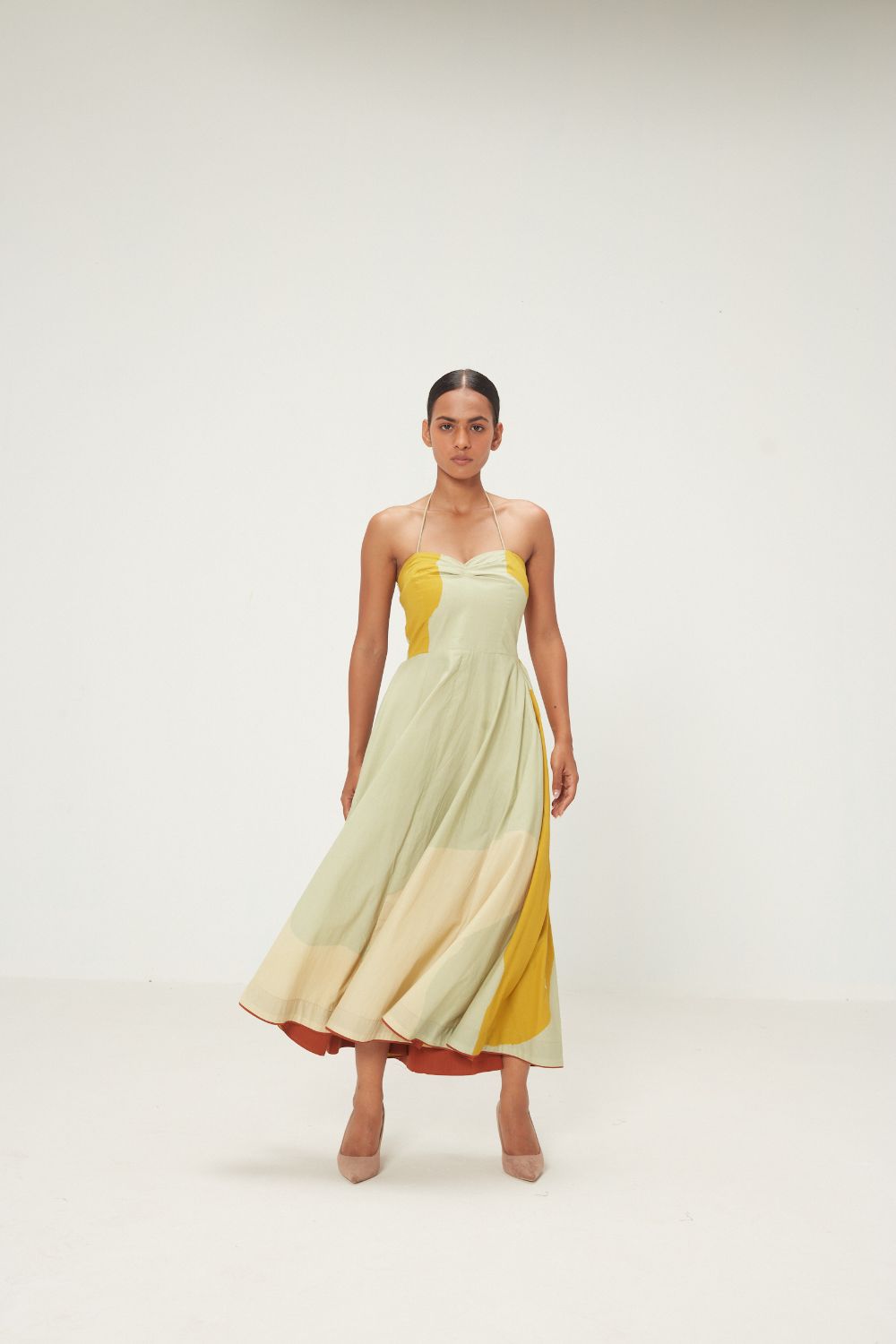 Pickle halter-neck midi dress is crafted in soft cotton, it features a gentle abstract colour block in earthy yellow, muted green, and warm cream. The fitted bodice flows into a flared skirt, creating movement that feels light and easy - perfect for a sunlit day or a leisurely evening. Subtle detailing at the neckline adds a touch of grace, making this piece both comfortable and quietly striking.
