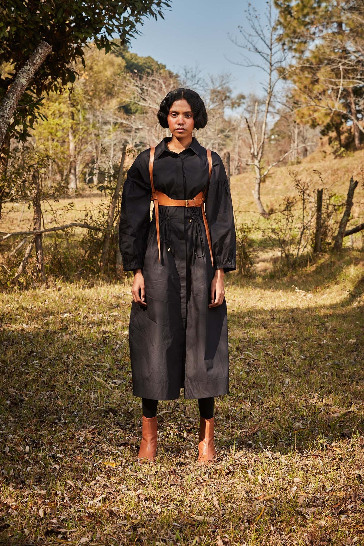 classic black poplin dress with an adjustable and elasticated drawtring waist, designed for a comfortable fit that flatters all body types. Its timeless style makes it a versatile wardrobe staple.
