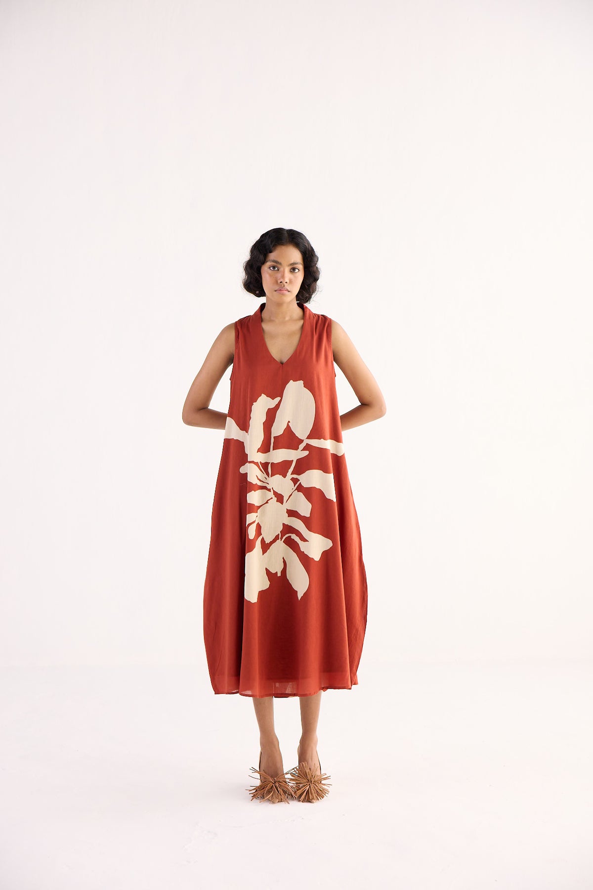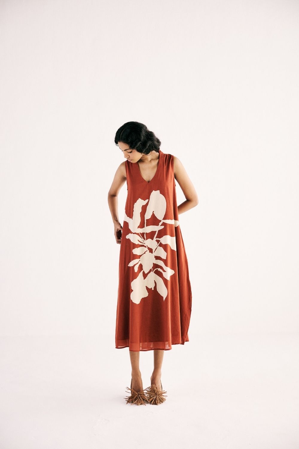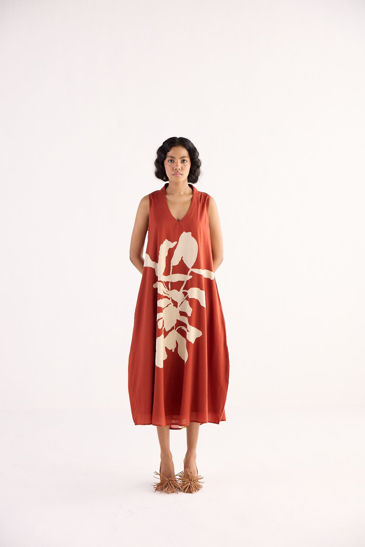 A classic brick red A line midi dress, featuring a v neckline crafted from breathable soft cotton mul fabric. adorned with a statement print.