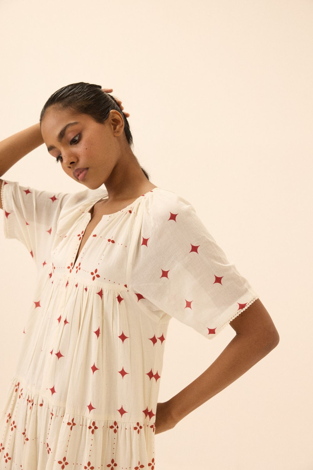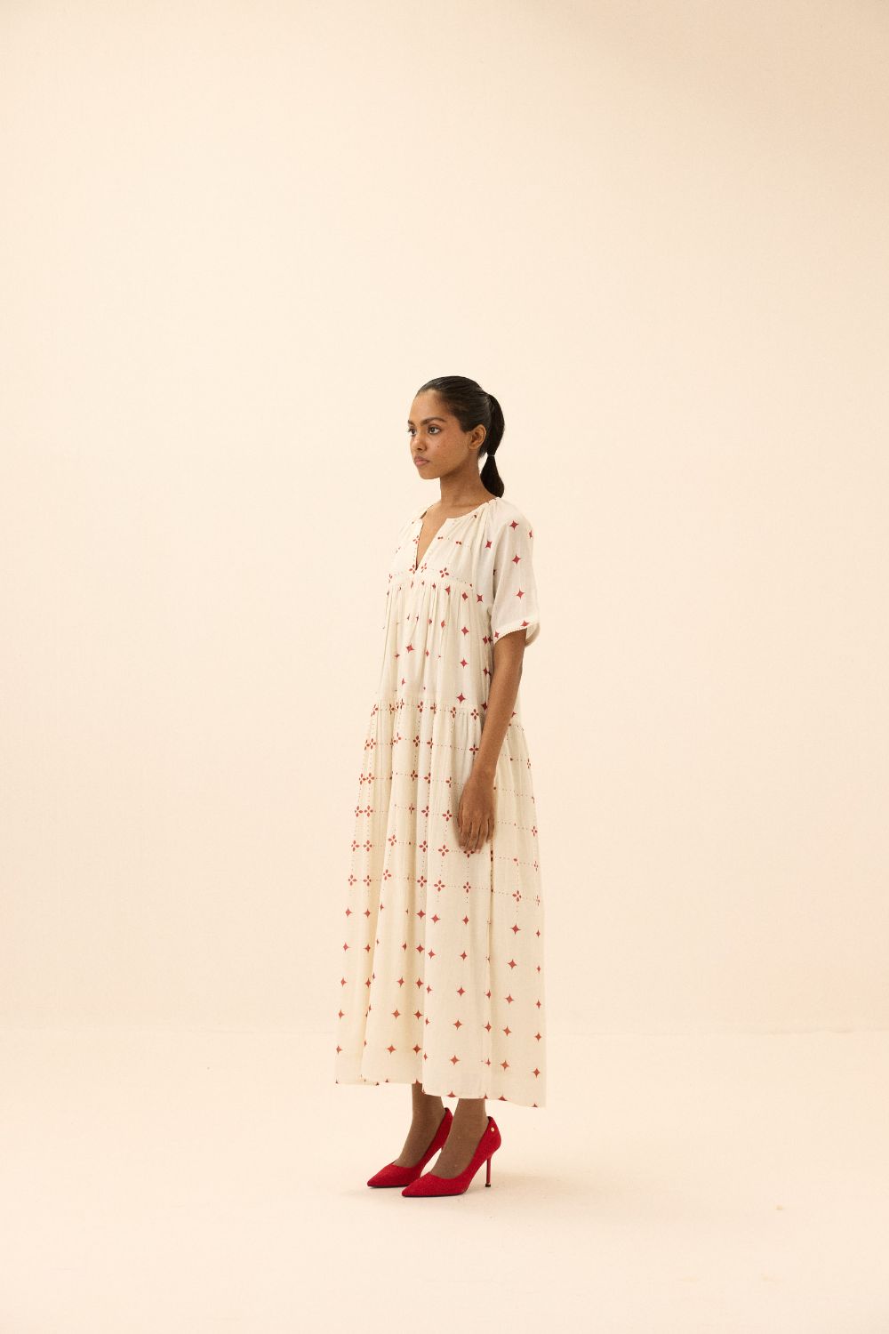 A flowy ankle-length silhouette in pristine white, this dress is defined by its clean V-neckline and subtle geometric pattern which makes it versatile for everyday ease.
