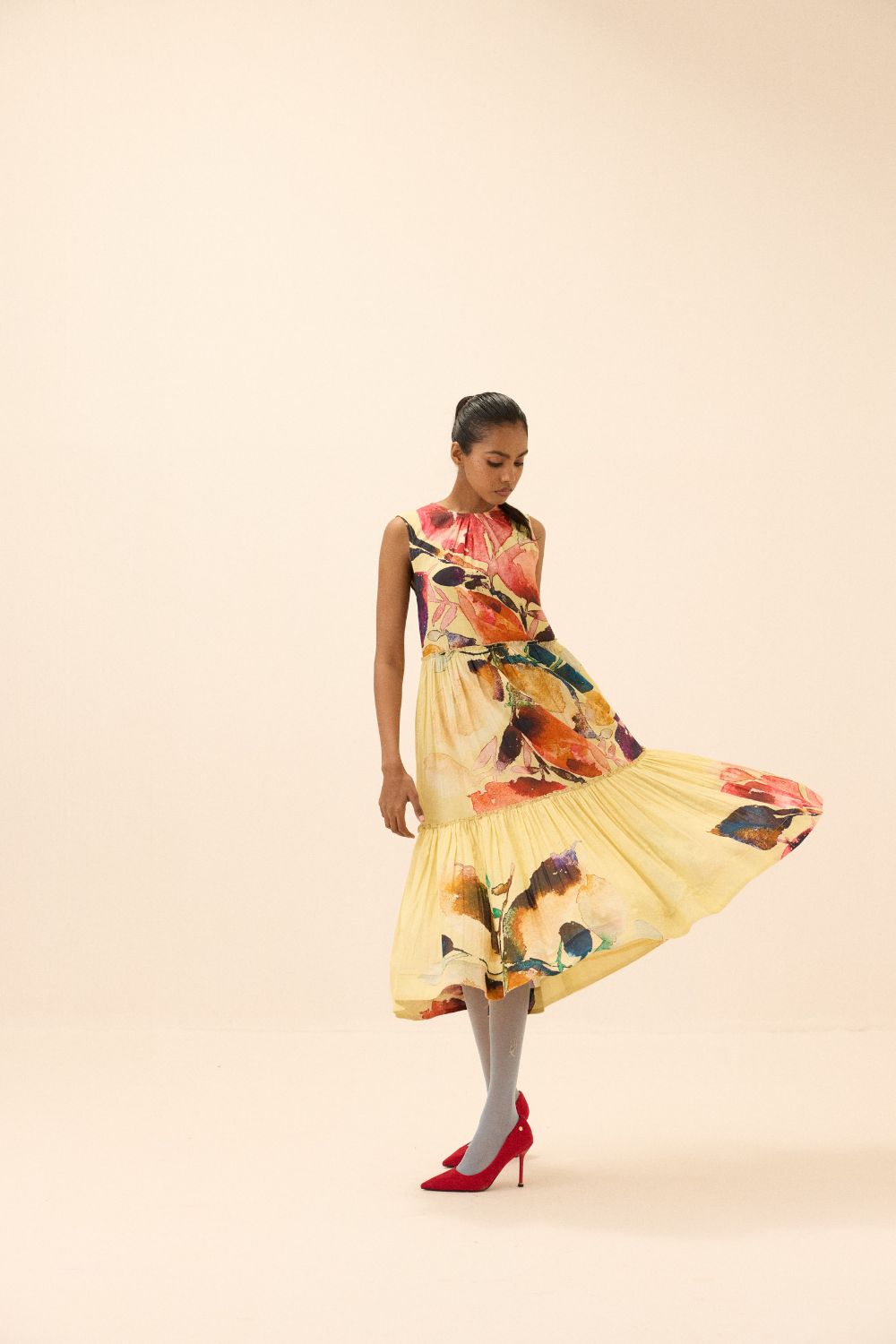 This dress is made from delicate mul fabric, featuring a vibrant floral print that exudes a lively, artistic vibe. Its tiered design and soft yellow base create a bright, flowy silhouette perfect for a sunny day