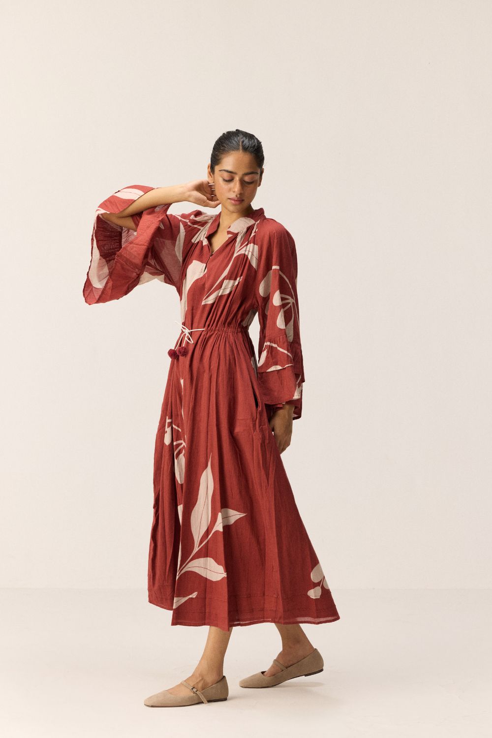 This brick red dress, patterned with soft beige abstract prints, features tiered sleeves and an added tier at the hem for subtle volume. The drawstring waist allows for a flexible fit, while side pockets add everyday ease. Crafted in breathable cotton mul, it’s made for sunlit days and slow, golden hours.