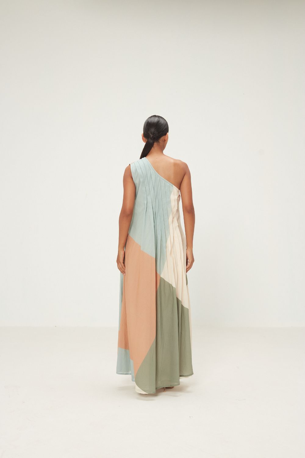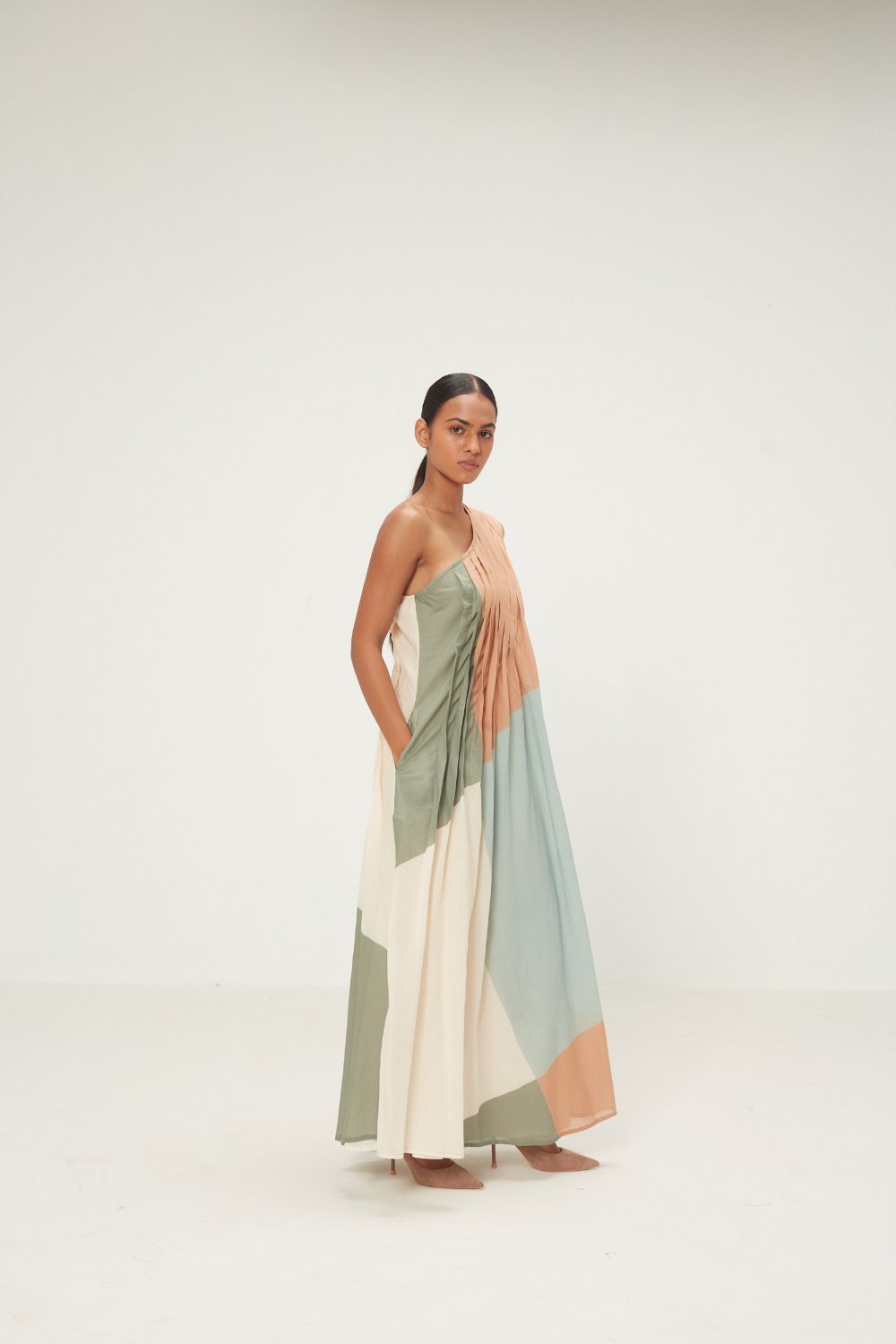 A one-shoulder maxi dress in lightweight cotton mul, designed with color-block panels in soft earthy pastel tones. The pleated neckline adds structure while the fluid, flared silhouette moves with ease. Finished with side pockets, this dress blends statement style with everyday comfort - ideal for both day wear and evening outings.