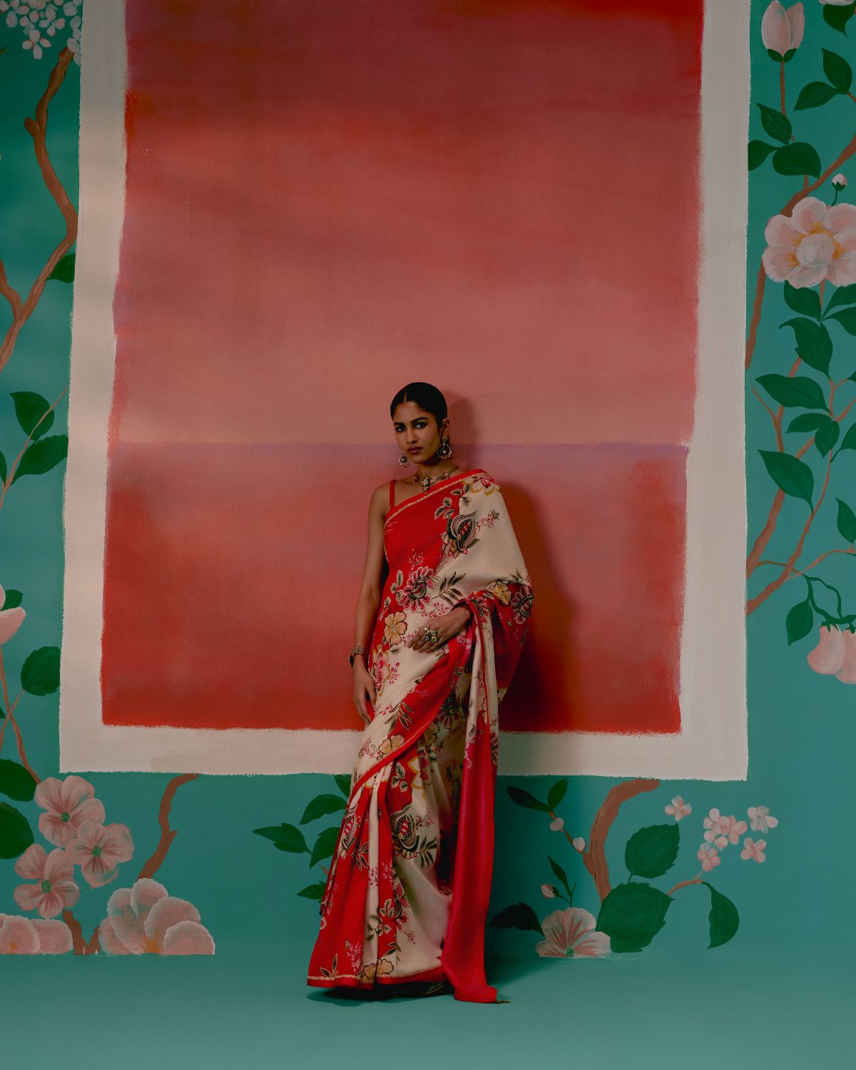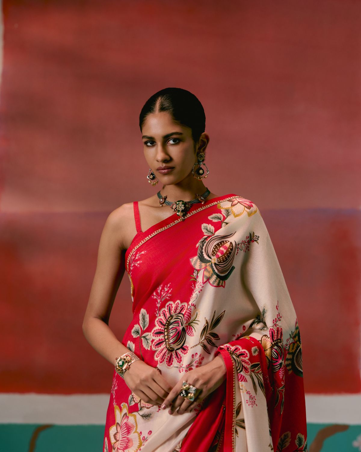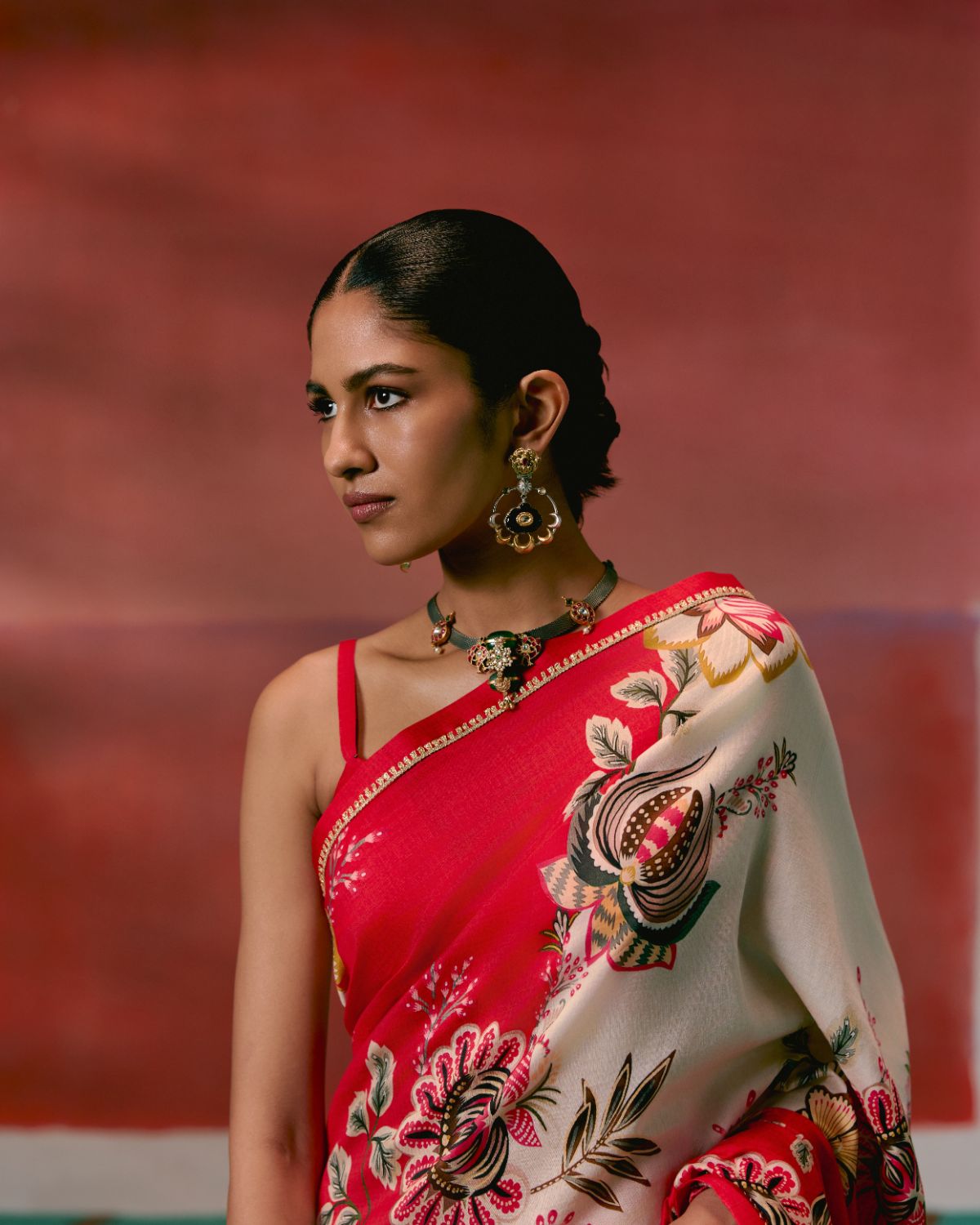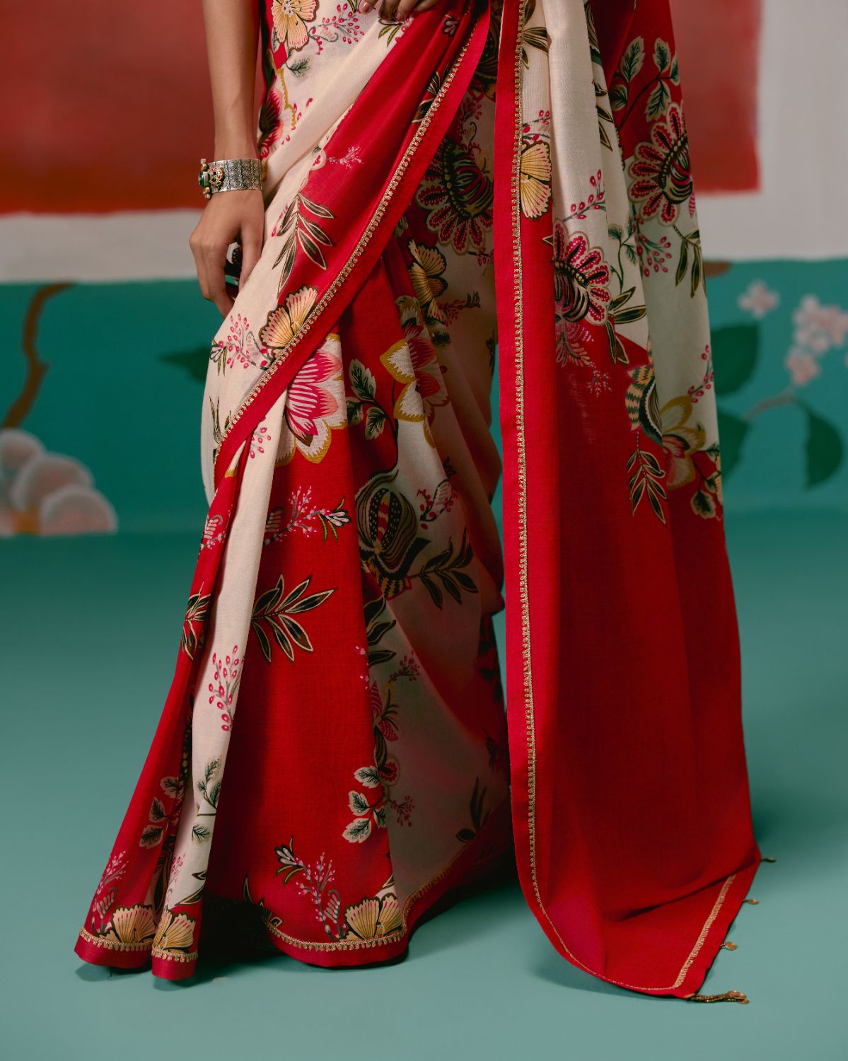 The Ecru & Red Floral saree features an ecru base brought to life with striking red floral motifs that lend it a timeless yet festive appeal. Lightweight and fluid, it drapes with ease, while the pallu is finished with handcrafted tassels that add a playful, artisanal charm.