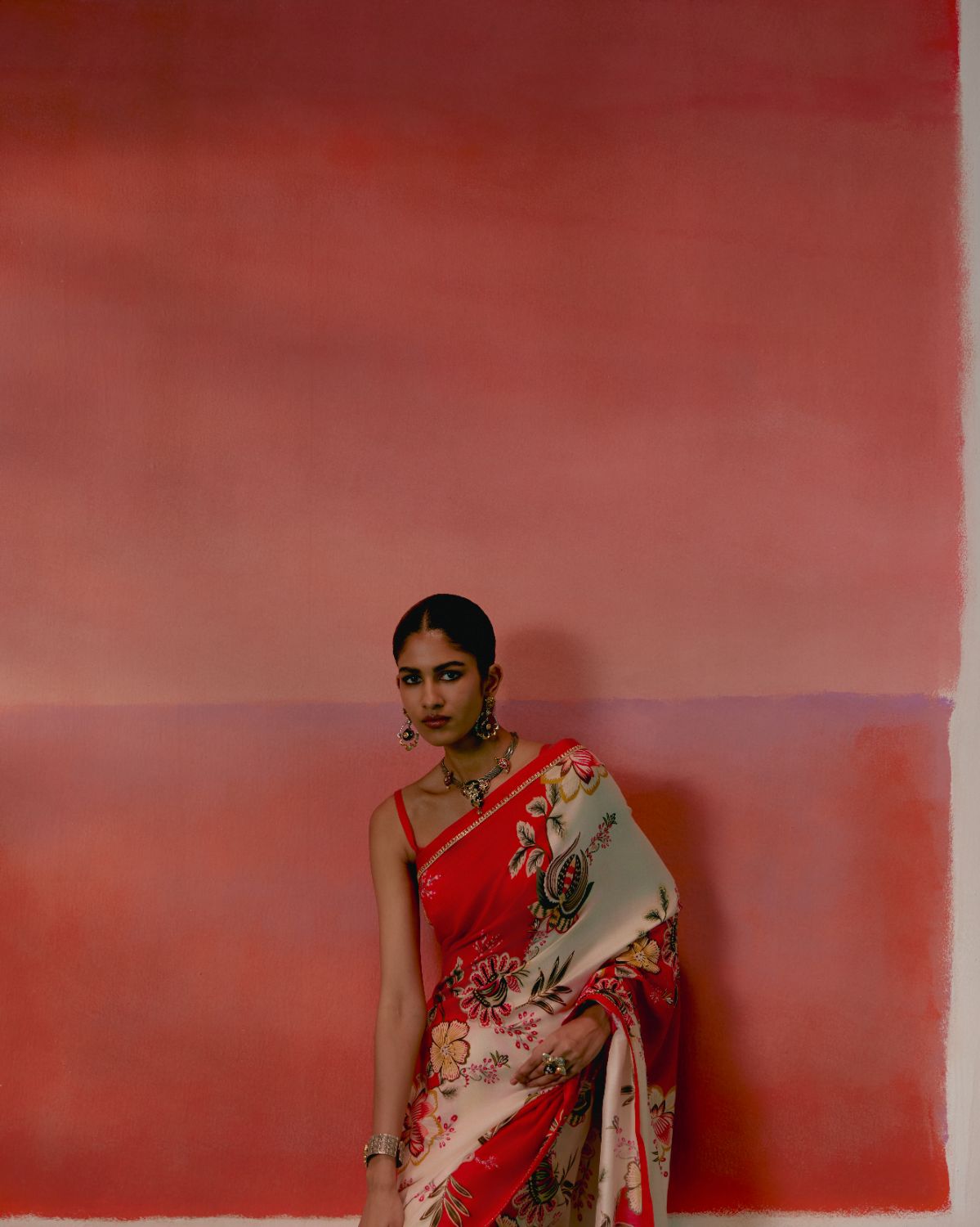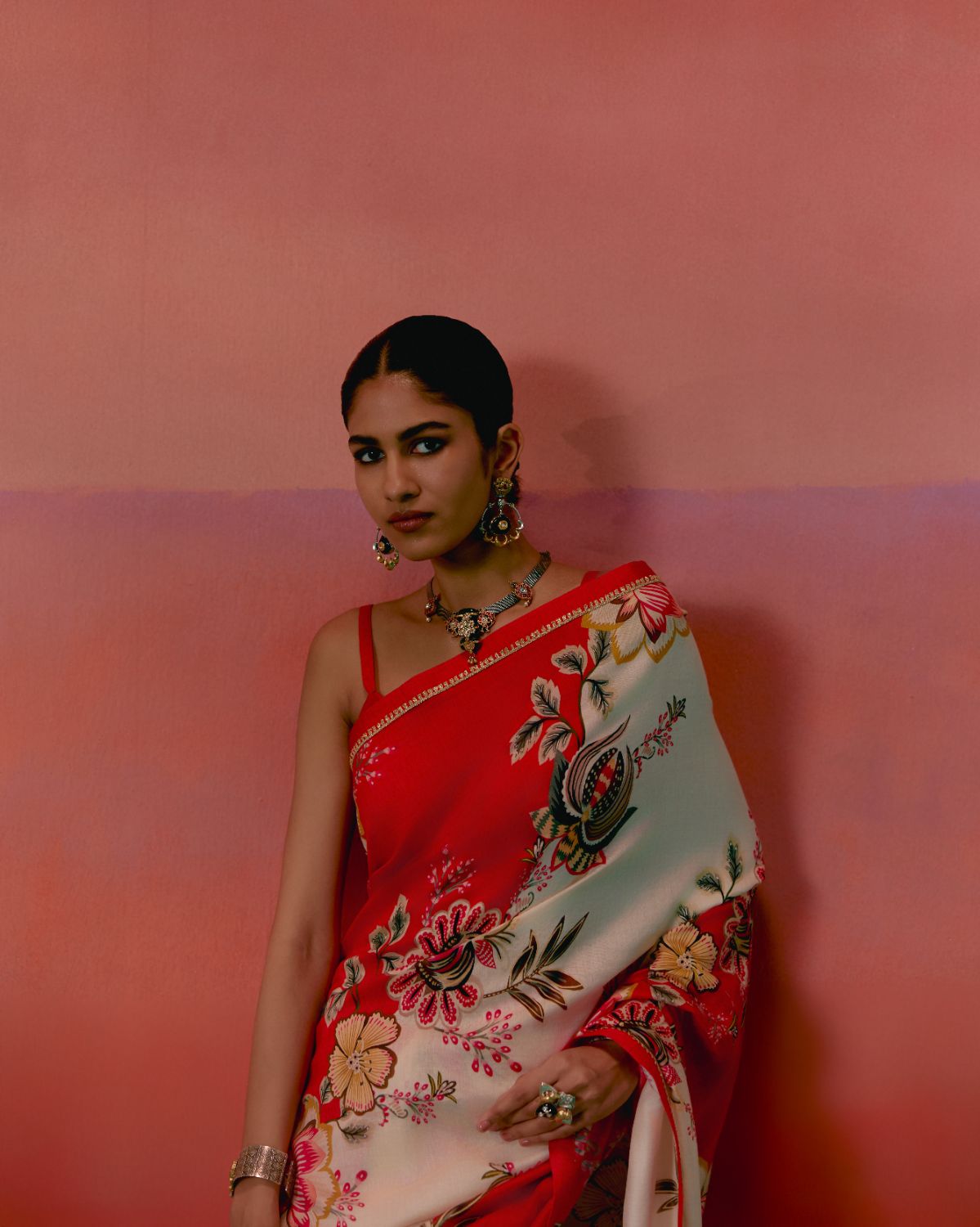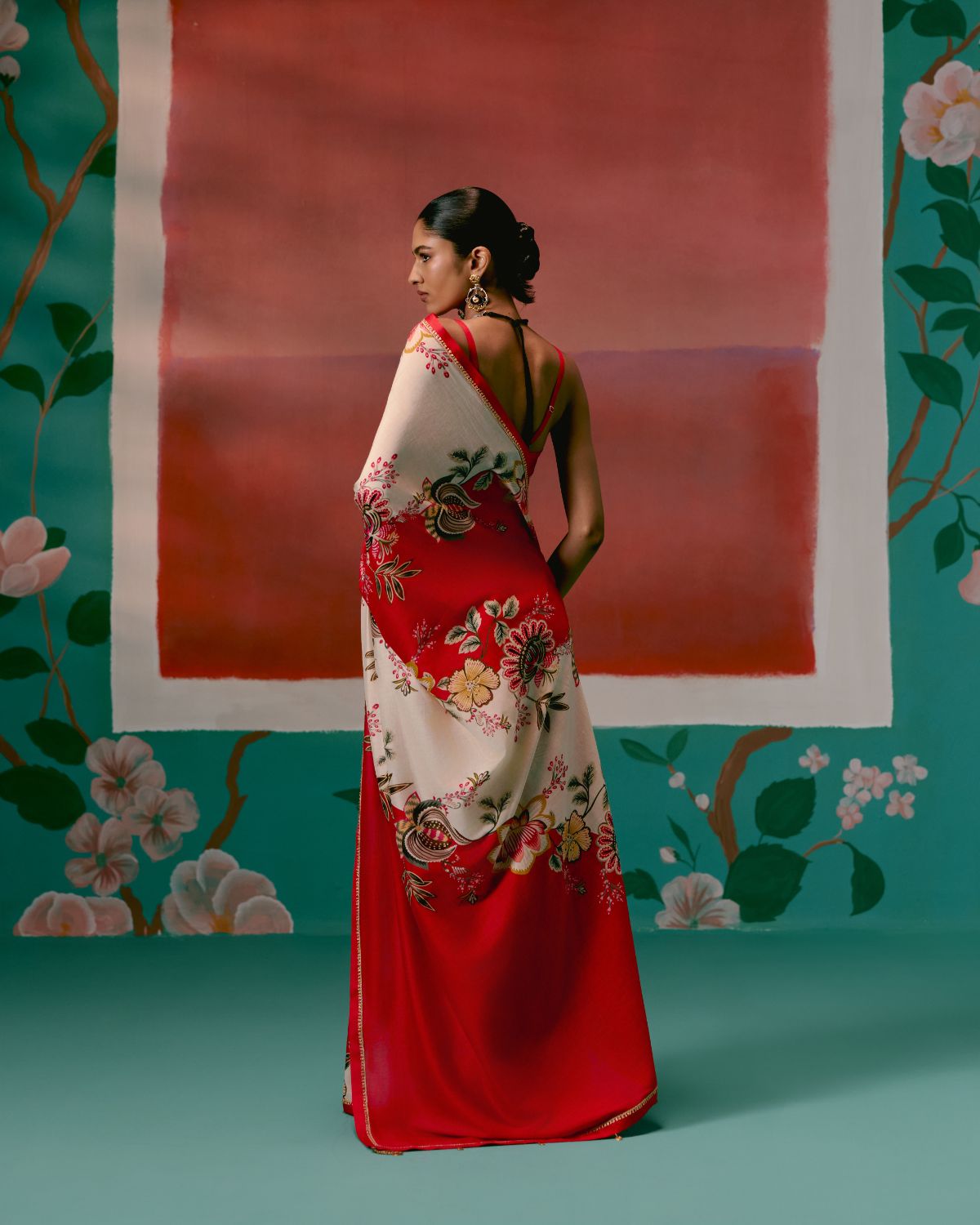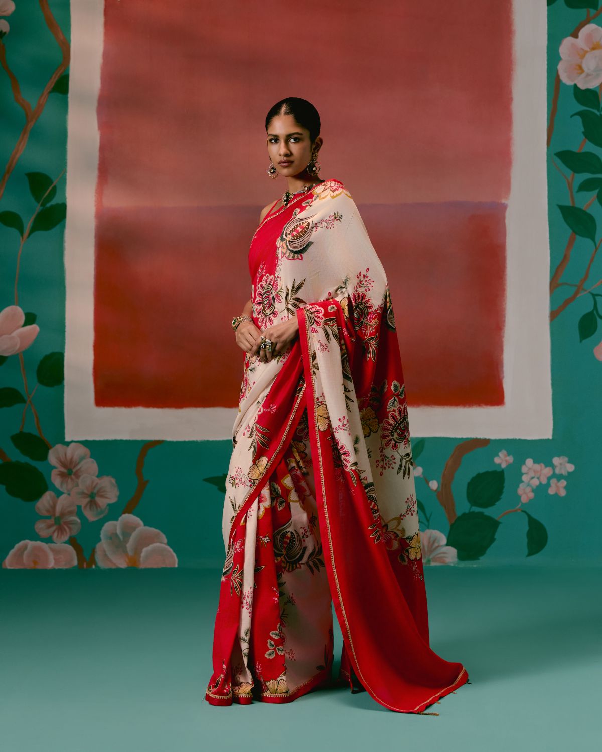 The Ecru & Red Floral saree features an ecru base brought to life with striking red floral motifs that lend it a timeless yet festive appeal. Lightweight and fluid, it drapes with ease, while the pallu is finished with handcrafted tassels that add a playful, artisanal charm.