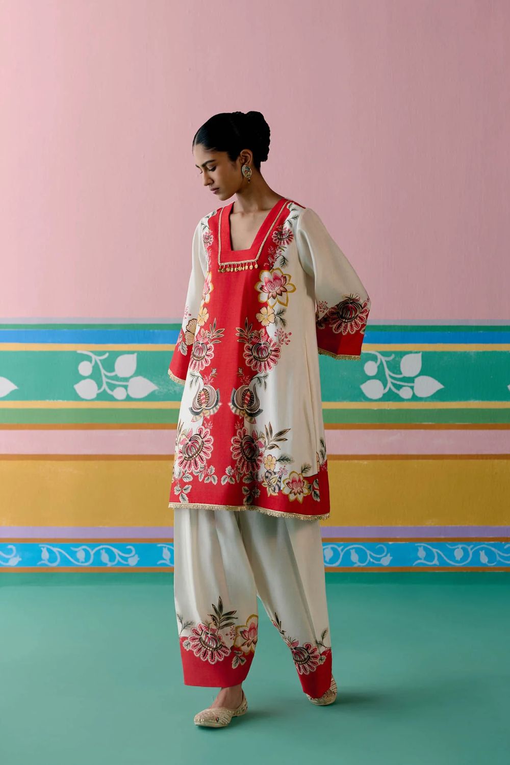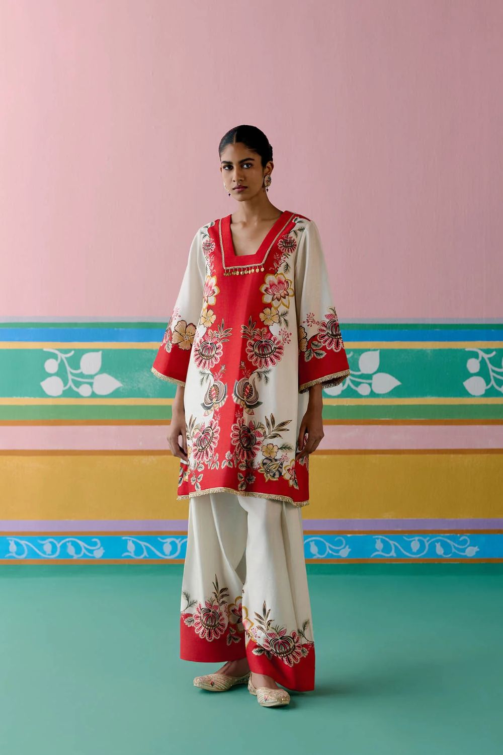 A graceful blend of charm and sophistication, the Ecru & Red Square Neck Kurta Set is designed to elevate your festive style.