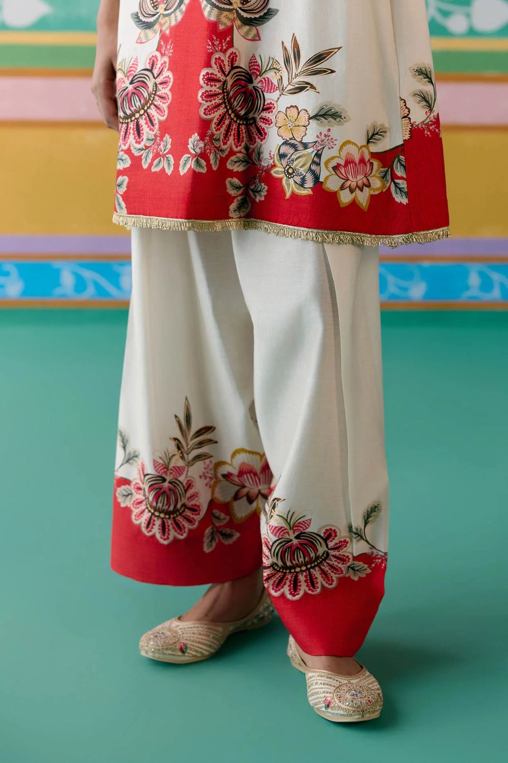 Tailored in airy Chanderi, the kurta is adorned with intricate lace detailing along the neckline, sleeves, and hem, finished with playful tassels for a hint of whimsy. The fully elasticated farsi-style pants offer ease of movement without compromising on elegance—making this set a perfect choice for both daytime festivities and evening soirees.
