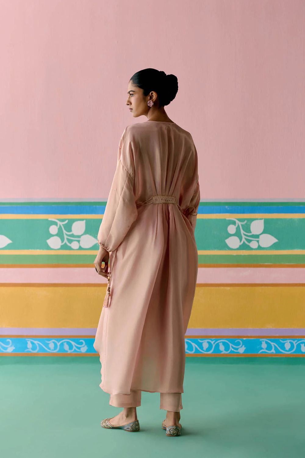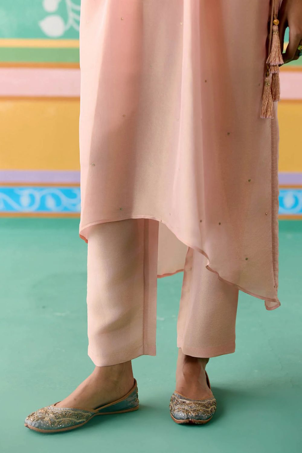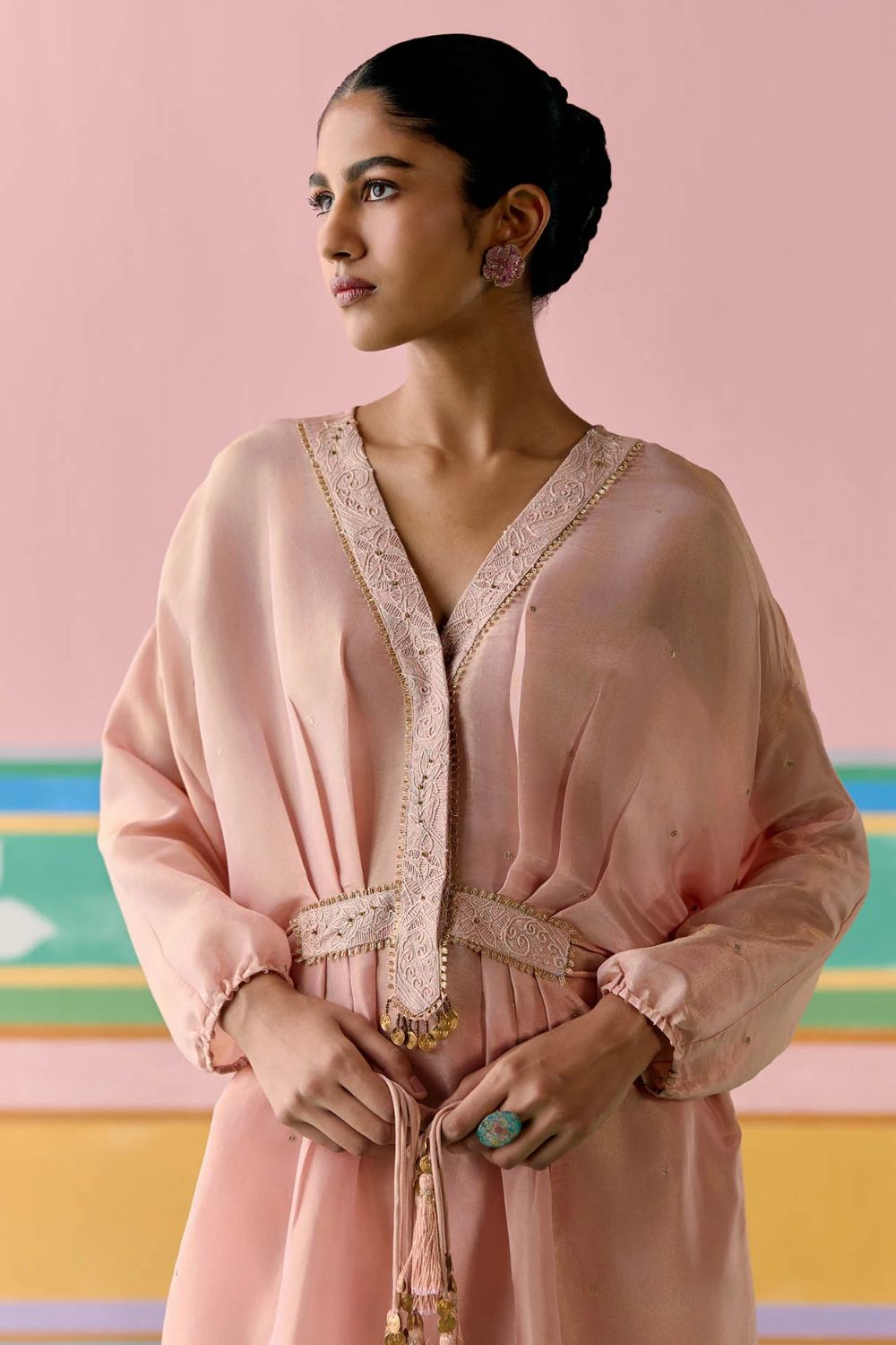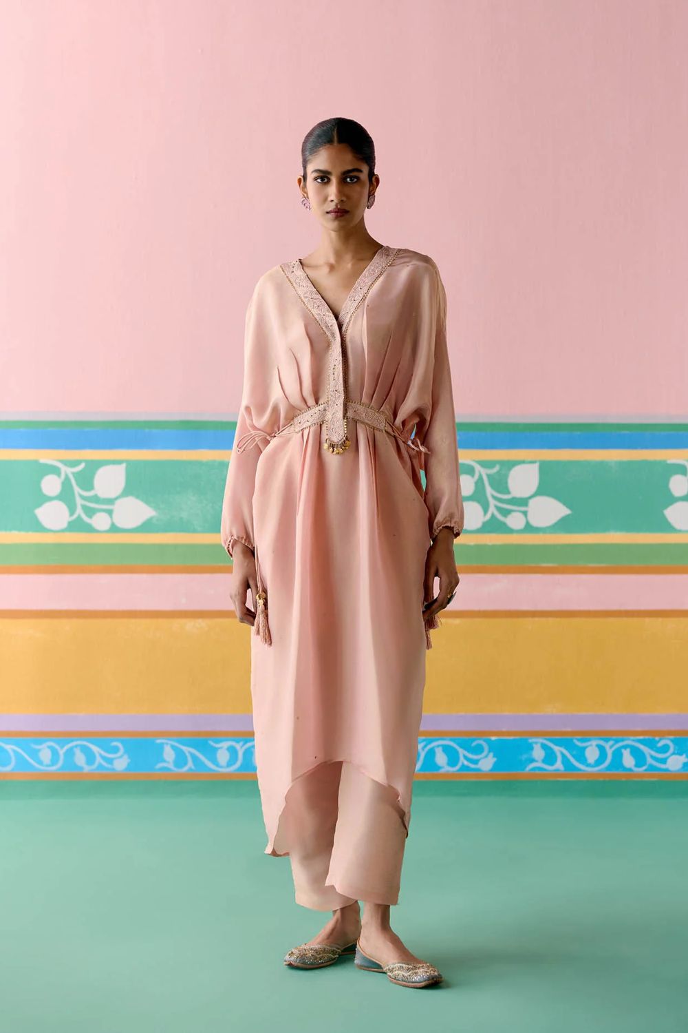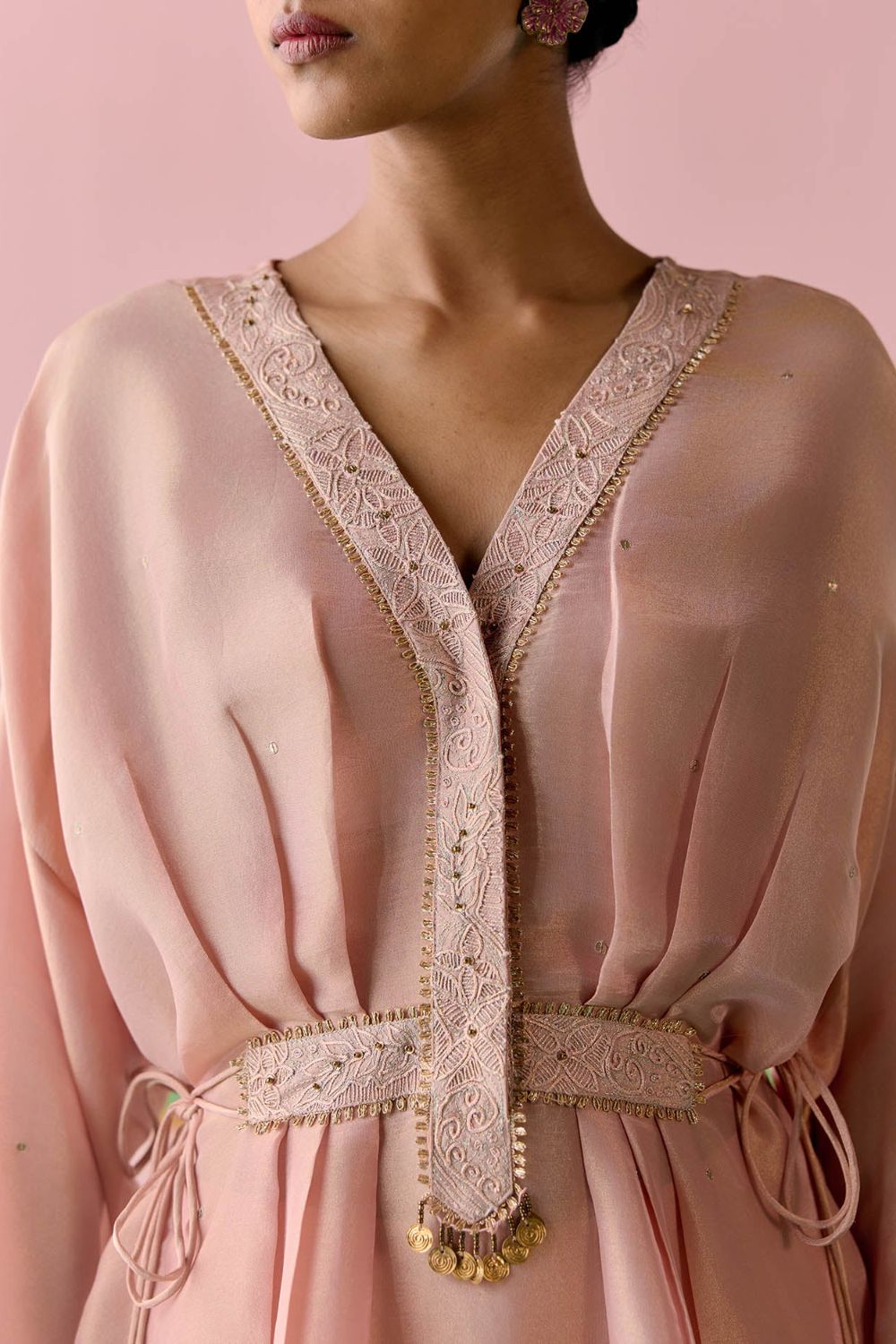 Playful yet poised, the Peach Embroidered Kaftan Set is crafted in luminous Tissue to bring a touch of festive radiance. The kaftan is adorned with all-over sequin work on the front, enhanced with lace inserts and intricate handwork along the neckline and waistband. Dori tie-up details with tassels on the sides lend a charming finish, while elasticated sleeves and pants with an elasticated back ensure comfort with ease. Effortlessly blending sparkle and sophistication, this set is a statement in modern festive dressing.