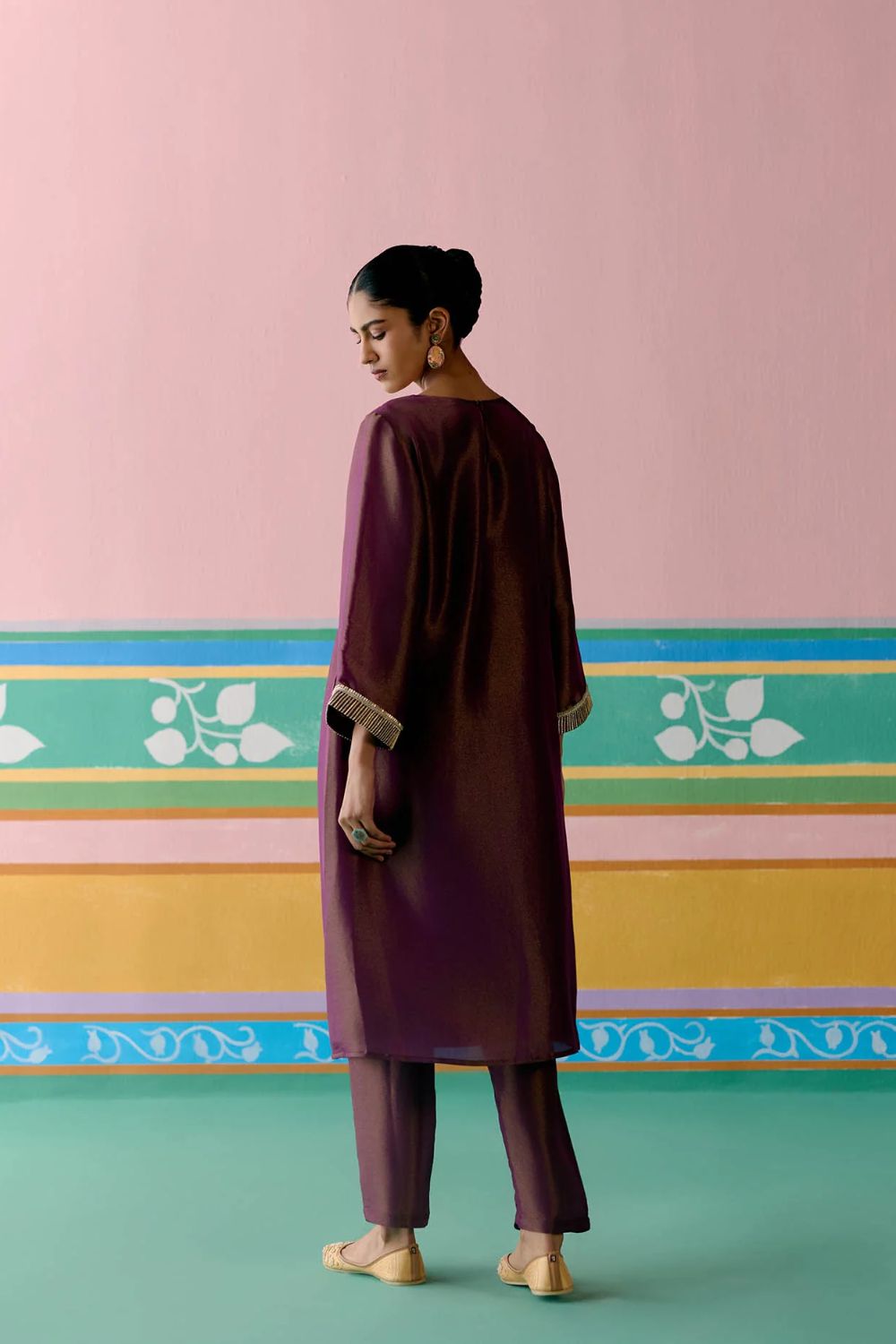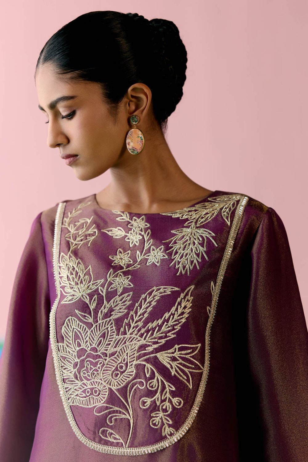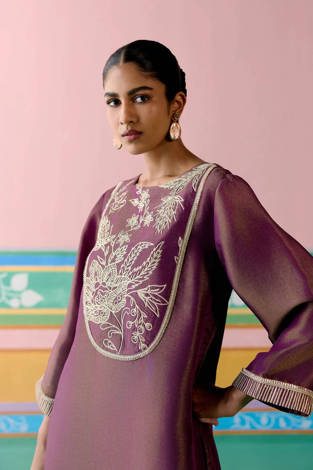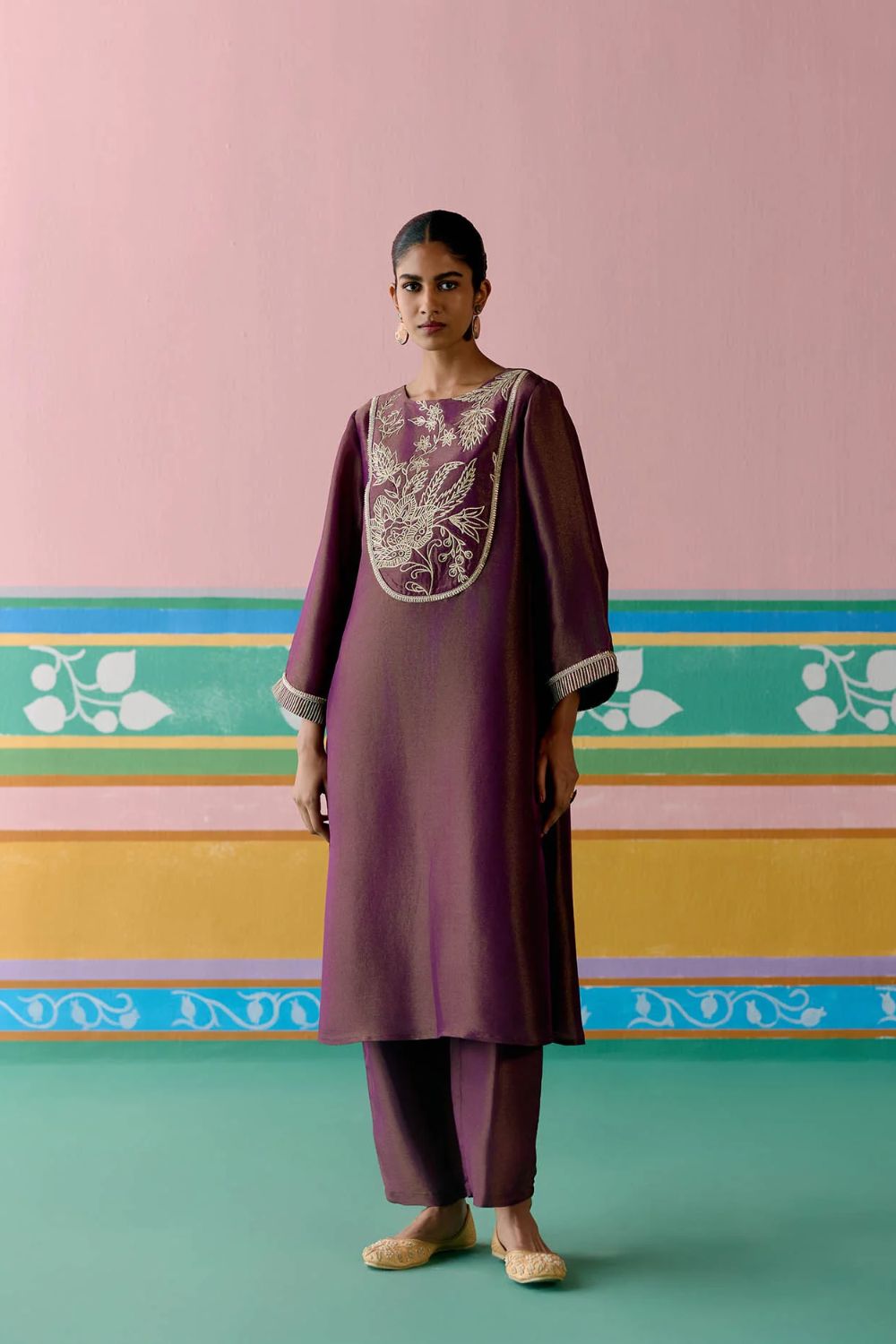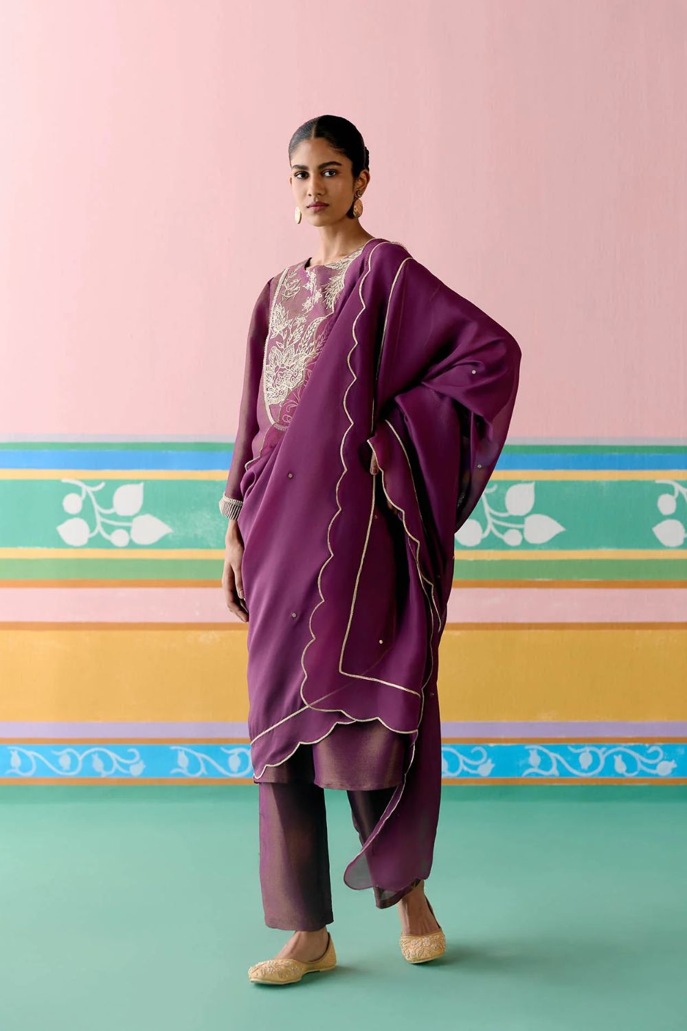 Opulent and refined, the Purple Embroidered Kurta Set is crafted in luminous Tissue for a regal festive appeal. The kurta features an intricately embroidered yoke with metallic handwork and zari, complemented by finely embroidered sleeves for added detail. Paired with pants designed with an elasticated back for effortless comfort, the set is completed with an organza dupatta edged in metallic thread scallops along the hem—bringing together elegance and artistry in perfect harmony.